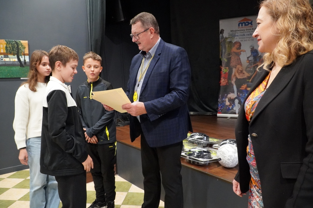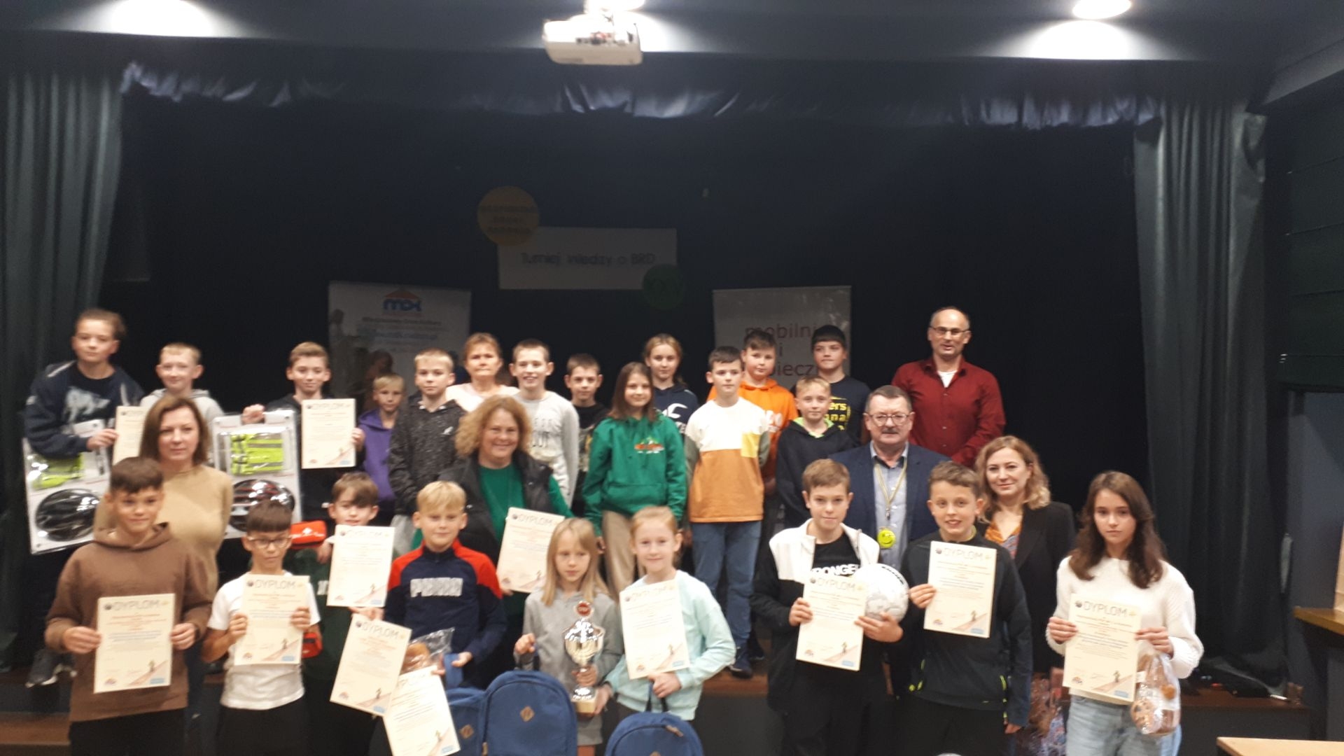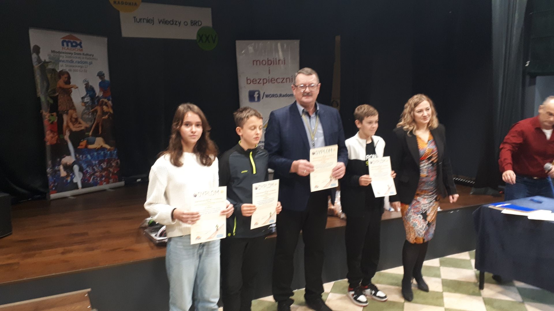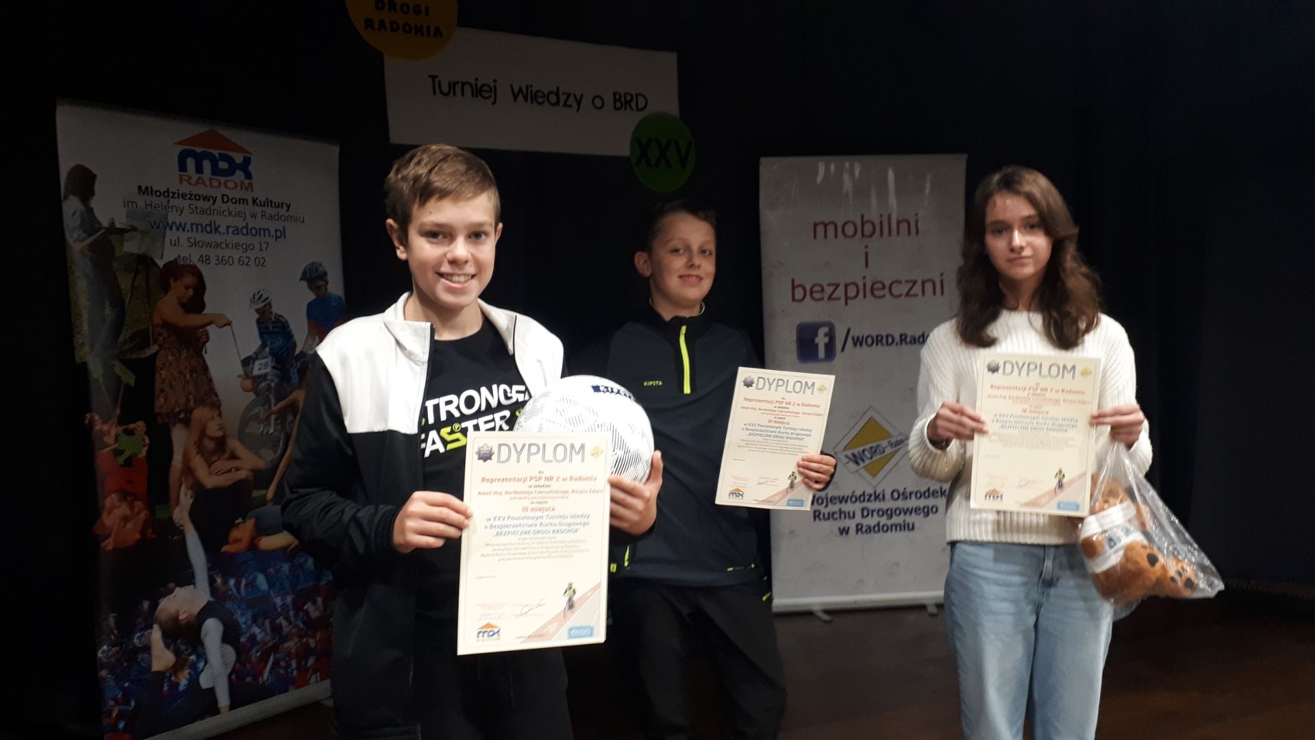 W dniu 20 października w Młodzieżowym Domu Kultury odbyła się XXV edycja Turnieju Wiedzy o Bezpieczeństwie Ruchu Drogowego „Bezpieczne Drogi Radomia”. Zawodnicy reprezentujący naszą szkołę: Amelia Maj z klasy 6c, Bartłomiej Czerwiński z klasy 6b oraz Borys Zając z klasy 6a, musieli w I etapie napisać test wiedzy z przepisów ruchu drogowego, a następnie pokonać na rowerze tor przeszkód składający się z bramki, rynny, pochylni, slalomu stopu/zatrzymania w miejscu. W turnieju wzięło udział 9 drużyn – 27 uczniów. Zawodnicy naszej szkoły zajęli 3 miejsce drużynowo. Otrzymali dyplomy i nagrody, które wręczali Pani Agata Chojnacka – Pyrgiel – kierownik działu artystycznego MDK oraz Pan Zbigniew Mazurkiewicz vicedyrektor WORD w Radomiu.