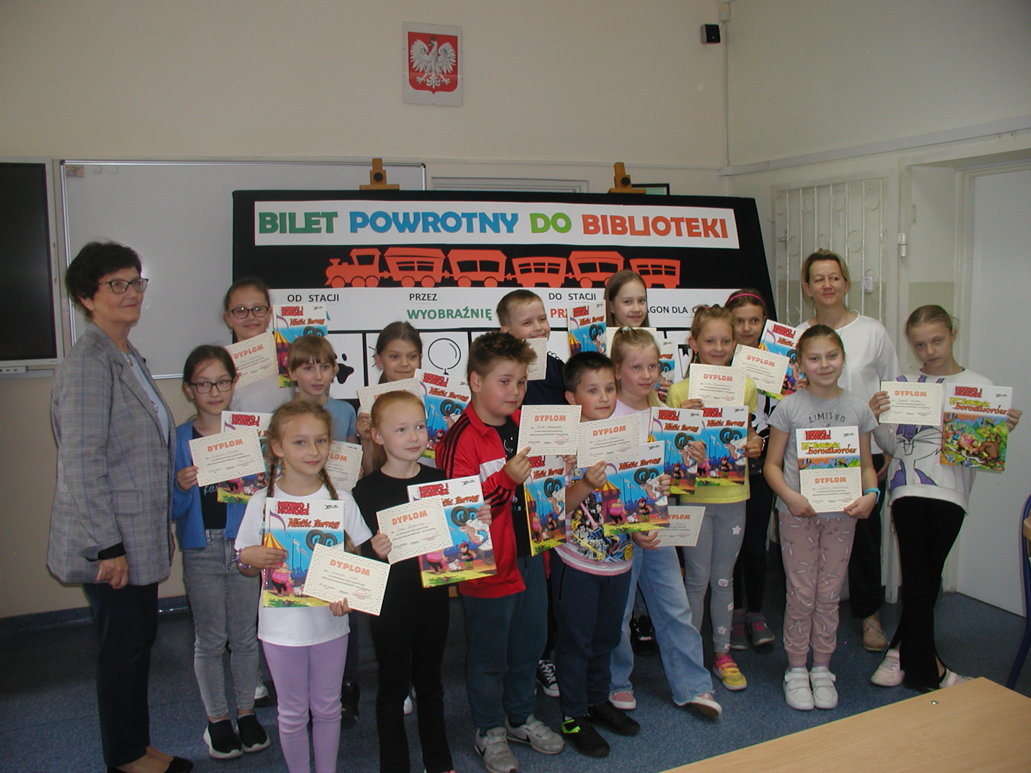 14 czerwca 2023 r. odbyło się podsumowanie akcji czytelniczej „Bilet powrotny do biblioteki”. Najmłodsi czytelnicy z klas 2 i 3 mieli za zadanie przeczytać (od października do maja) książki z 10 kategorii: o zwierzętach, o magii, o sporcie, o przyjaźni, o świecie, komiksowe serie, książka detektywistyczne, lektura szkolna, książka zekranizowana oraz książka, którą komuś polecisz. Uczniowie, którzy ukończyli akcję otrzymali z rąk pani dyrektor Ewy Smardz pamiątkowe dyplomy i nagrody książkowe. Mamy nadzieję, że nie zabraknie im motywacji do udziału w akcji w przyszłym roku, a inni pójdą w ich ślady …