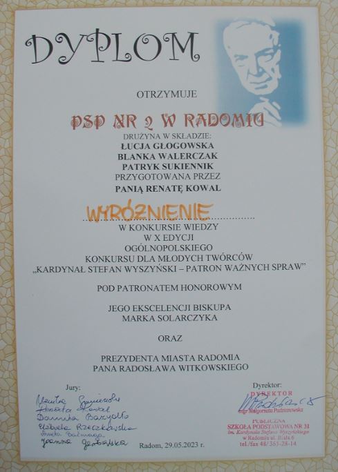 29 maja w Publicznej Szkole Podstawowej nr 31 im. Kardynała Stefana Wyszyńskiego w Radomiu odbyłyby się zmagania drużynowe dotyczące życia i działalności patrona szkoły. Naszą szkołę reprezentował zespół w składzie: Łucja Głogowska, Blanka Waleszczak i Patryk Sukiennik. Motywem przewodnim tegorocznej X edycji Ogólnopolskiego Konkursu Dla Młodych Twórców "Kardynał Stefan Wyszyński - Patron Ważnych Spraw" była podróż. W zadaniach znalazły się miejsca, w których przebywał Kardynał Stefan Wyszyński w czasie swoich studiów naukowych, miejsca internowania, ulubione miejsca wypoczynku, a także historia peregrynacji kopii obrazu Matki Boskiej Częstochowskiej. Po zmaganiach konkursowych odbyła się uroczysta akademia z okazji święta patrona szkoły, na której zostały wręczone dyplomy i nagrody uczestnikom konkursów: literackiego, plastycznego i wiedzy o życiu i działalności Kardynała. Uczniowie naszej szkoły zdobyli wyróżnienie. Gratulujemy!