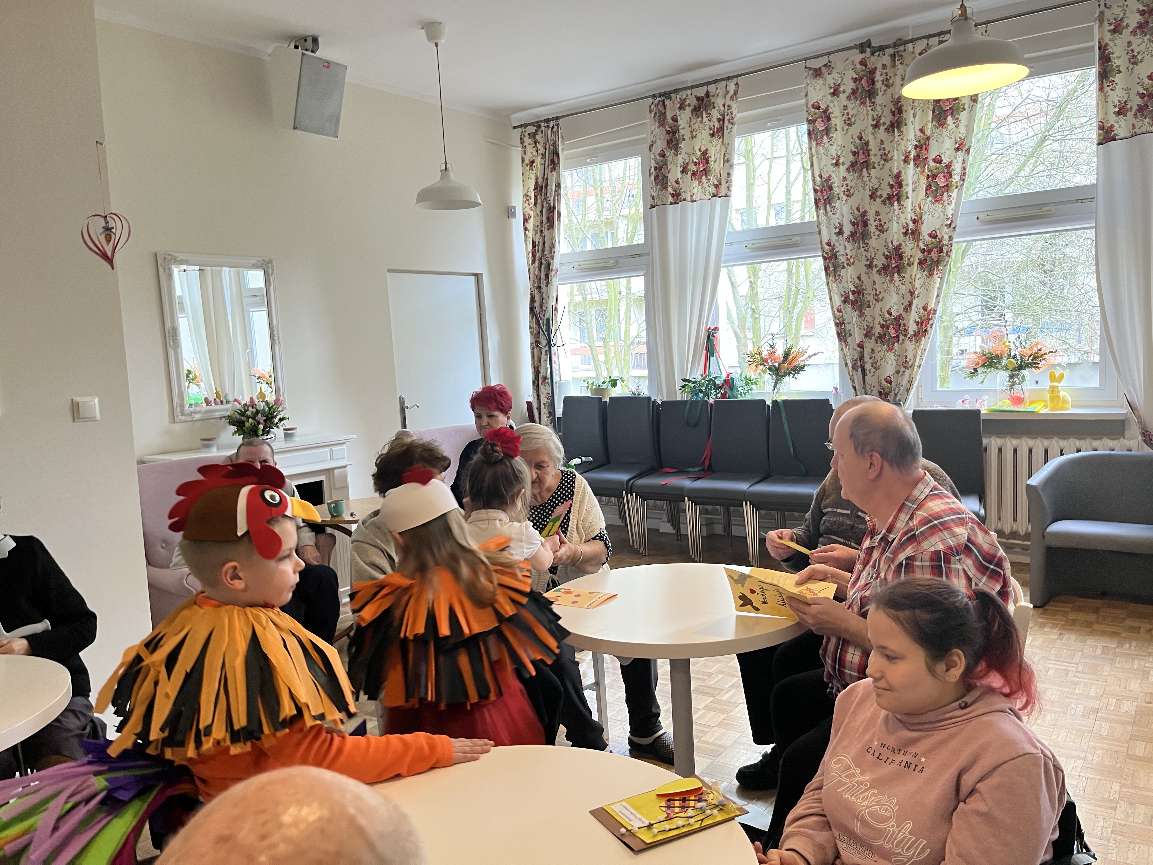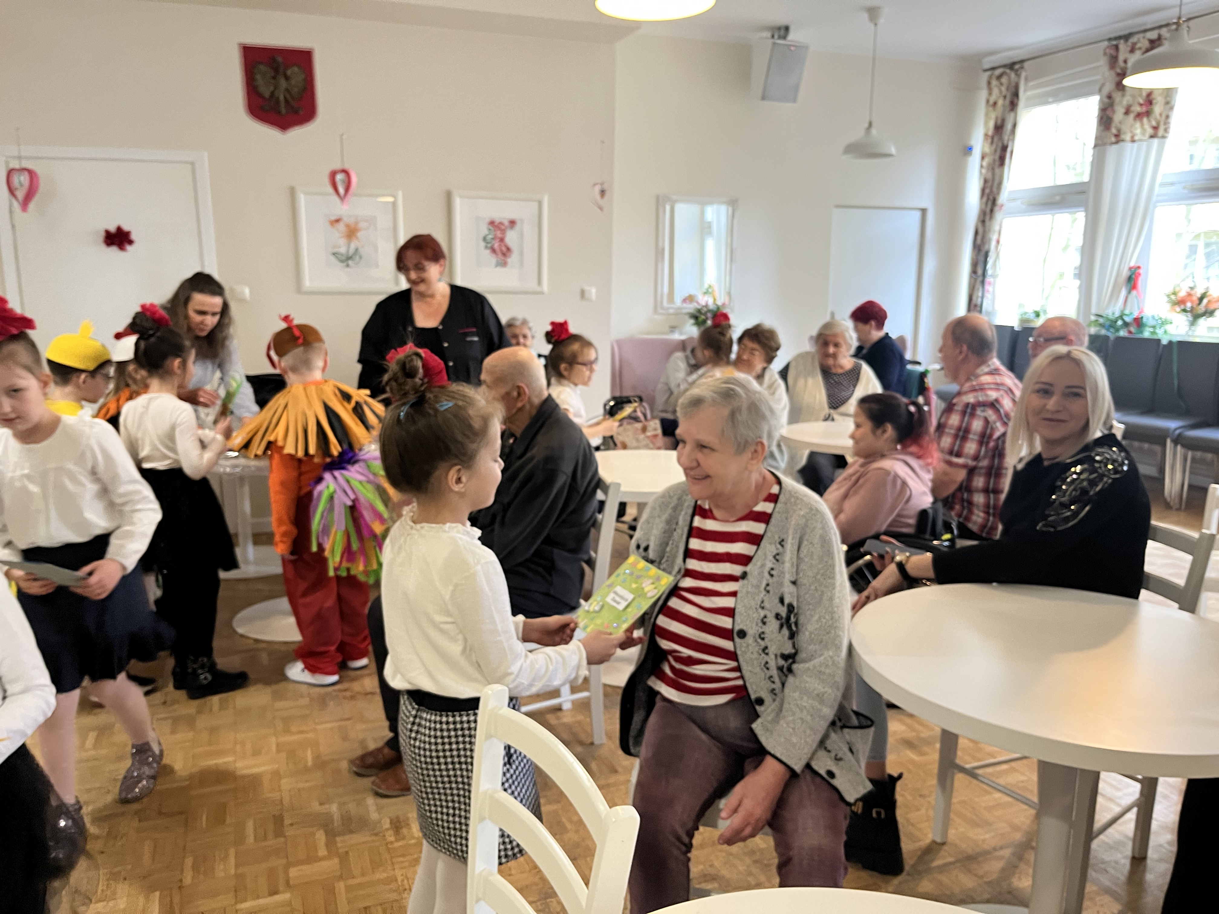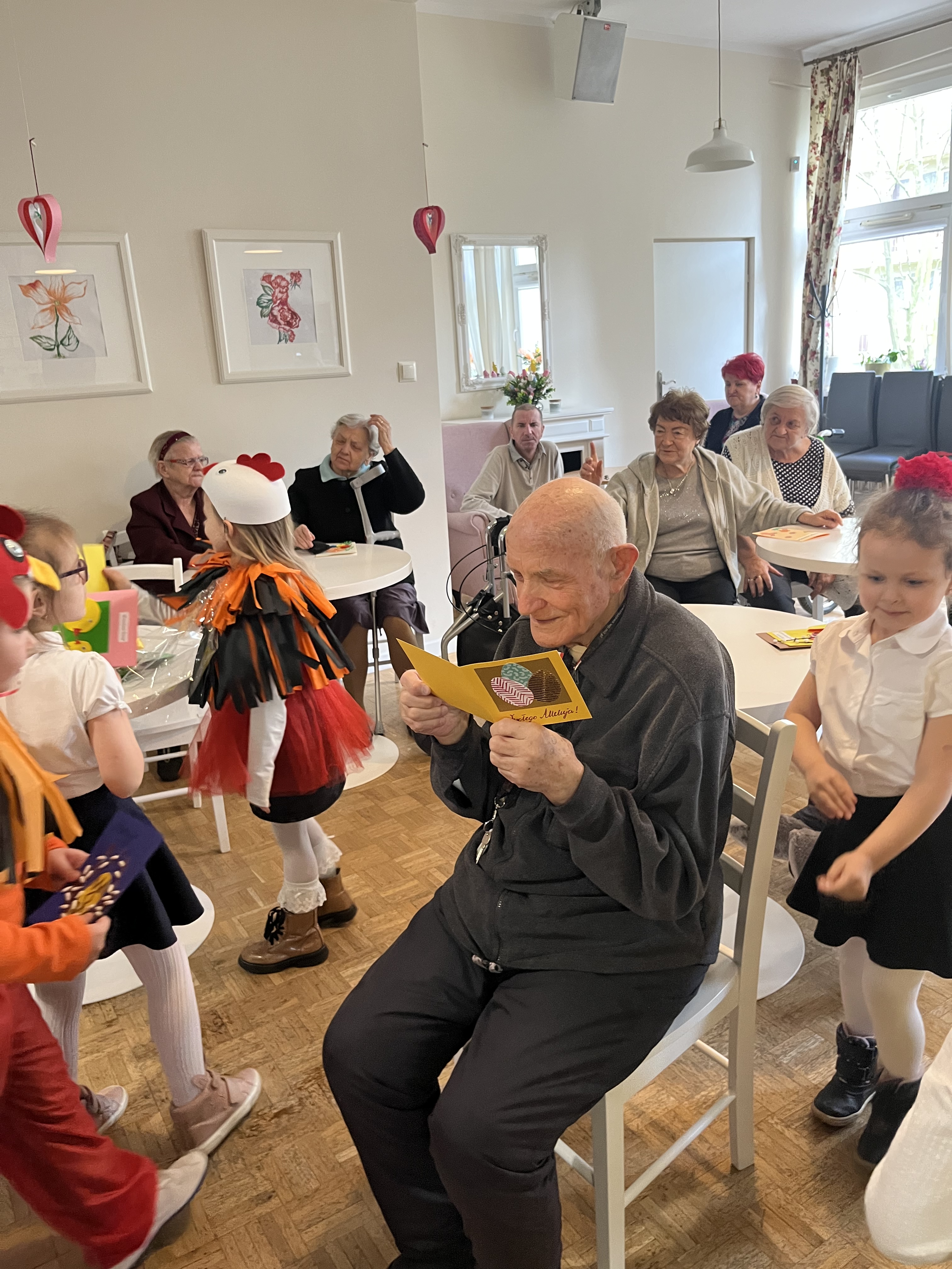 Święta Wielkiej Nocy to wyjątkowy czas spędzany z rodziną. By ten świąteczny czas dla mieszkańców Domu Weterana był pełen domowego ogniska zadbały o to dzieci z zeróweczki. Przywitały się pląsem Serduszko przyjaźni i swoją obecnością wprowadziły w świąteczny nastrój. Życie to najbardziej zdumiewająca bajka tak twierdził Hans Christian Andersen. Dlatego też najmłodsze dzieci naszej szkoły przedstawiły inscenizację własnej bajki pt. Mega jajo oraz zaprezentowały taniec pt. Miłość twa i tym samym wprowadziły atmosferę radości i miłości. Złożenie życzeń oraz wręczenie kart świątecznych wykonanych przez uczniów naszej szkoły pozwoliło poczuć, że nikt nie jest sam i przyniosło nadzieję na lepsze jutro. Pamiętajmy, że: ...żyjemy dla innych, nie dla siebie i pod tym samym niebem.