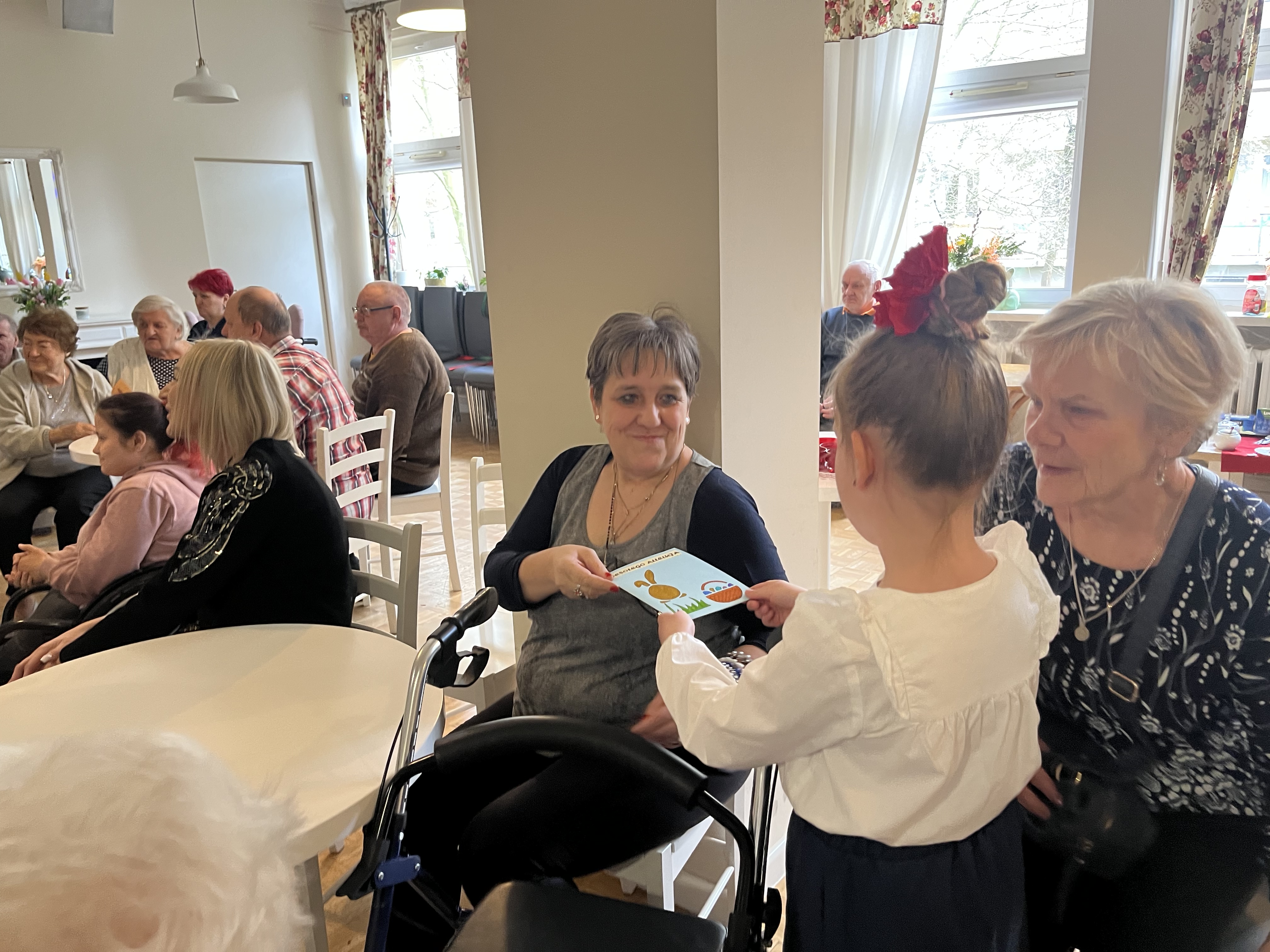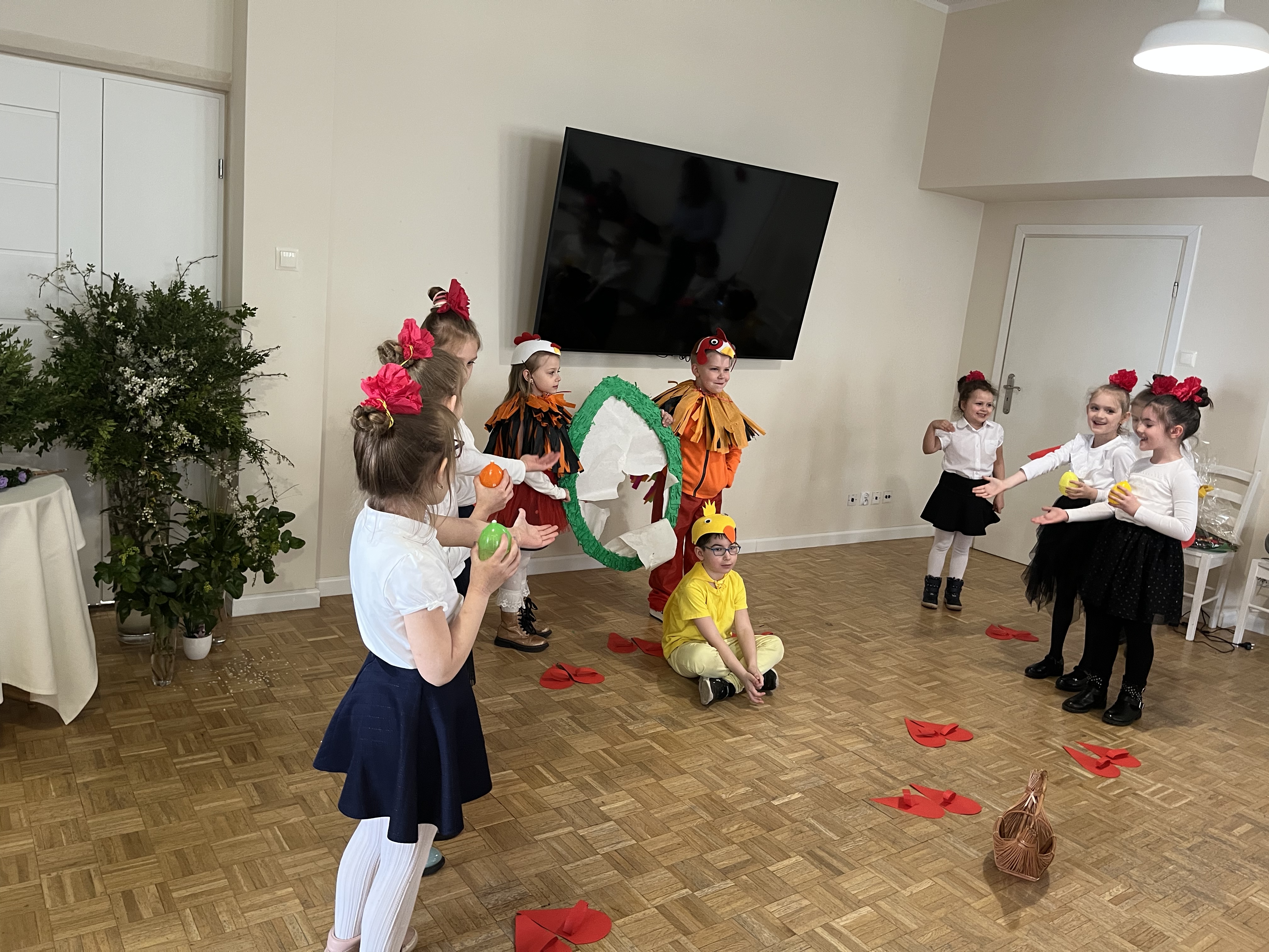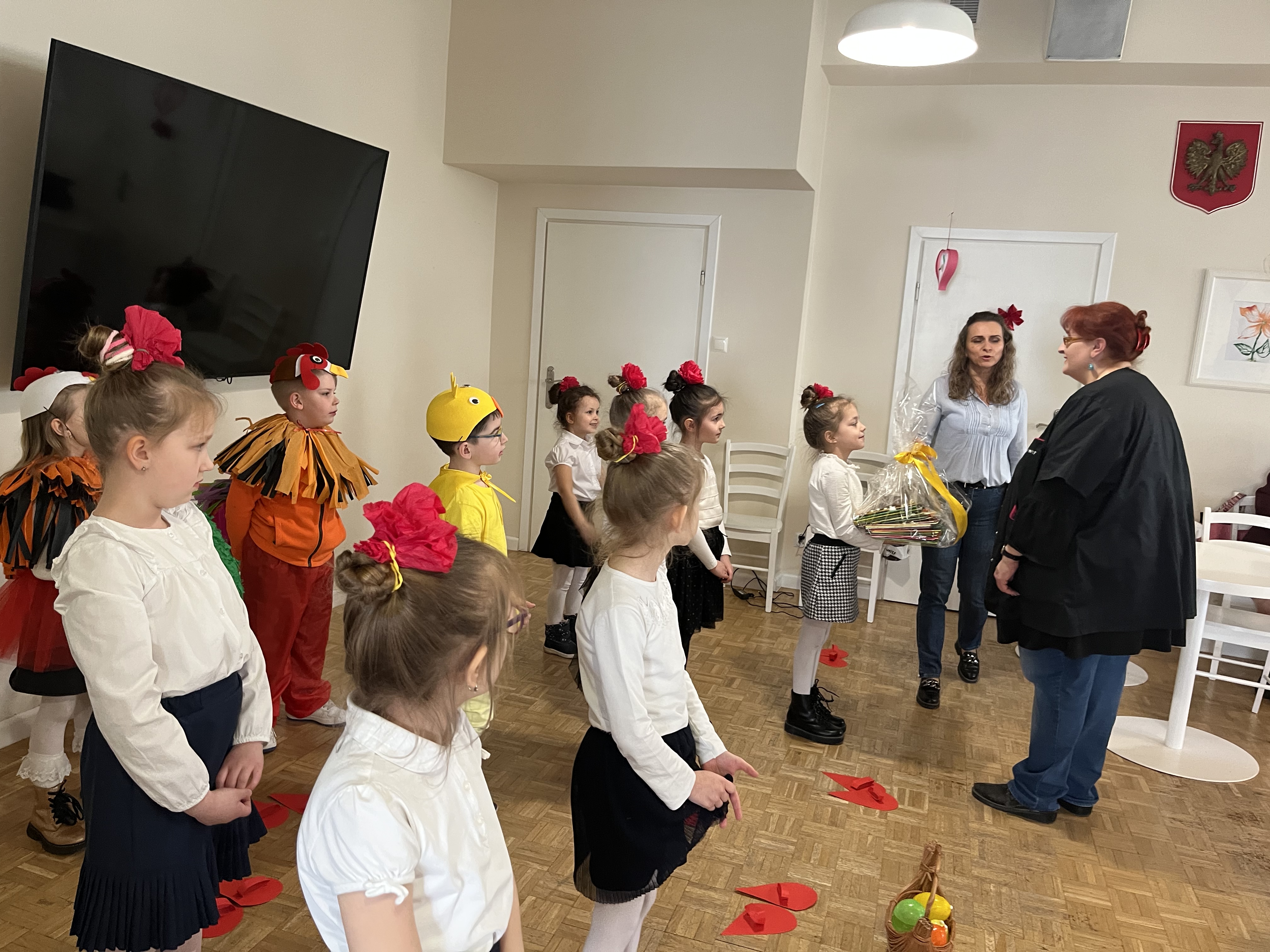 Święta Wielkiej Nocy to wyjątkowy czas spędzany z rodziną. By ten świąteczny czas dla mieszkańców Domu Weterana był pełen domowego ogniska zadbały o to dzieci z zeróweczki. Przywitały się pląsem Serduszko przyjaźni i swoją obecnością wprowadziły w świąteczny nastrój. Życie to najbardziej zdumiewająca bajka tak twierdził Hans Christian Andersen. Dlatego też najmłodsze dzieci naszej szkoły przedstawiły inscenizację własnej bajki pt. Mega jajo oraz zaprezentowały taniec pt. Miłość twa i tym samym wprowadziły atmosferę radości i miłości. Złożenie życzeń oraz wręczenie kart świątecznych wykonanych przez uczniów naszej szkoły pozwoliło poczuć, że nikt nie jest sam i przyniosło nadzieję na lepsze jutro. Pamiętajmy, że: ...żyjemy dla innych, nie dla siebie i pod tym samym niebem.