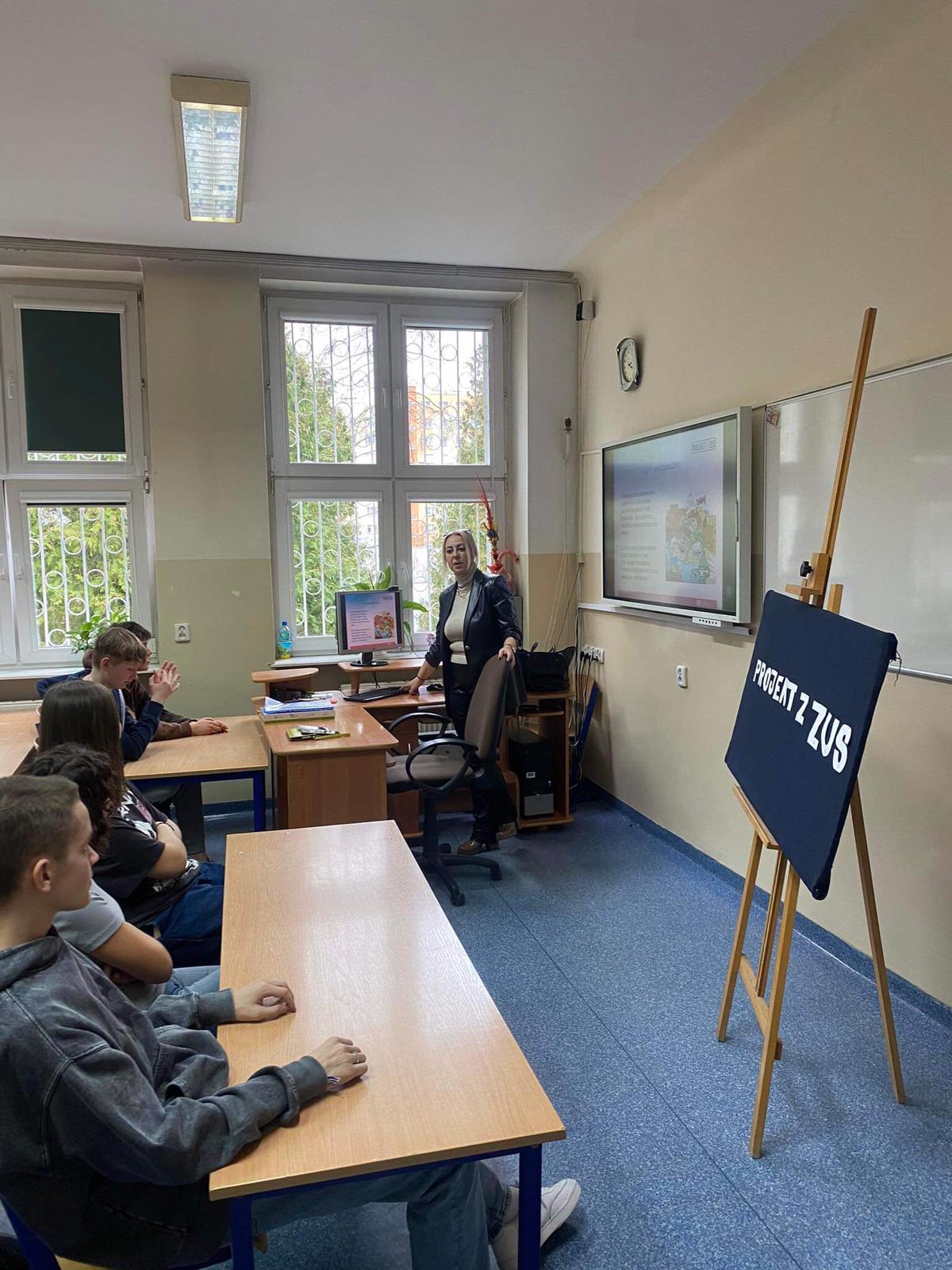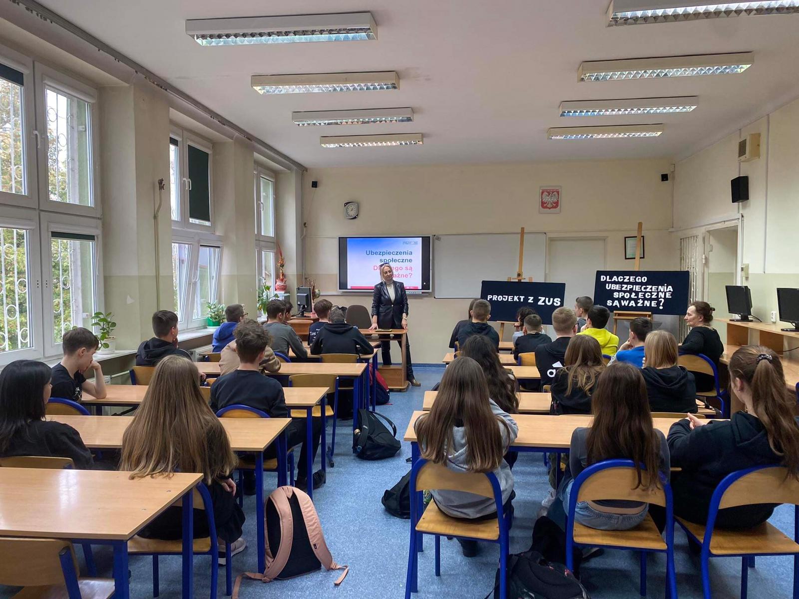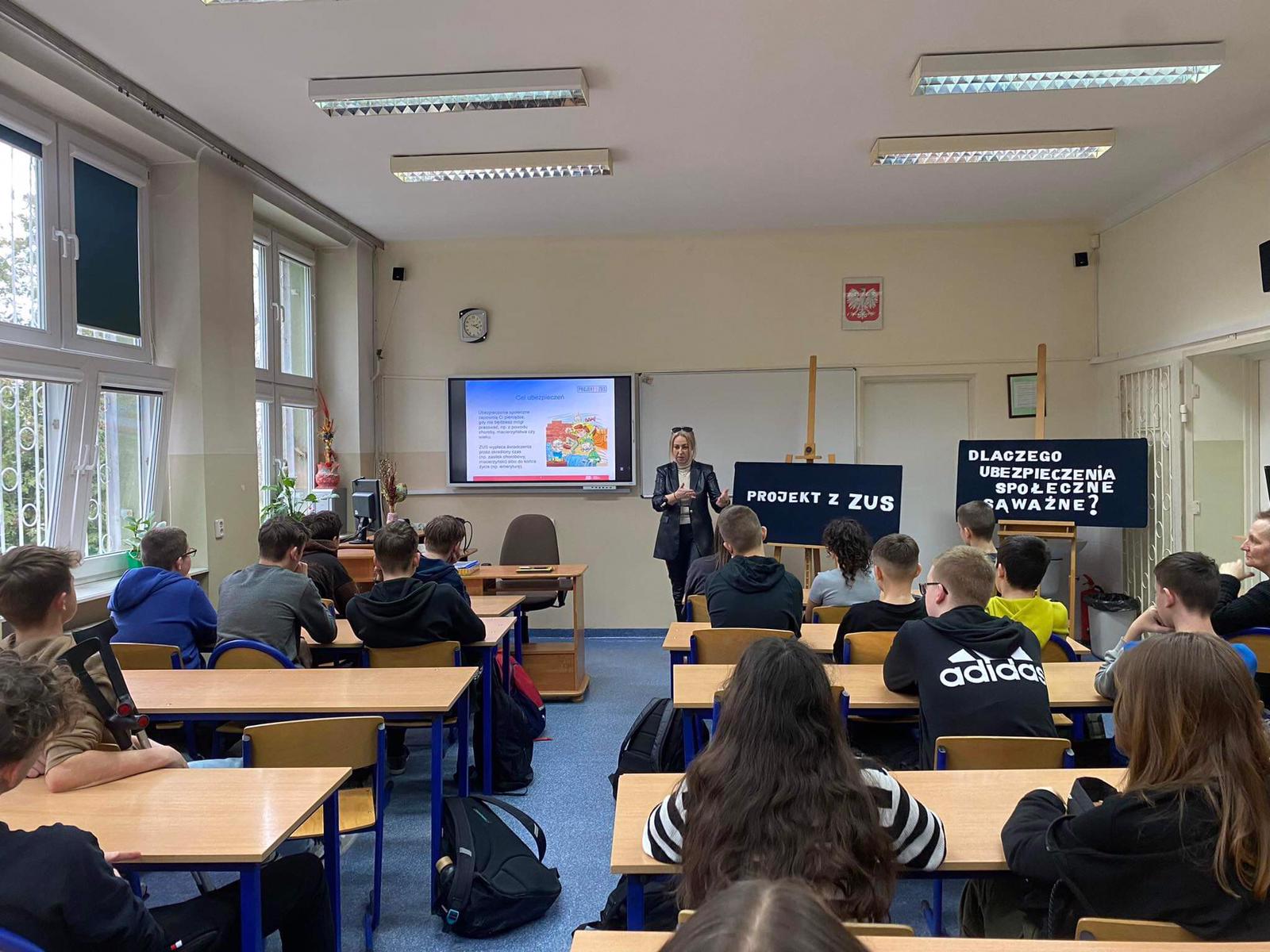 W dniu 04 kwietnia 2023 r. odbyły się zajęcia uczniów klas 8 z pracownikiem Zakładu Ubezpieczeń Społecznych panią Edytą Kępką. W trakcie spotkania zostały przedstawione założenia Projektu z ZUS- „Dlaczego ubezpieczenia społeczne są ważne?”, którego celem jest upowszechnienie wiedzy o ubezpieczeniach społecznych wśród uczniów. Podczas zajęć uczniowie zapoznali się z najważniejszymi informacjami o ubezpieczeniach społecznych w Polsce i przekonali się, jak mądra i przewidująca różne zdarzenia losowe jest to idea. Zadaniem uczestników Projektu z ZUS jest wykonanie materiału wyjaśniającego i promującego, dlaczego ubezpieczenia społeczne są ważne, w formie plakatu, komiksu lub filmu. Zachęcamy wszystkich uczniów do udziału w projekcie!