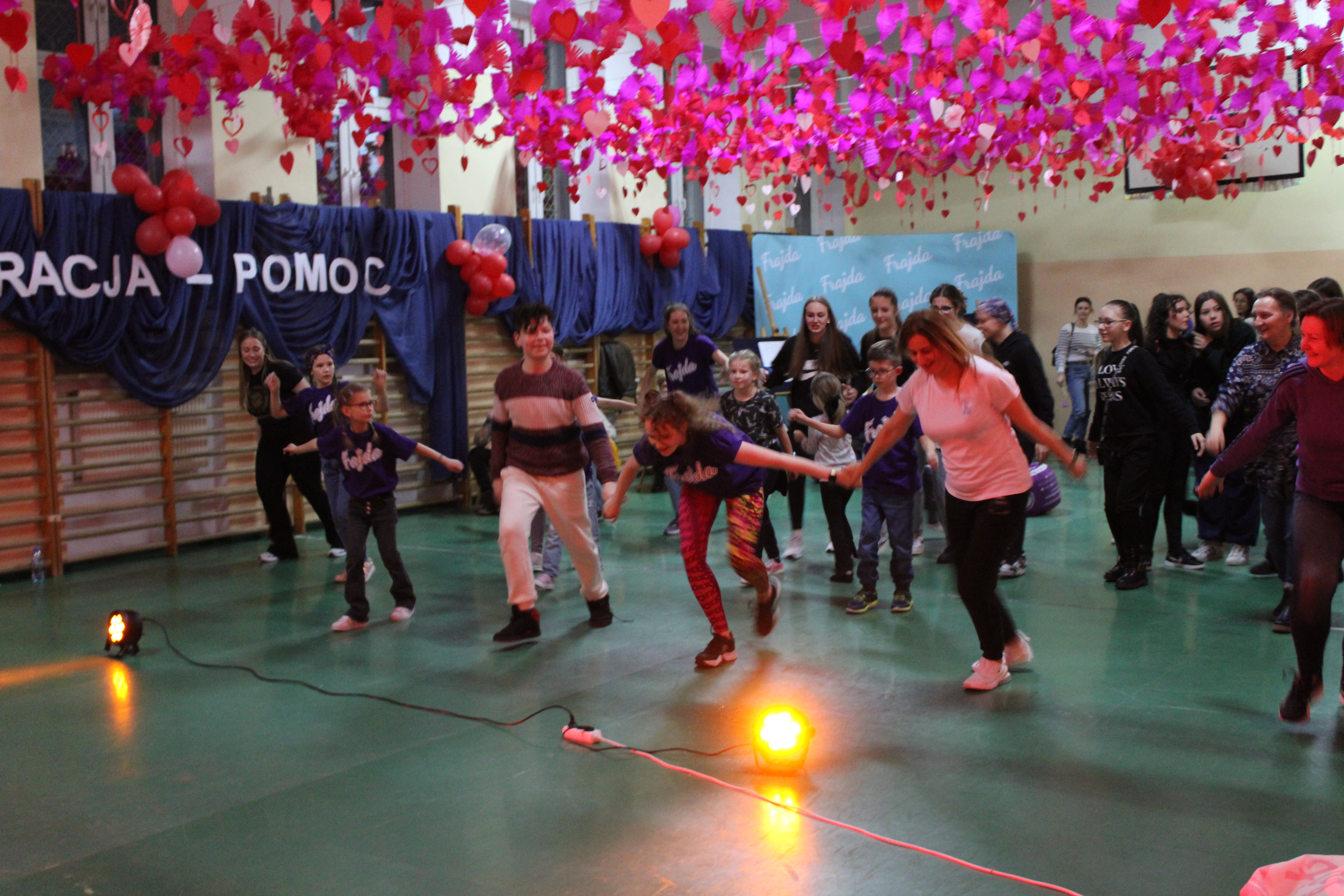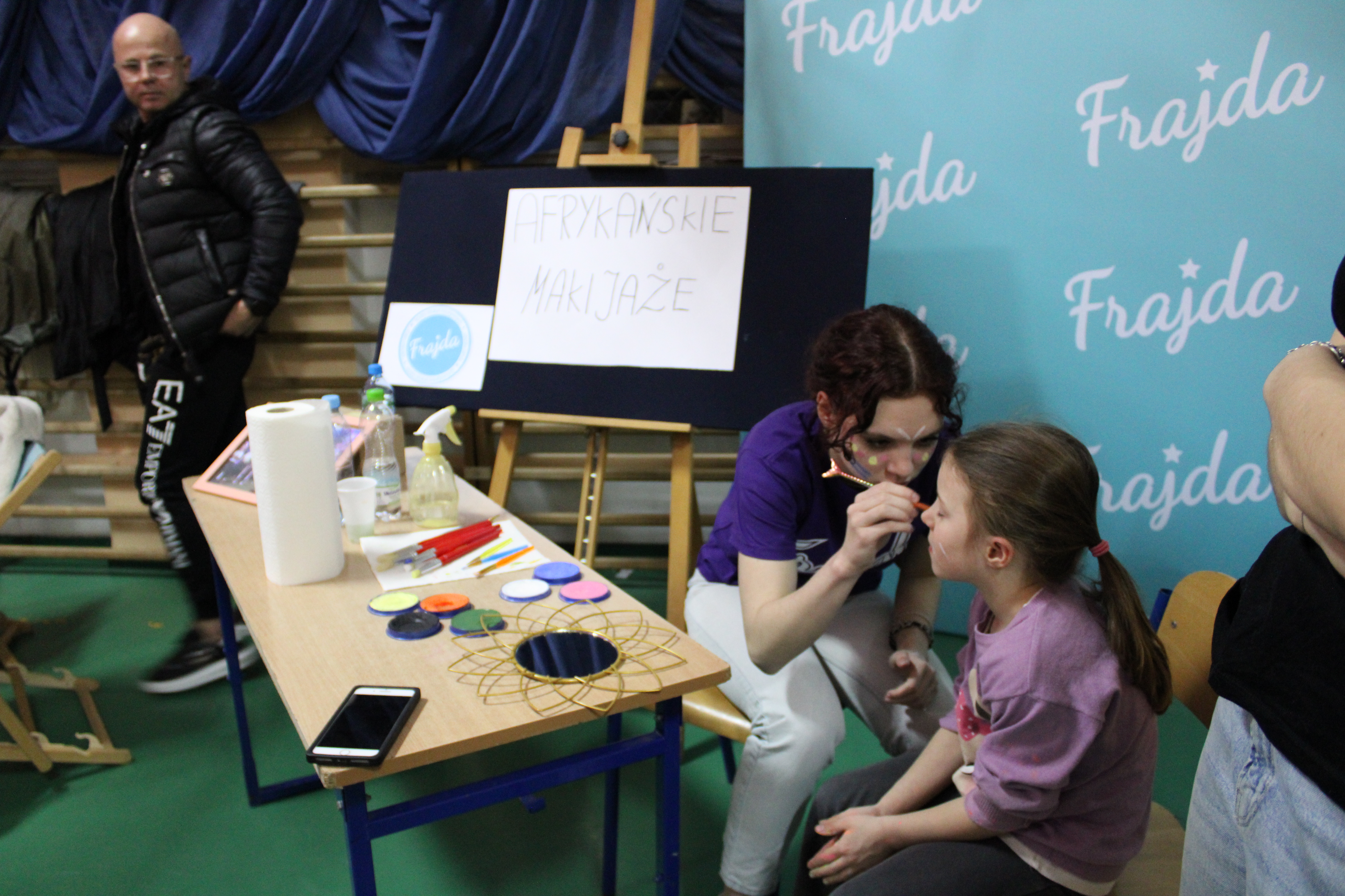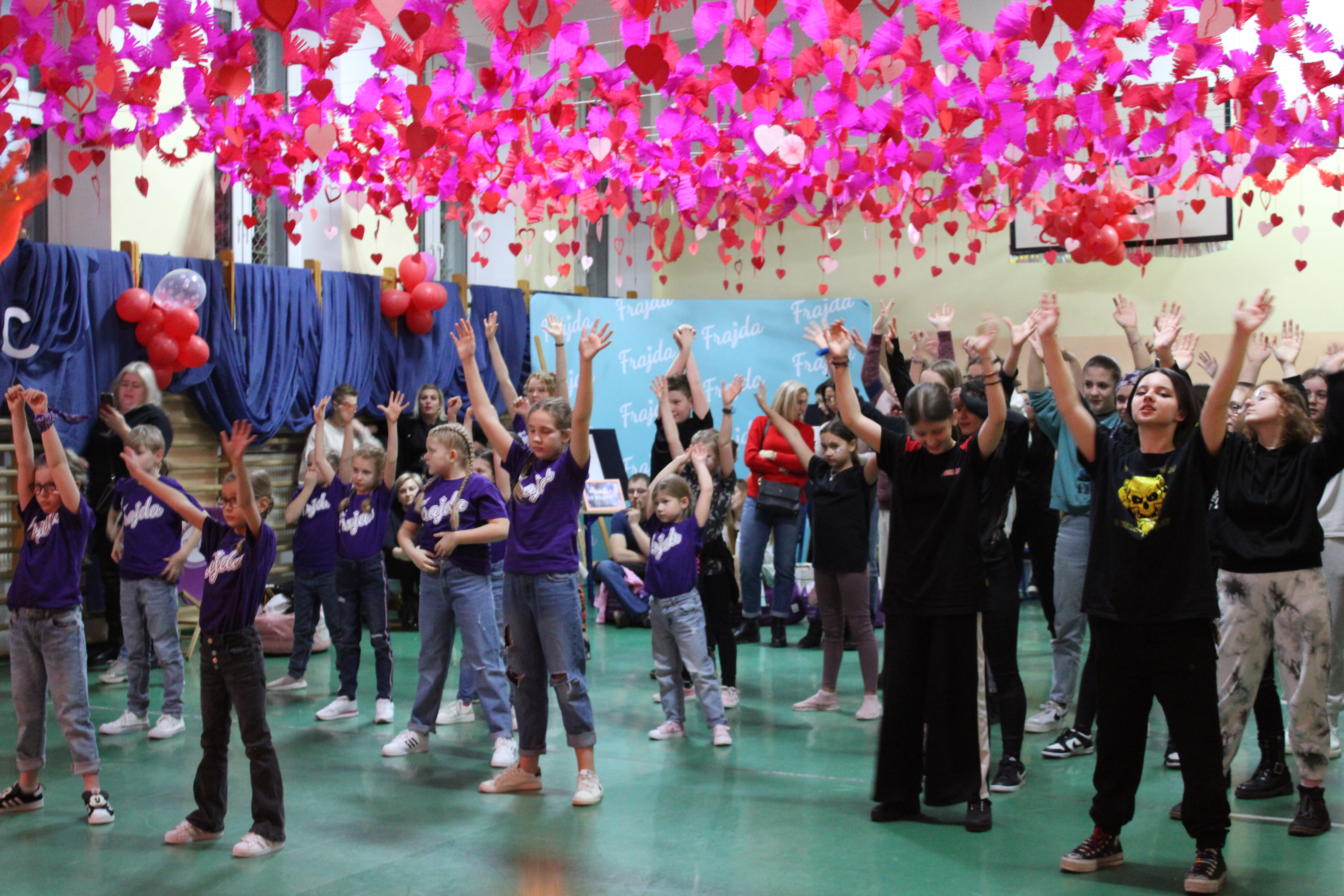 Dzięki współpracy z kreatywną szkołą tańca FRAJDA oraz zespołem gimnastyki artystycznej GimArt w dniu 10 lutego 2023 roku w naszej szkole odbyło się TANECZNE SPOTKANIE Z FRAJDĄ pod hasłem SPORT - INTEGRACJA - POMOC. Każdy z uczestników spotkania mógł przekazać wybraną kwotę do puszki, z której dochód został przeznaczony na projekt UNICEF „Na ratunek dzieciom w Rogu Afryki”. Młodzież Samorządu Uczniowskiego oraz Szkolnego Koła UNICEF opracowała plakaty, przygotowała dekoracje na spotkanie oraz zorganizowała aukcję GALERIA RZECZY ŁADNYCH. Podczas tanecznego spotkania można było odbyć podróż na CZARNY LĄD z instruktorkami FRAJDY. Była również ZUMBA dla małych i dużych, warsztaty manualne - Wyczaruj Kija Mocy. Chętnym uczestnikom spotkania instruktorzy FRAJDY zrobili piękne afrykańskie makijaże. Był również pokaz fantastycznego tańca FRAJDA SQUAD oraz pokaz gimnastyczki artystycznej zespołu GimArt. Bardzo dziękujemy wszystkim, którzy włączyli się w działania naszego projektu, a szczególnie kreatywnej szkole tańca FRAJDA i zespołowi gimnastyki artystycznej gimArt. Dziękujemy również rodzicom, pracownikom szkoły oraz uczniom za przygotowanie pięknych darów, które zostały wystawione w GALERII RZECZY ŁADNYCH.