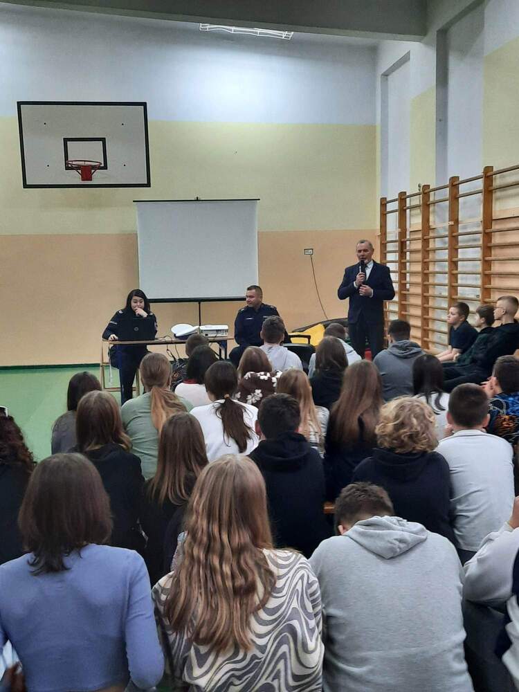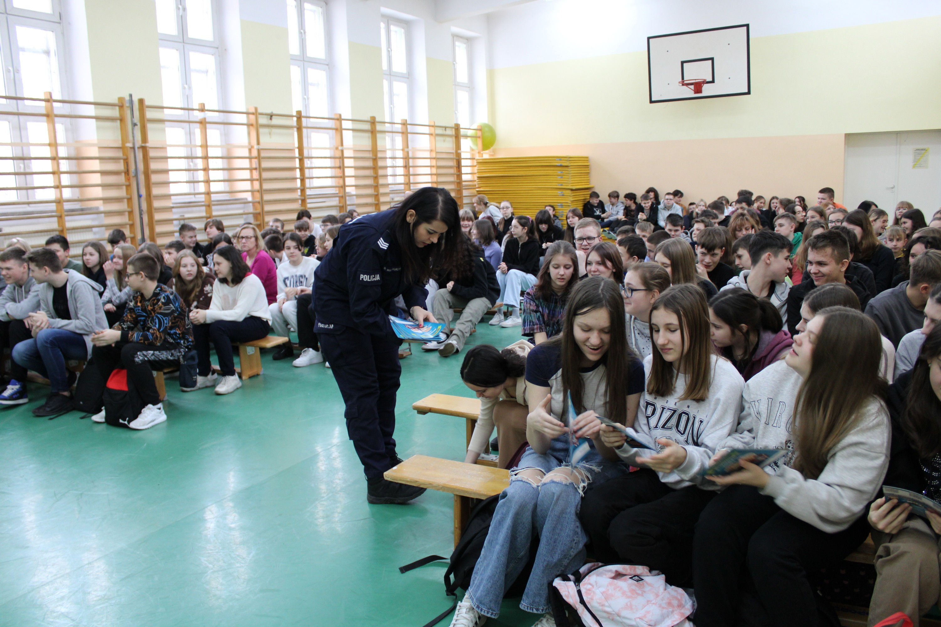 W dniu 30 stycznia 2023 roku odbyło się spotkanie z Policjantami z Wydziału Ruchu Drogowego Komendy Miejskiej Policji w Radomiu dla uczniów klas 6-8. Tematem prelekcji było „Bezpieczeństwo w ruchu drogowym i podczas ferii zimowych”. Uczniowie zostali zapoznani z bezpieczeństwem na drodze m.in. zachowaniem pieszych po zmroku, zaletach noszenia elementów odblaskowych, o nowych przepisach w ruchu drogowym dotyczących zachowań pieszych „SMARTSTOP – PATRZ NA DROGĘ”. Uczestnicy zostali poinformowani o konsekwencjach wynikających z nieprzestrzegania przepisów prawa ruchu drogowego.