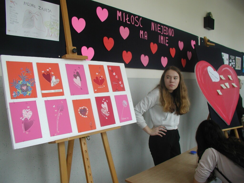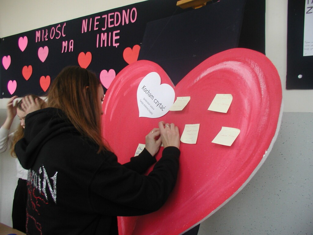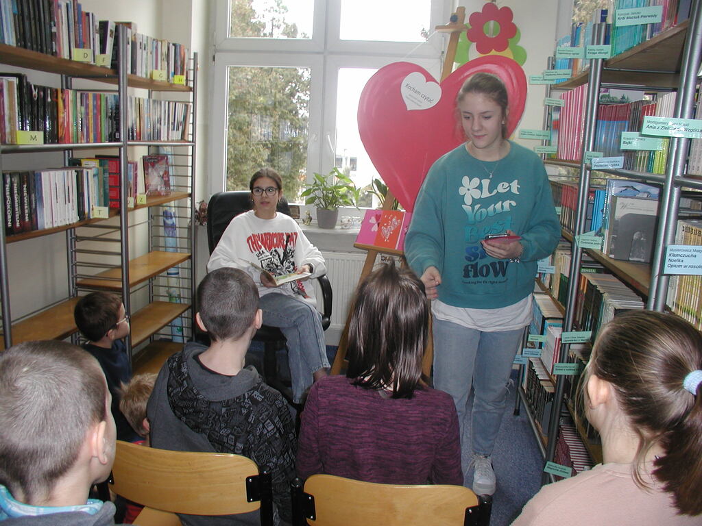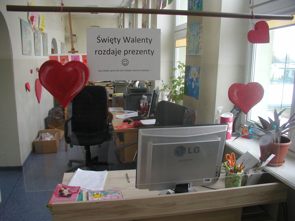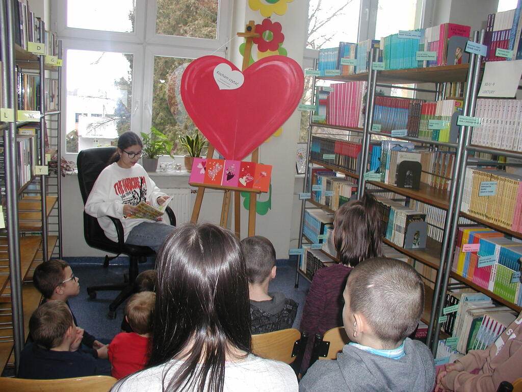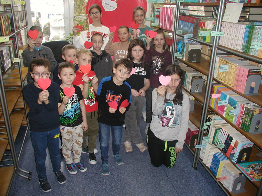 10 lutego, aby uczcić Dzień Zakochanych w naszej bibliotece, zrobiło się iście walentynkowo. W wystroju pomieszczeń królowały serduszka. Uczniowie wypożyczający tego dnia książki otrzymali czekoladki - oczywiście w kształcie serduszka. Kto jeszcze nie zdążył obdarować sympatii „walentynką”, miał okazję nabyć ją w bibliotece. Podczas przerw w umieszczonym na sztaludze wielkim sercu, uczniowie wpisywali tytuły swoich ukochanych książek. Ten dzień był również okazją do głośnego czytania lektur o przyjaźni i miłości np.: "Franklin mówi Kocham Cię”, „Tajemnica miłości” Martina Widmarka. Wszystkim udzielił się walentynkowy nastrój.
