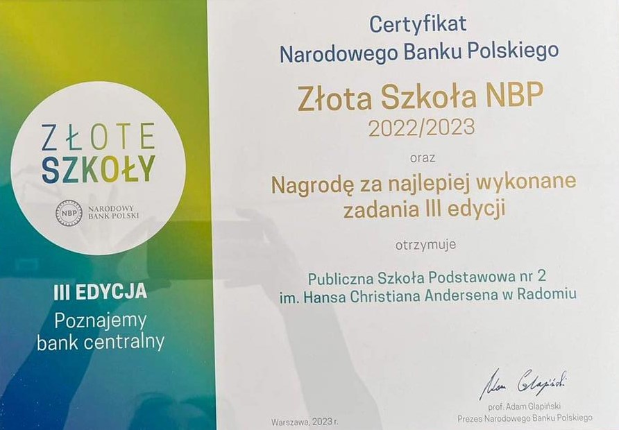 Uczniowie i nauczyciele PSP nr 2 w Radomiu przystąpili w bieżącym roku szkolnym do programu Złote Szkoły NBP- edycja III ogólnopolskiego programu popularyzującego wiedzę ekonomiczną w środowiskach szkolnych, którego organizatorem jest Narodowy Bank Polski.