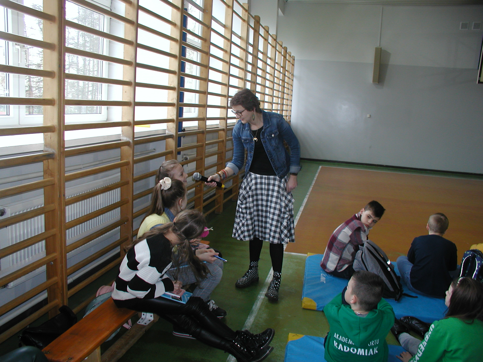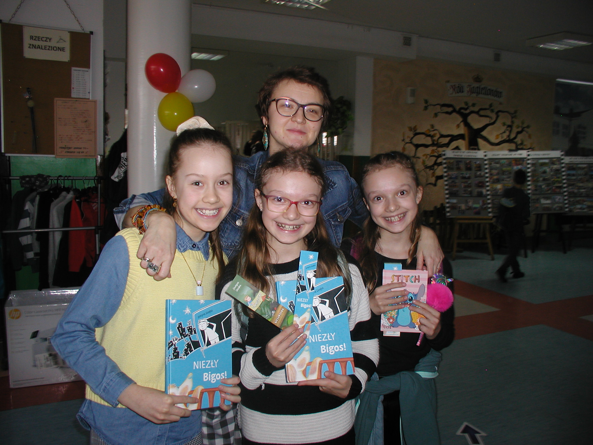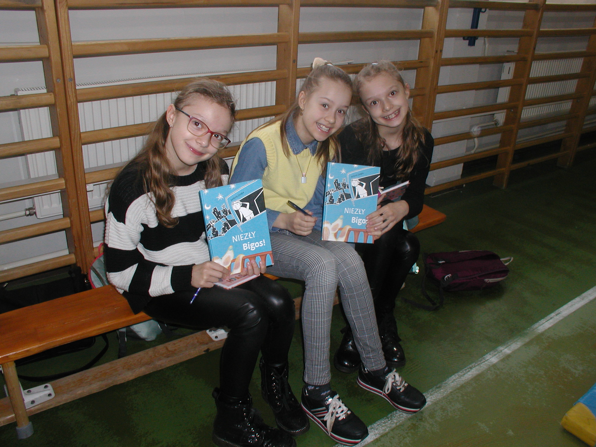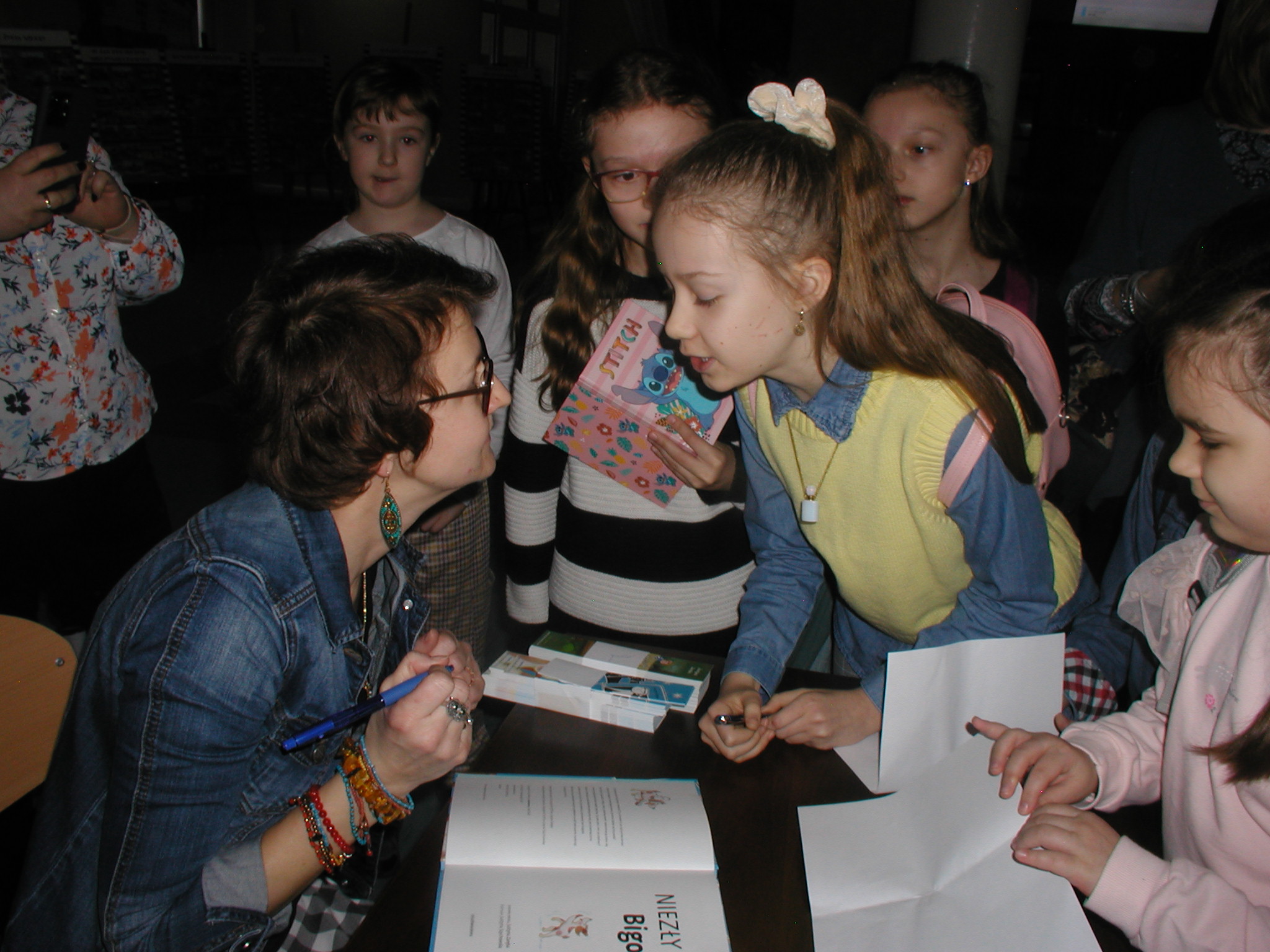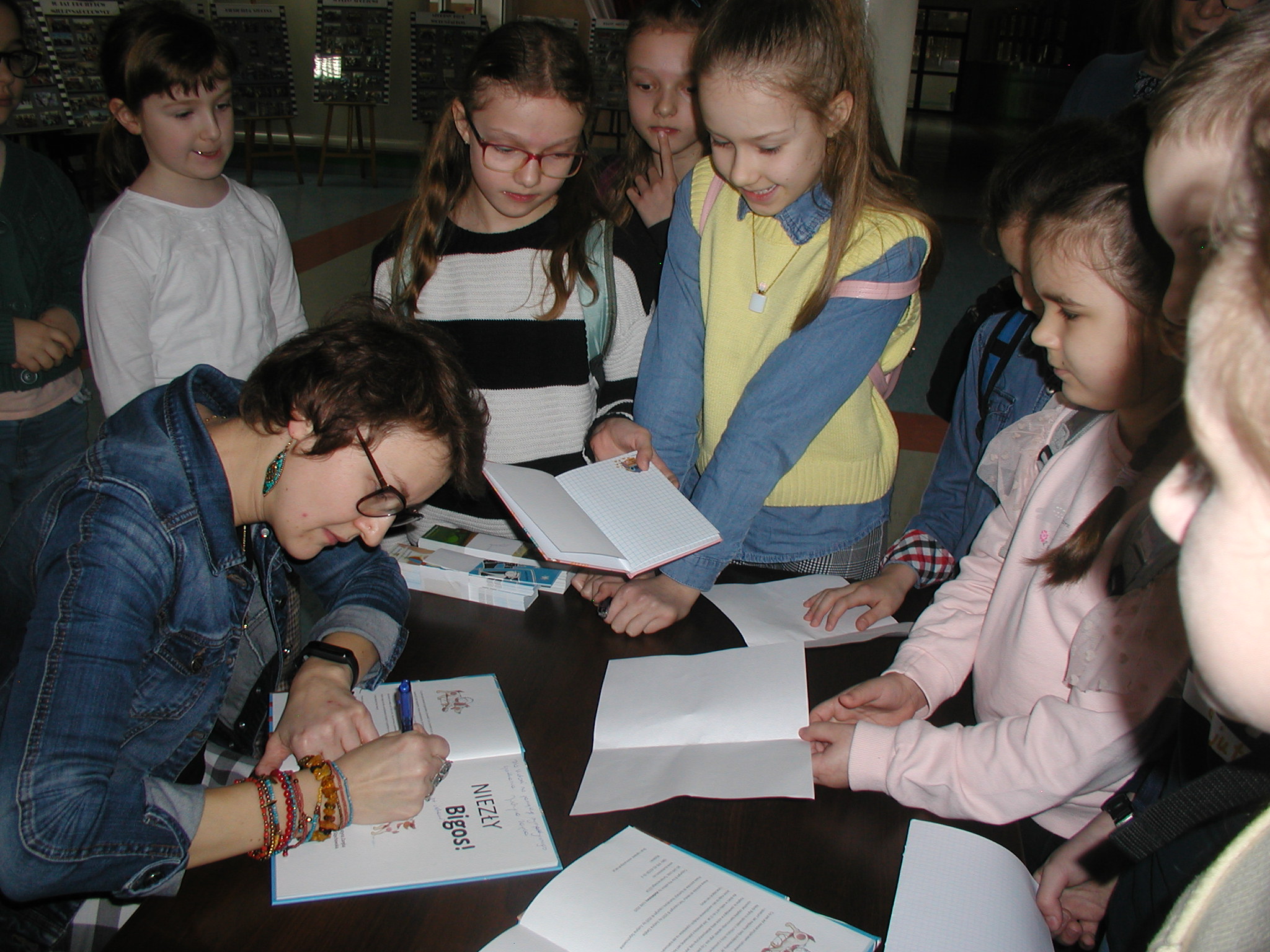 27 marca uczennice klasy III a uczestniczyły w spotkaniu z autorką książki „Niezły bigos” Justyną Zarebą, zorganizowanym przez Miejska Bibliotekę Publiczną w Radomiu w ramach konkursu czytelniczego Radomscy Tropiciele Książek. Podczas spotkania pisarka przybliżyła młodym czytelnikom swoją twórczość, opowiadała w jaki sposób powstawały jej książki i odpowiadała na pytania dzieci. W miłej atmosferze dzieci wysłuchały fragmentów książki „Niezły bigos” i „Znalezisko wysypisko”. Pierwsze opowiadanie uwrażliwia młodych czytelników na prawidłowe traktowanie zwierząt, natomiast drugie na poszanowanie otaczającej nas przyrody. Pełne emocji spotkanie zakończyło się wpisywaniem dzieciom do książek pamiątkowych dedykacji. Mamy nadzieję, że spotkania z pisarzami będą zachętą do czytania.