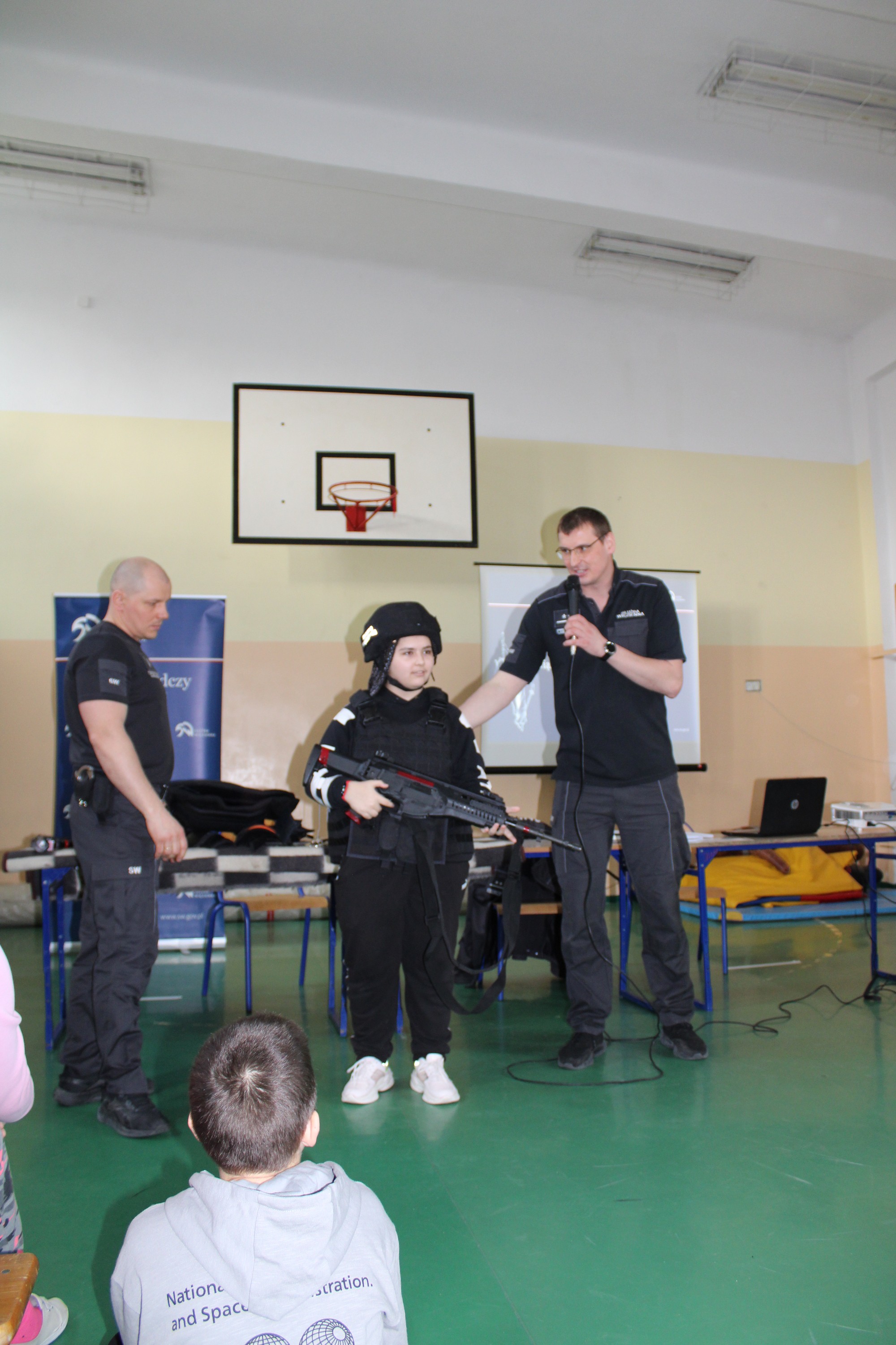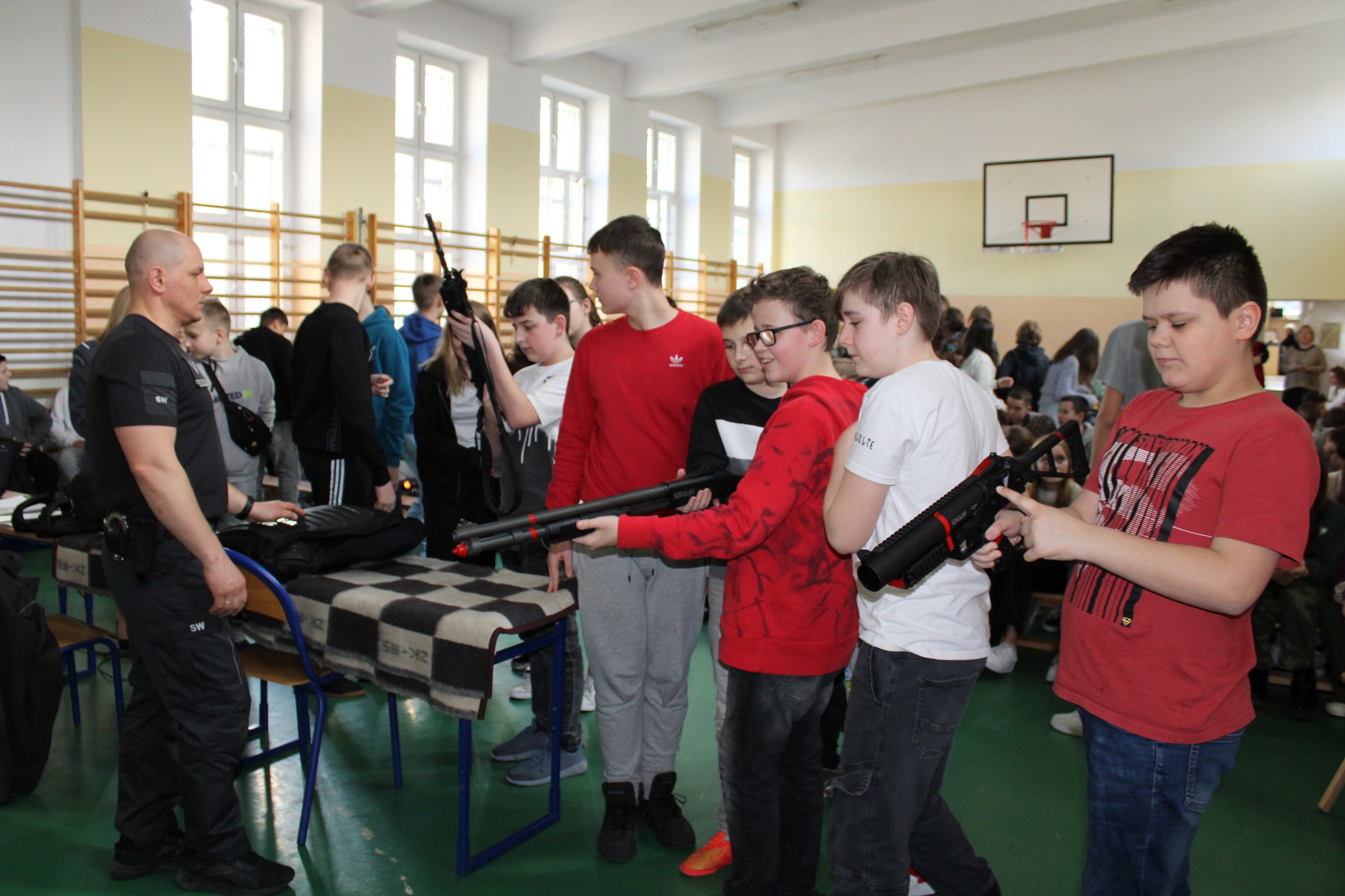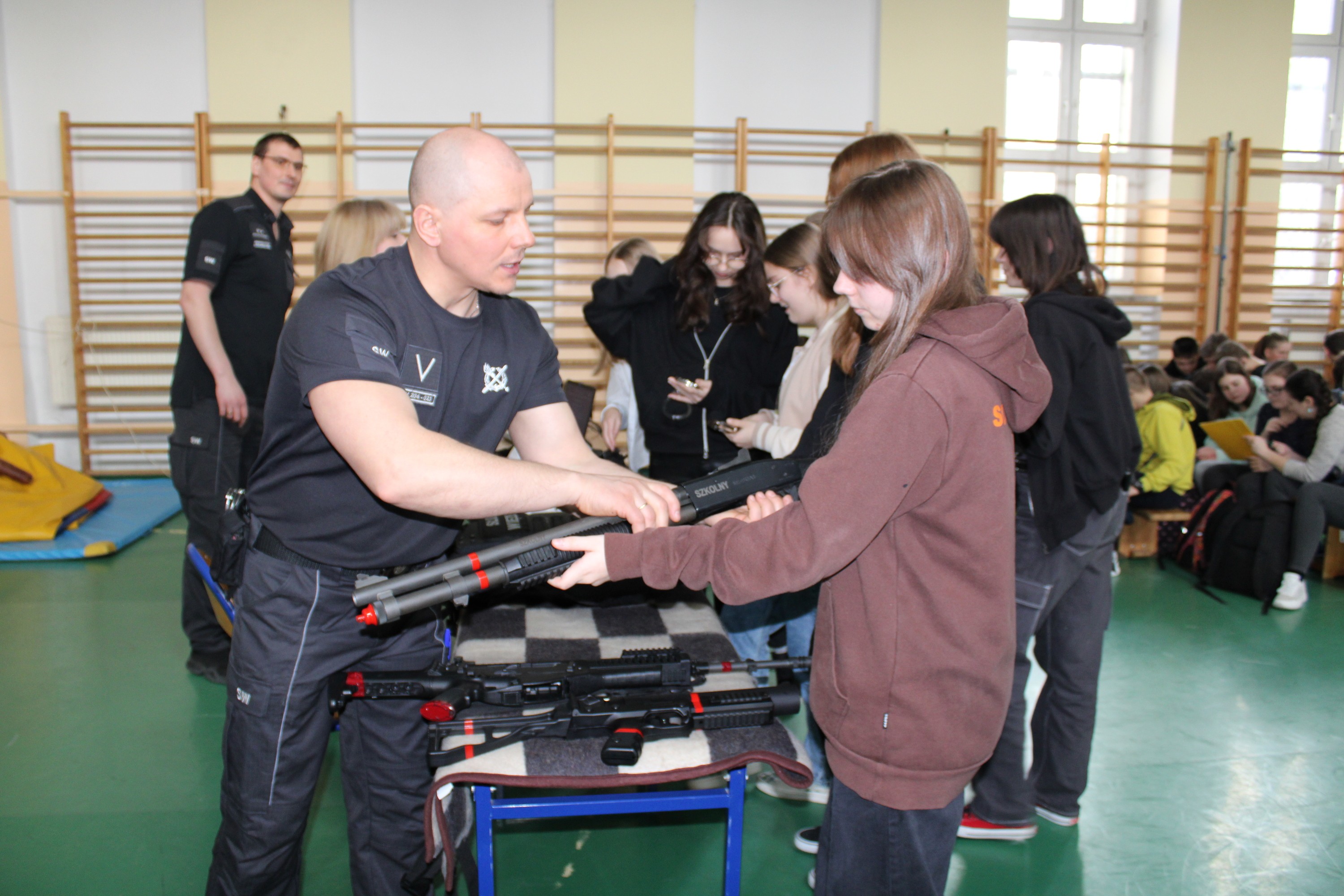 W części praktycznej zajęć uczniowie zapoznali się z bronią palną, która jest wykorzystywana przez funkcjonariuszy Służby Więziennej podczas służby oraz sprzętem wykorzystywanym w celu zabezpieczeń w czasie konwojowania osadzonych.