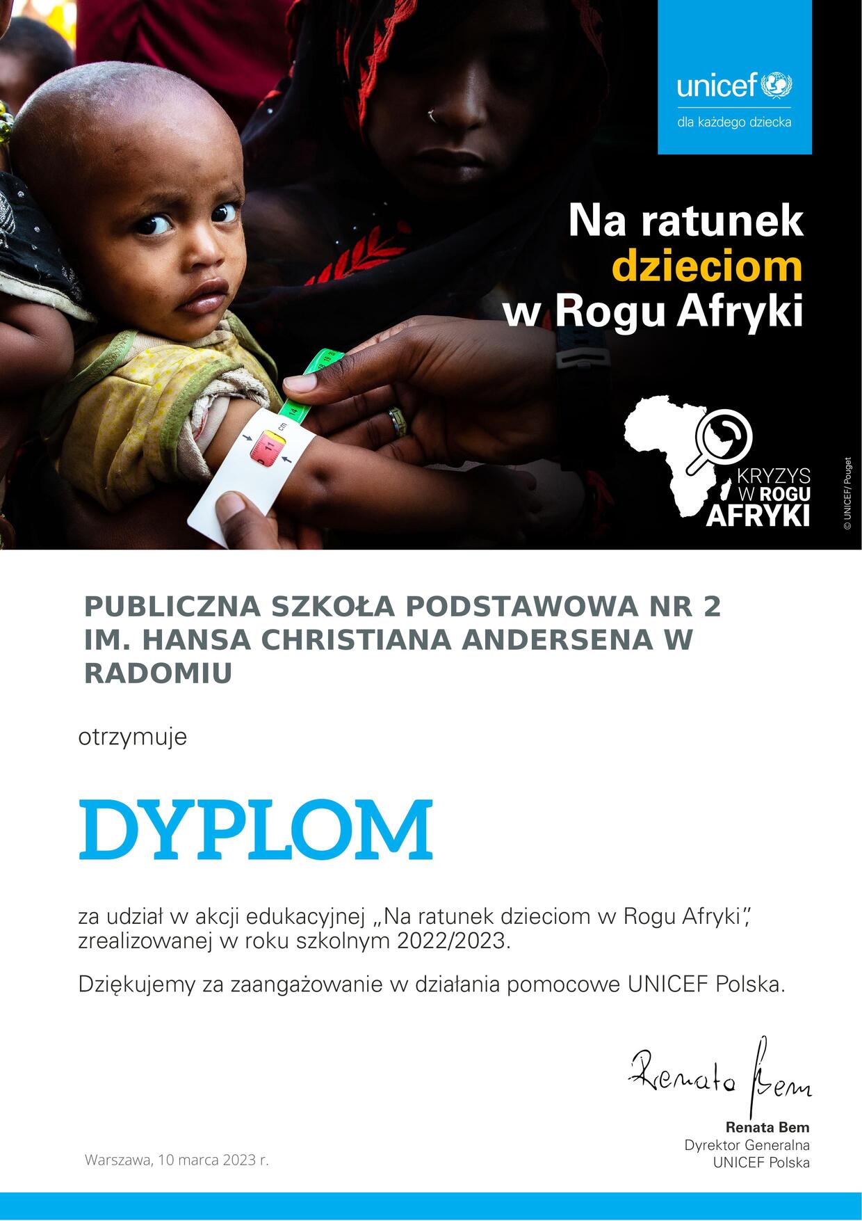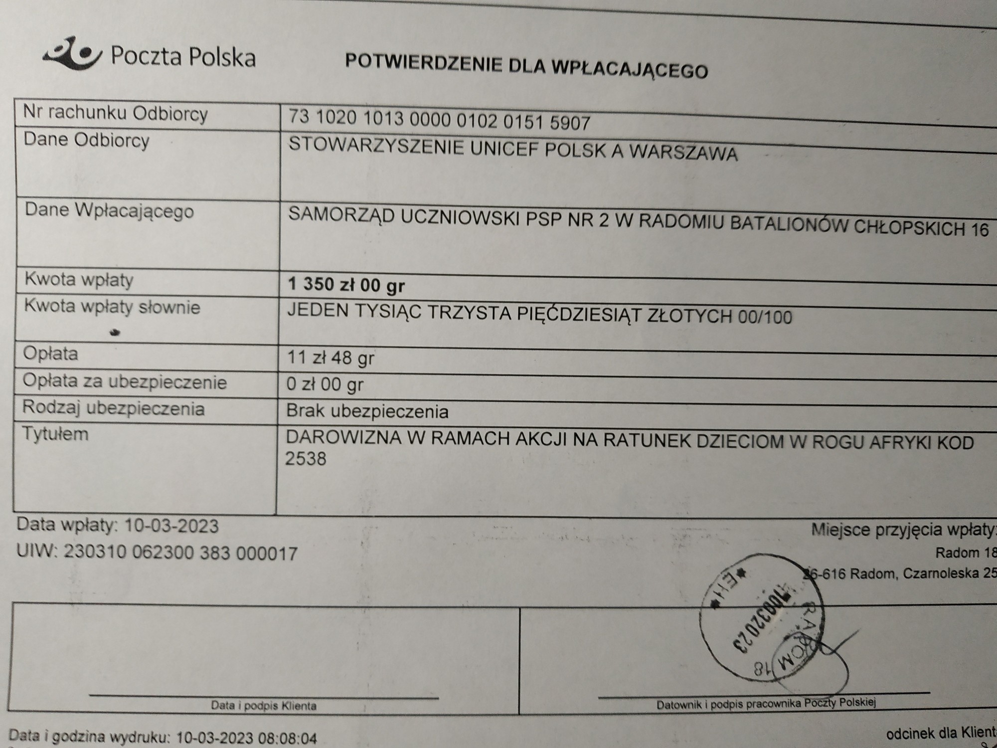 Finał projektu Na ratunek dzieciom w Rogu Afryki. Na konto Stowarzyszenia UNICEF Polska Samorząd Uczniowski Publicznej Szkoły Podstawowej nr 2 im. H. Ch. Andersena i Szkolne Koło UNICEF przesłali 1350 zł. (tysiąc trzysta pięćdziesiąt złotych). Bardzo dziękujemy całej społeczności szkolnej za włączenie się w działania w ramach realizacji projektu Na ratunek dzieciom w Rogu Afryki.