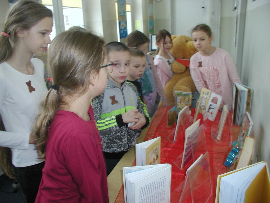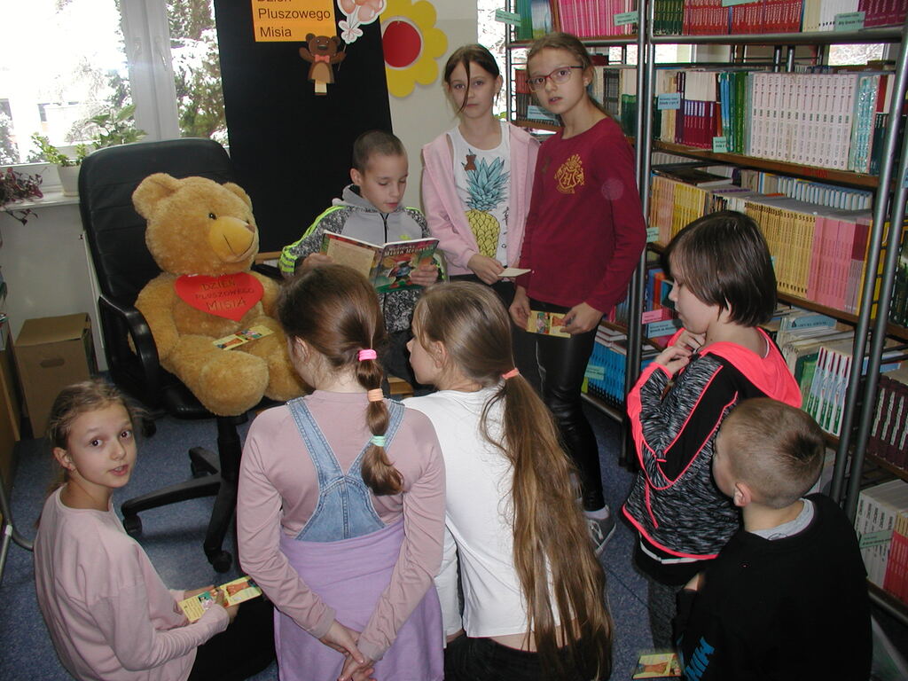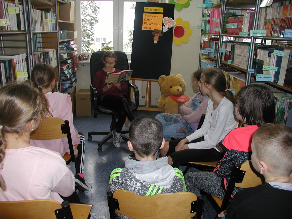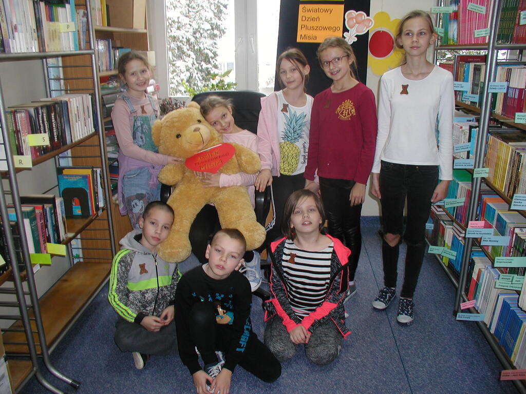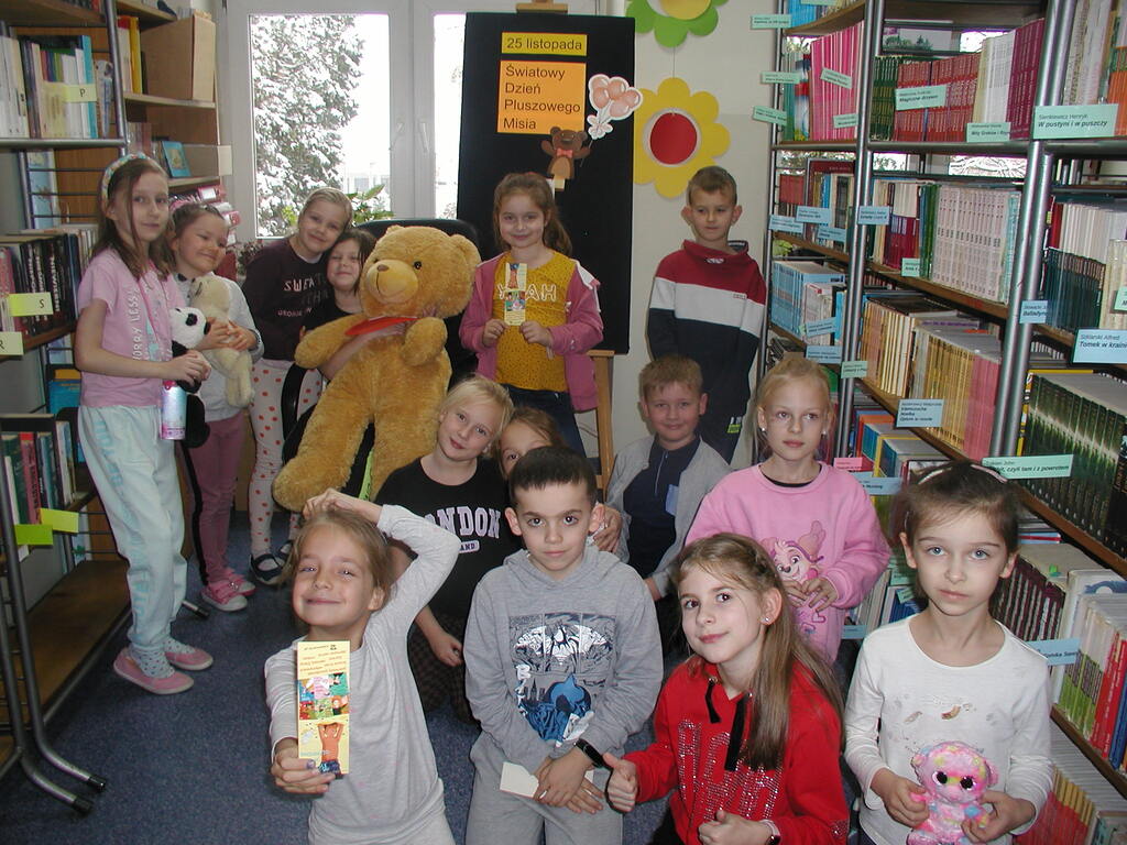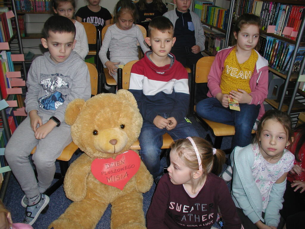 25 listopada przypada Światowy Dzień Pluszowego Misia, z tej okazji panie z biblioteki zaprosiły najmłodszych uczniów do świętowania. Dzieci obejrzały wystawę książek o misiach, wysłuchały w obecności Misia fragmentów przygód Misia Uszatka i Kubusia Puchatka ze Stumilowego Lasu. W rolę lektorów wcielili się uczniowie z klasy 3a oraz Lena z klasy 8a. Po wysłuchaniu fragmentów opowiadań uczniowie wzięli udział w quizie wiedzy o tym sympatycznym zwierzęciu, który poprowadziła Wiktoria z kl. 8a. Nie zabrakło pląsów „Misie dwa” i "Ja jestem niedźwiadek" oraz wspólnej fotografii z misiem. Na pamiątkę spotkania uczestnicy otrzymali misie-przyklejanki. Obchody Dnia Pluszowego Misia miały na celu kształtowanie i rozwijanie zainteresowań literackich i artystycznych naszych Milusińskich. Zapraszamy małych i dużych na kolejne wydarzenia do szkolnej biblioteki:)