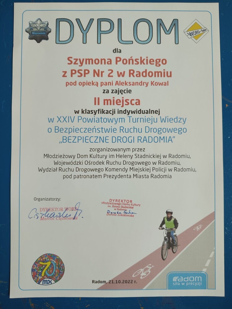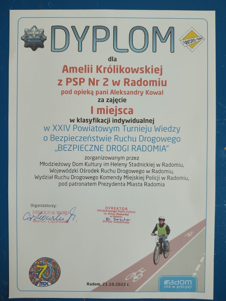 21.10.2022 r. w Młodzieżowym Domu Kultury im. Heleny Stadnickiej w Radomiu odbył się XXIV Powiatowy Turniej Wiedzy o Bezpieczeństwie Ruchu Drogowego „Bezpieczne Drogi Radomia”. Turniej został zorganizowany przy współpracy WORD w Radomiu i Wydziałem Ruchu Drogowego KMP w Radomiu. Zawodnicy musieli pokonać elementy na rowerowym torze przeszkód oraz napisać test wiedzy. W turnieju wzięło udział 39 uczniów z 13 szkół Radomia i regionu radomskiego. Reprezentacja naszej szkoły w składzie: Amelia Królikowska kl.6a, Szymon Gomuła kl. 6c, Szymon Poński kl. 6a w klasyfikacji drużynowej zajęła II miejsce! Najlepszą zawodniczką turnieju została Amelia Królikowska zajmując I miejsce w klasyfikacji indywidualnej, II miejsce zajął Szymon Poński. Amelka i Szymon bezbłędnie przejechali rowerowy tor przeszkód. Serdecznie gratuluję!