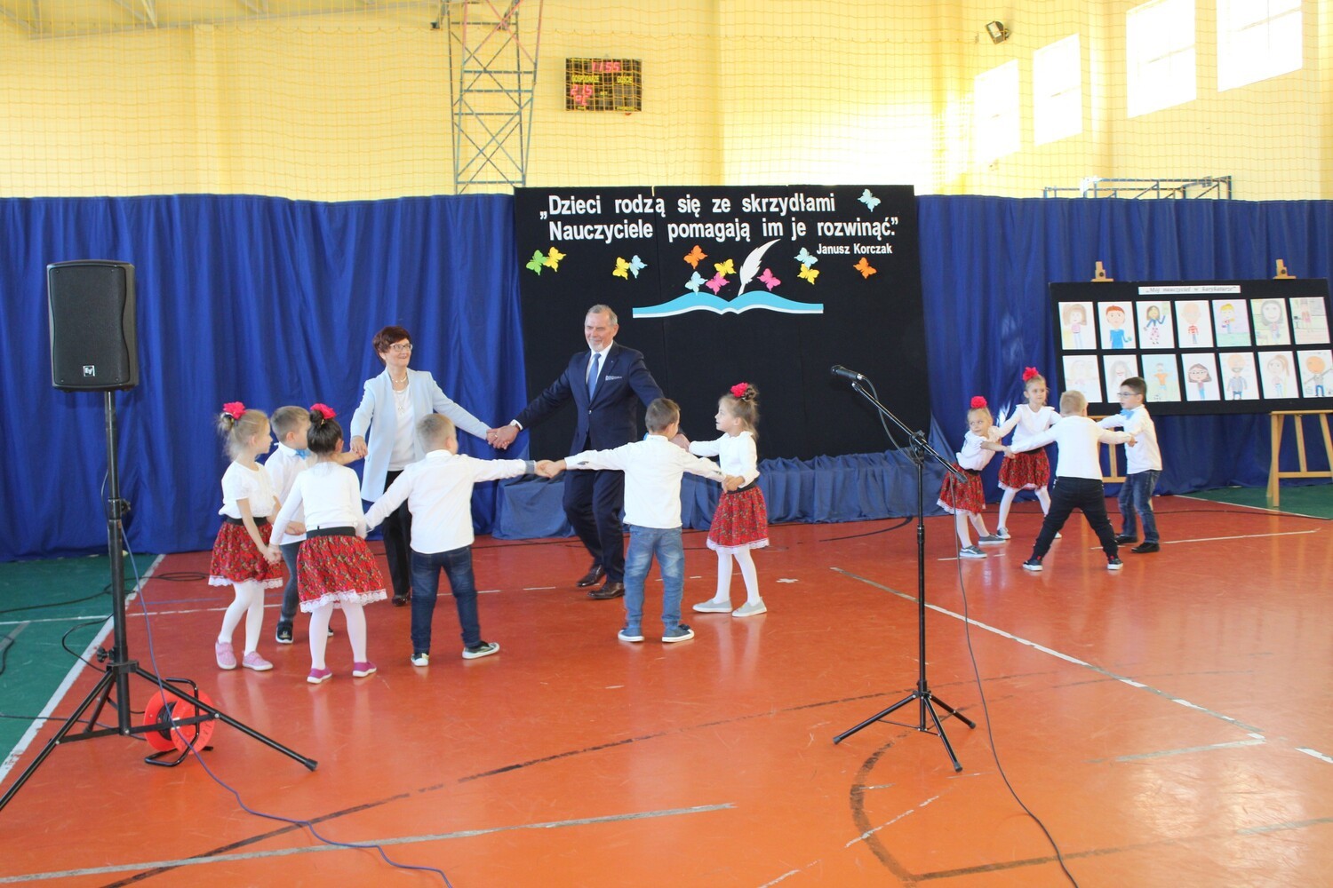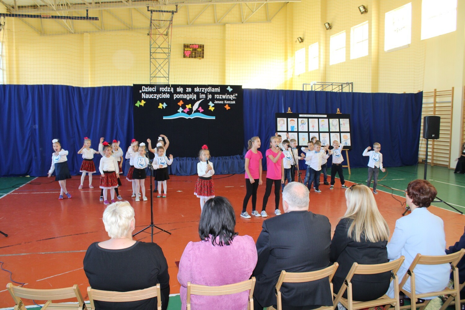 W części oficjalnej można było wysłuchać przemówień okolicznościowych oraz oklaskiwać nauczycieli i pracowników obsługi wyróżnionych przez dyrektora szkoły. W części artystycznej uczniowie dziękowali swoim nauczycielom tańcem, śpiewem, występami teatralnymi. Pięknie zaprezentował się teatrzyk "Bajkoludki” przygotowany przez p.A.Dolegę i p.M.Piechurską. Uczniowie klas ósmych przedstawili scenki z życia szkolnego. A dzieci z oddziału „0”, pod kierunkiem p.D.Krupińskiej, uroczo zatańczyły taniec „ Ty i ja”, do którego zaprosiły dyrekcję szkoły. Zaśpiewały również piosenkę, której tekst był specjalnie przygotowany na tę okoliczność. Wszystkim występującym należały się ogromne brawa!