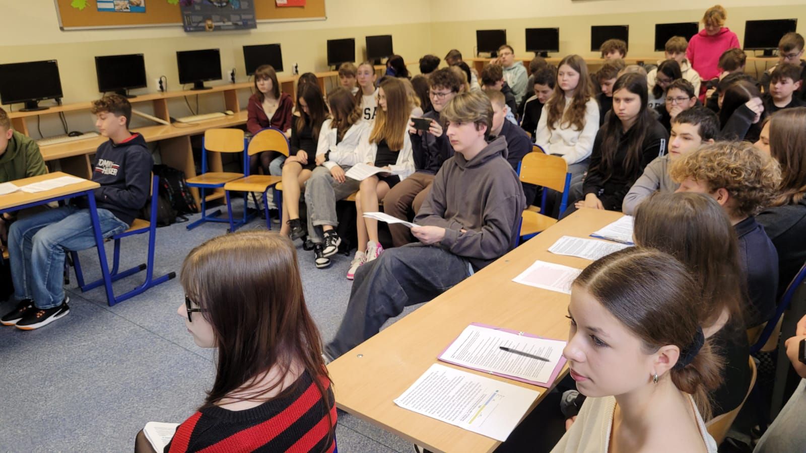 21 lutego uczniowie klas 8 wzięli udział w nietypowej lekcji, podczas której wcielili się w ekspertów ds. cyberbezpieczeństwa. Pracując w grupach, rozwiązywali zagadki i wykonywali zadania związane z ochroną finansów w sieci.
