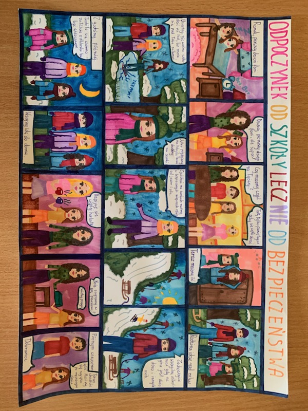 Konkurs „Moje ferie zimowe” rozstrzygnięty. Uczestnicy wykazali się umiejętnością zaplanowania komiksu, w którym opowiedzieli o swoim wypoczynku podczas ferii zimowych. Zawarli w nim, zgodnie z wymogami regulaminowymi, zasady bezpiecznego zachowania się na lodowisku i jazdy na nartach. W pracach uczniowie wykorzystali różne techniki plastyczne – rysunek, grafikę komputerową, wycinankę.