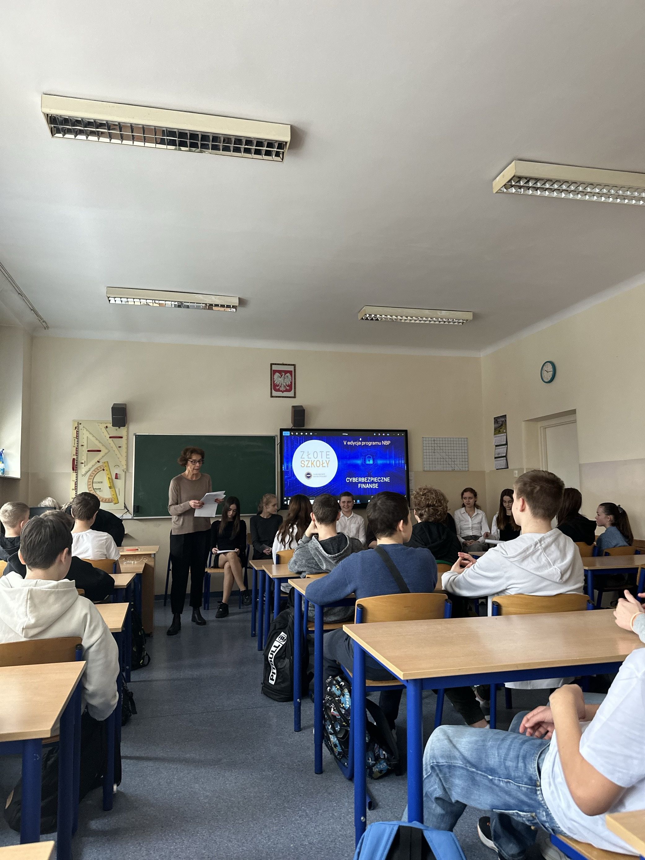 W dniu 19.02.2025r. w naszej szkole odbyła się lekcja na temat cyberbezpiecznych finansów dla uczniów klas 8, realizowana w ramach V edycji programu „Złote Szkoły NBP”. Tegoroczny temat przewodni – Cyberbezpieczne Finanse – ma na celu zwiększenie świadomości uczniów na temat bezpiecznego korzystania z finansów w świecie cyfrowym. W zajęciach uczestniczyli również uczniowie klas 7, należący do Drużyny Ambasadorów Edukacji Ekonomicznej, którzy pod opieką nauczycieli przygotowali prezentacje i ćwiczenia związane z kluczowymi aspektami cyberbezpieczeństwa.