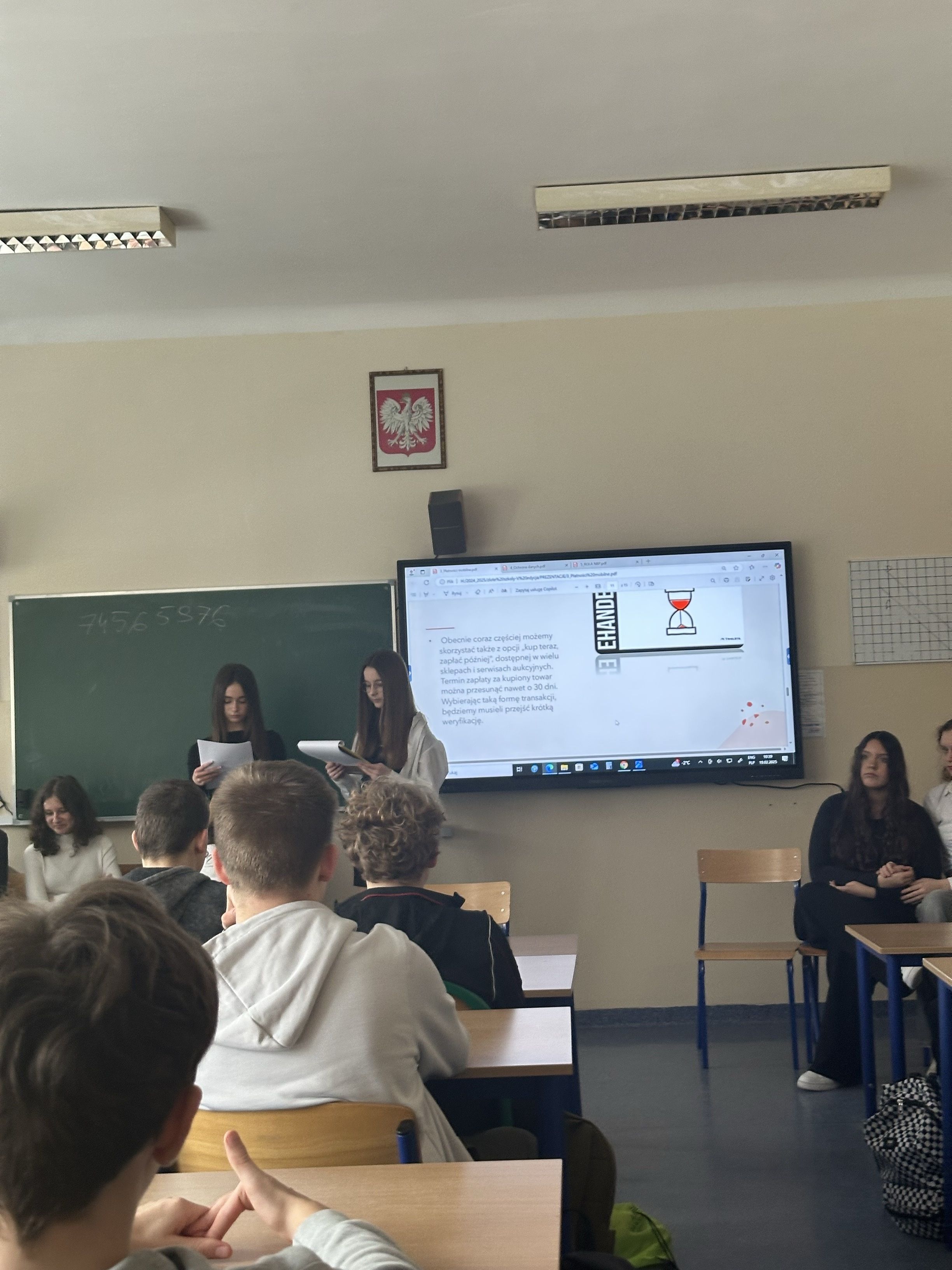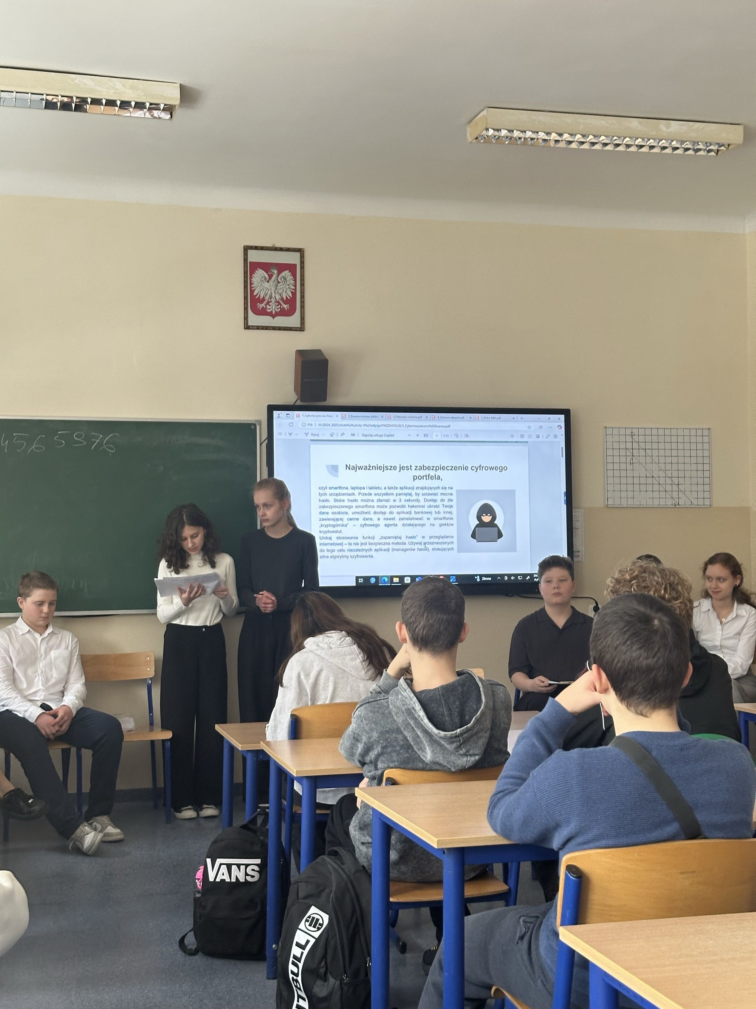 Kolejnym punktem zajęć były prezentacje przygotowane przez uczniów, które dotyczyły różnych aspektów bezpieczeństwa finansowego w internecie. Pierwsza grupa omówiła zabezpieczanie cyfrowego portfela, zwracając uwagę na tworzenie silnych haseł, korzystanie z uwierzytelniania dwuetapowego oraz unikanie zagrożeń związanych z korzystaniem z publicznych sieci Wi-Fi. Druga skupiła się na bezpiecznych płatnościach w sieci, omawiając sposoby rozpoznawania fałszywych stron internetowych, mechanizmy phishingu oraz zasady bezpiecznych zakupów online. Trzecia grupa zaprezentowała temat płatności mobilnych, wyjaśniając, jak działa BLIK, tokenizacja oraz zabezpieczenia biometryczne. Kolejna grupa omówiła temat bezpieczeństwa danych osobowych w cyberprzestrzeni. Na zakończenie omówiono również rolę NBP w systemie płatniczym, podkreślając, w jaki sposób Narodowy Bank Polski dba o bezpieczeństwo transakcji i stabilność systemu finansowego w Polsce.