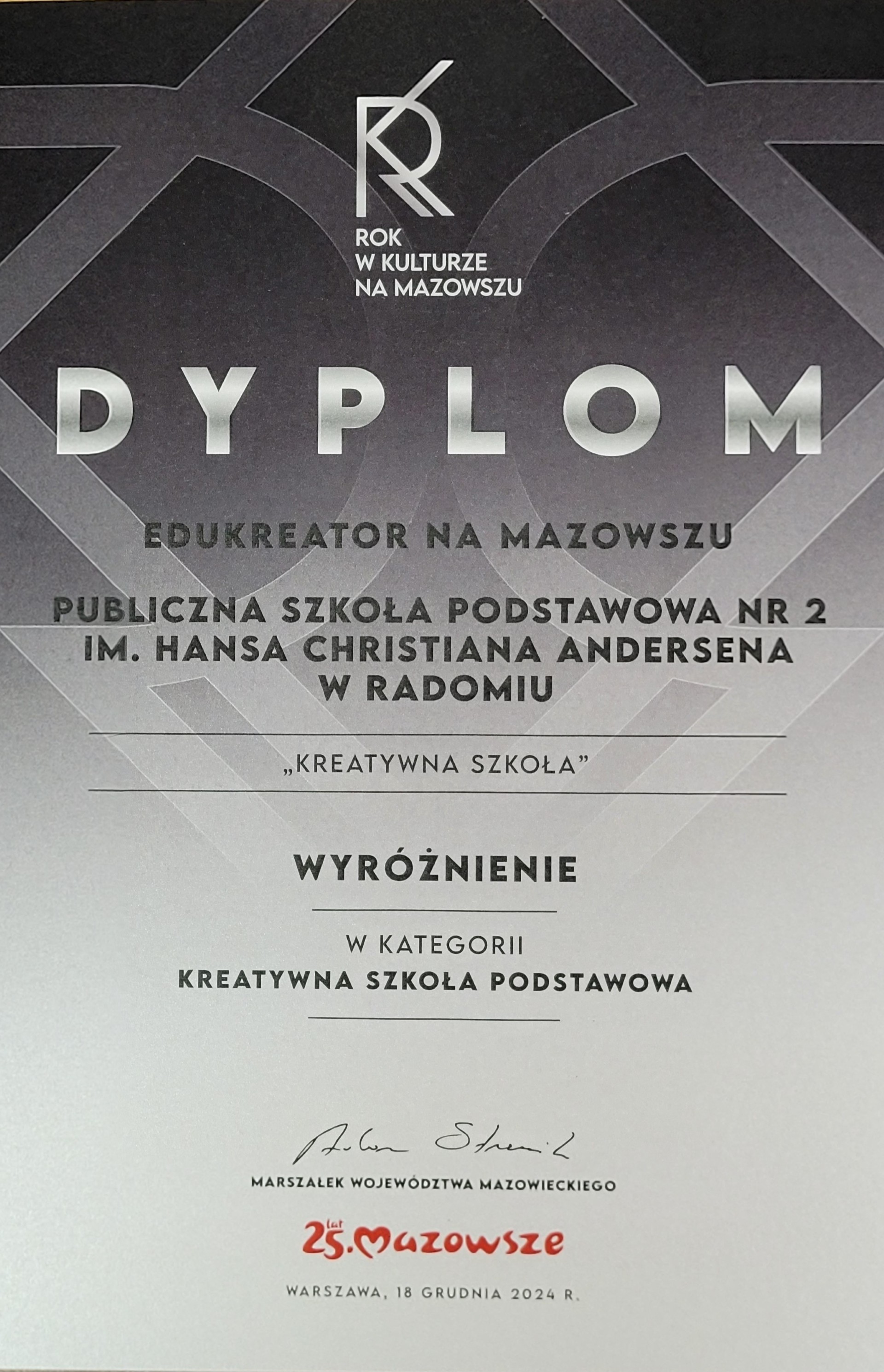 Z wielką przyjemnością informujemy, że nasza szkoła otrzymała prestiżowe wyróżnienie w VIII edycji konkursu „Edukreator na Mazowszu” jako kreatywna szkoła!