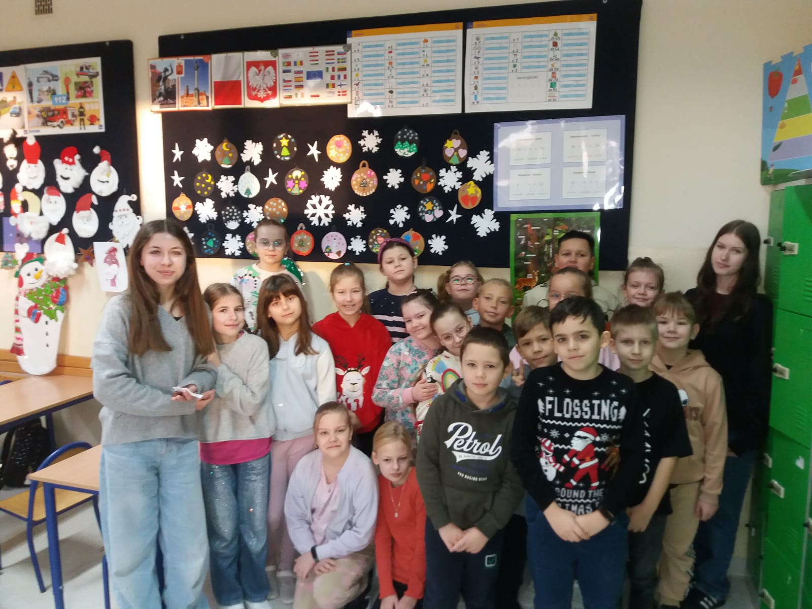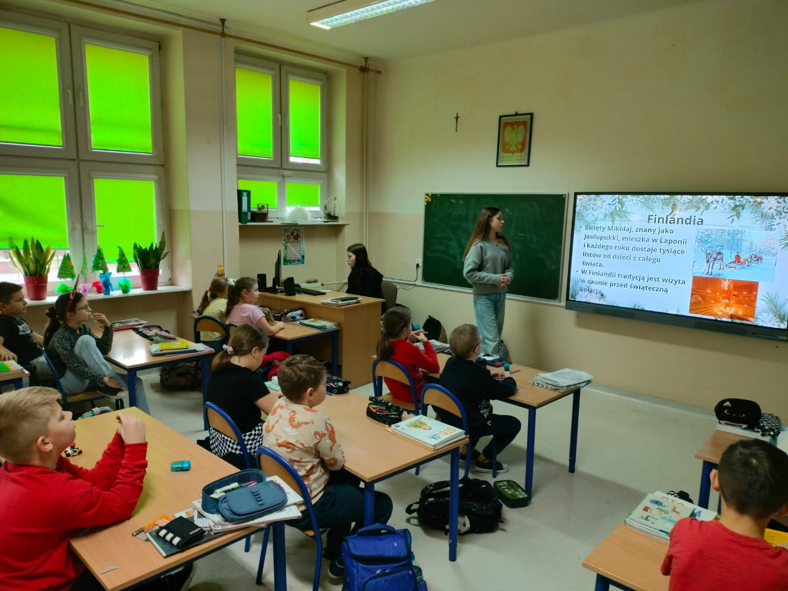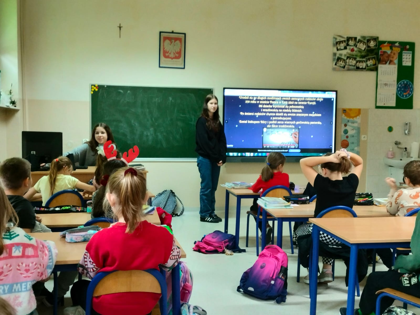 Podczas zajęć uczennice zaprezentowały przygotowane przez siebie prezentacje multimedialne, które nie tylko w ciekawy sposób przybliżyły różne świąteczne tradycje, ale także zawierały pytania i quizy, angażujące młodszych uczestników do aktywnego udziału. Uczniowie klas młodszych z wielkim zainteresowaniem uczestniczyli w zajęciach, chętnie odpowiadając na quizowe pytania i dzieląc się swoimi spostrzeżeniami.