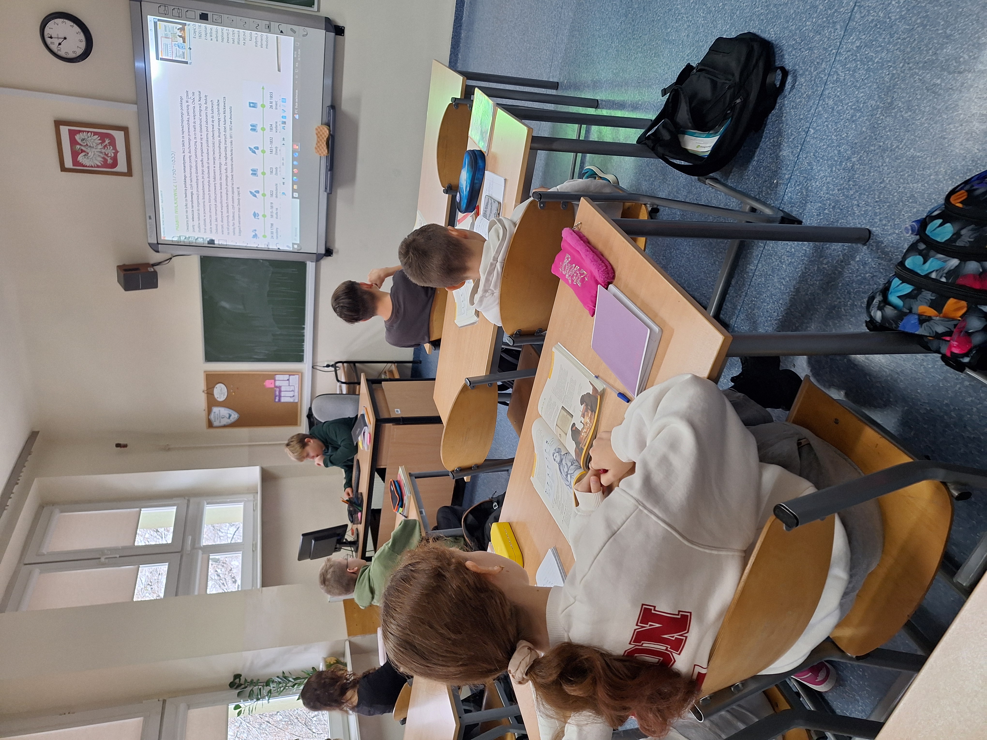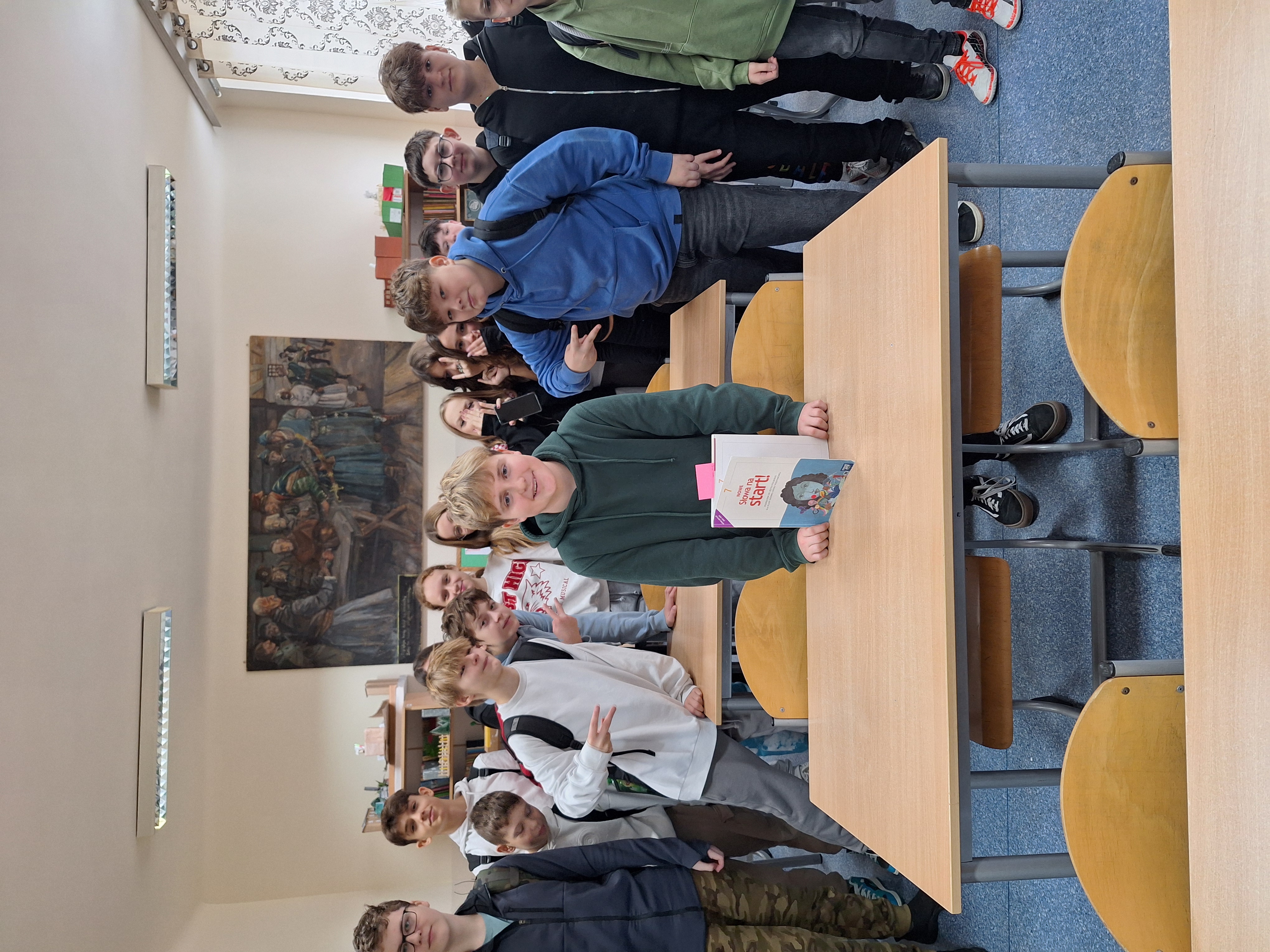 W piątek, 22.11.24 r. obchodziliśmy w szkole Dzień Odpoczynku dla Zszarganych Nerwów. Uczniowie odpoczęli od stresujących klasówek, kartkówek, odpowiedzi. A nauczyciele? W klasie 7B nastąpiła bezstresowa zamiana ról. Uczeń, Przemysław Szczepanik, poprowadził lekcję, a nauczycielka usiadła w ławce szkolnej. "Nowy nauczyciel" sprawnie podał temat lekcji dotyczący twórczości A. Mickiewicza. Wyświetlił i omówił prezentację na tablicy interaktywnej. Dla dopełnienia tematu i rozrywki zaproponował quiz w aplikacji Kahoot.