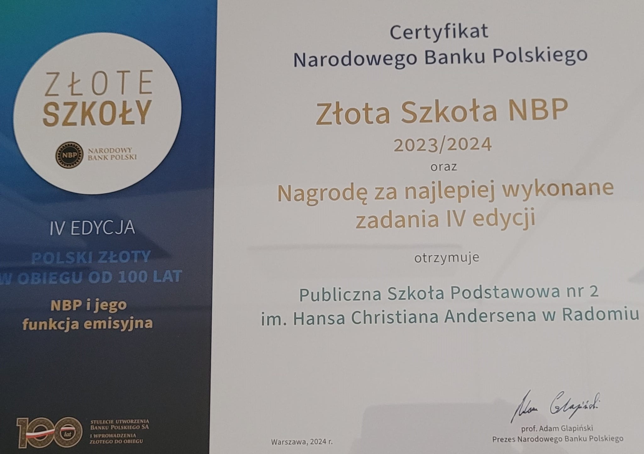 Z wielką radością informujemy, że nasza szkoła po raz drugi uzyskała tytuł Złotej Szkoły NBP oraz Nagrodę za najlepiej wykonane zadania w IV edycji programu. Uczniowie i nauczyciele PSP nr 2 w Radomiu kolejny raz przystąpili do ogólnopolskiego programu popularyzującego wiedzę ekonomiczną w środowiskach szkolnych, którego organizatorem jest Narodowy Bank Polski. Uczniowie klas siódmych utworzyli Drużynę Ambasadorów Edukacji Ekonomicznej pod opieką p. Renaty Chlibiuk i p. Lidii Sitarz. Wykonali wymagane przez organizatorów zadania dotyczące tematu przewodniego IV edycji programu Złote Szkoły NBP - POLSKI ZŁOTY W OBIEGU OD 100 LAT – NBP I JEGO FUNKCJA EMISYJNA.