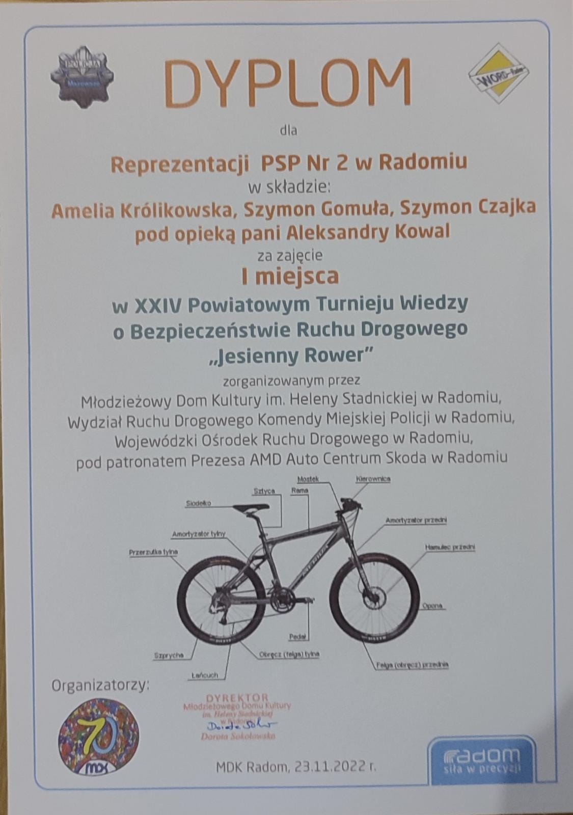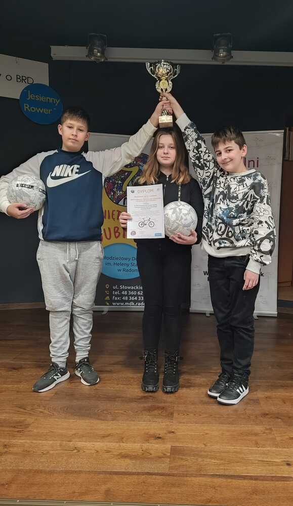 23 listopada 2022r. reprezentacja naszej szkoły w składzie: Amelia Królikowska z klasy 6a oraz Szymon Czajka i Szymon Gomułą z kl. 6c wzięła udział w XXIV Powiatowym Turnieju Wiedzy o Bezpieczeństwie Ruchu Drogowego "JESIENNY ROWER". Turniej został zorganizowany przez MDK im. H. Stadnickiej, WORD, Wydział Ruchu Drogowego KM Policji w Radomiu pod patronatem Prezesa AMD Auto Centrum SKODA w Radomiu. Do turnieju zgłosiło się 11 zespołów ze szkół Radomia i powiatu radomskiego. Zawodnicy musieli wykazać się znajomością przepisów ruchu drogowego, zasad udzielania I pomocy przedlekarskiej oraz umiejętnością w zakresie sprawdzenia stanu technicznego roweru.