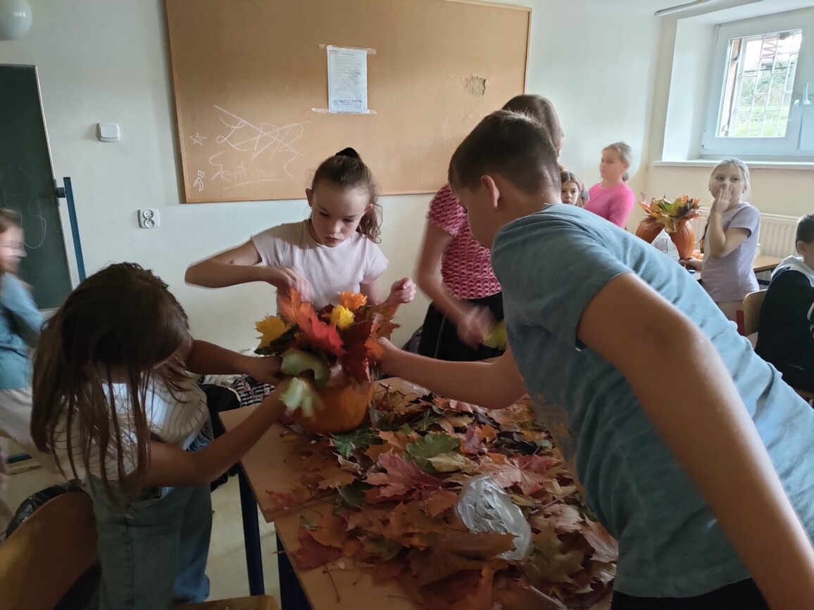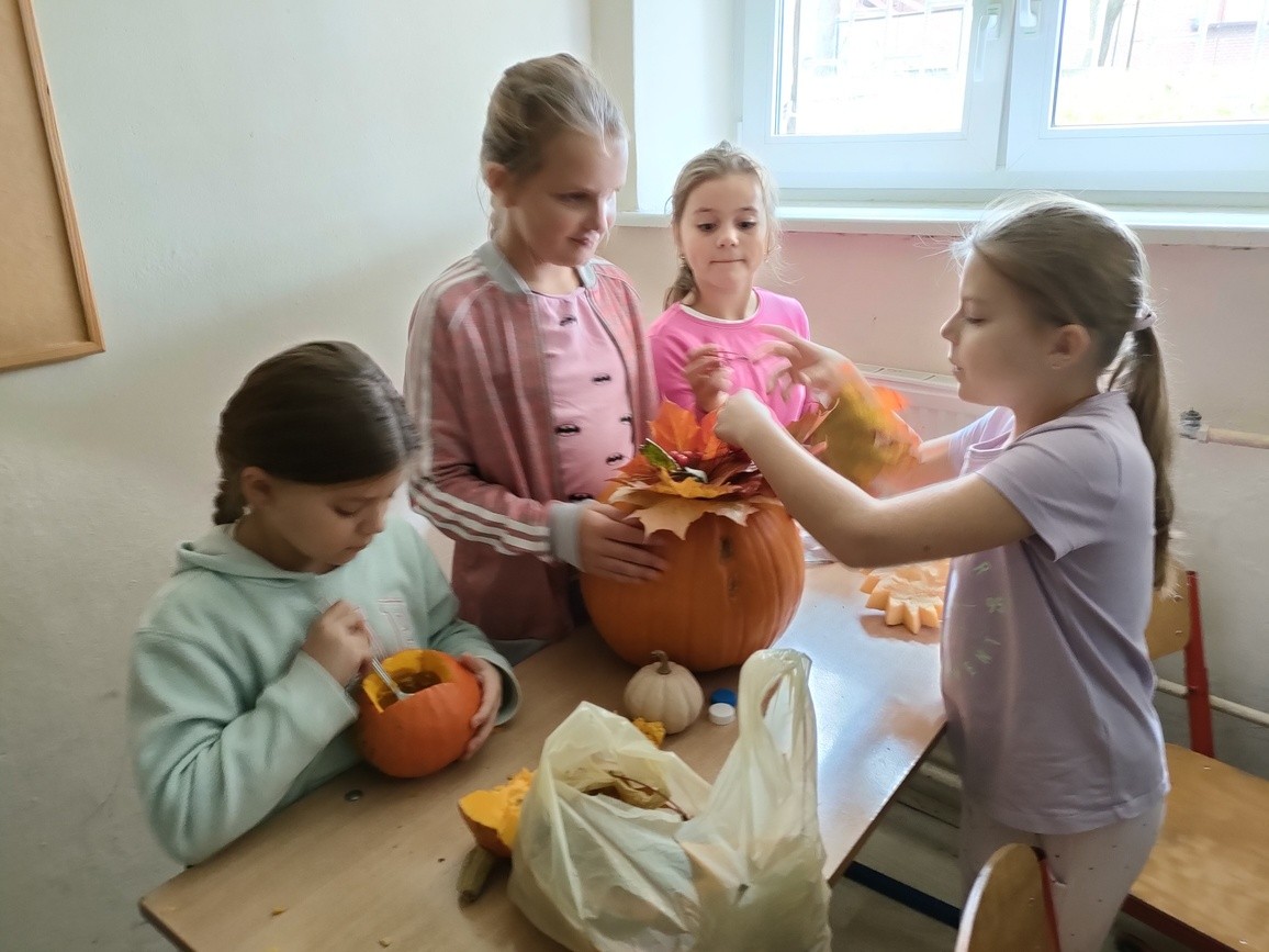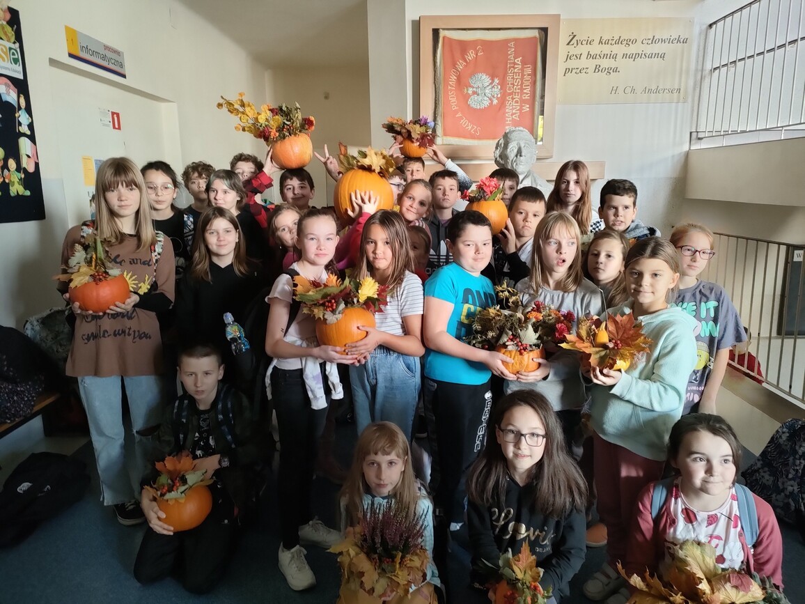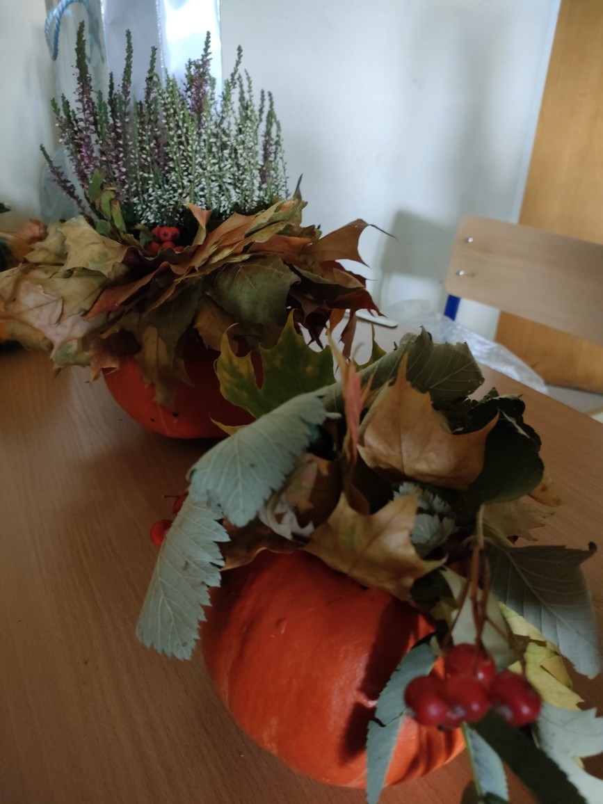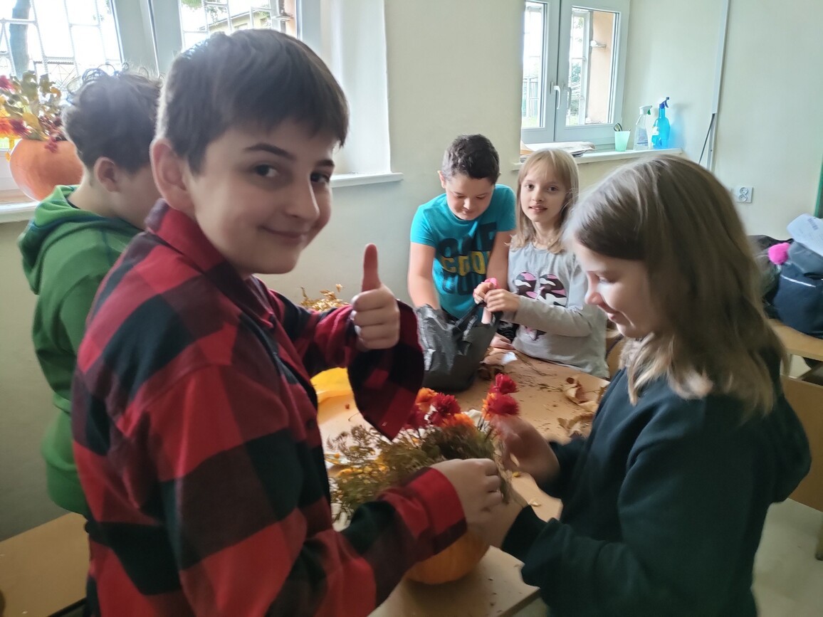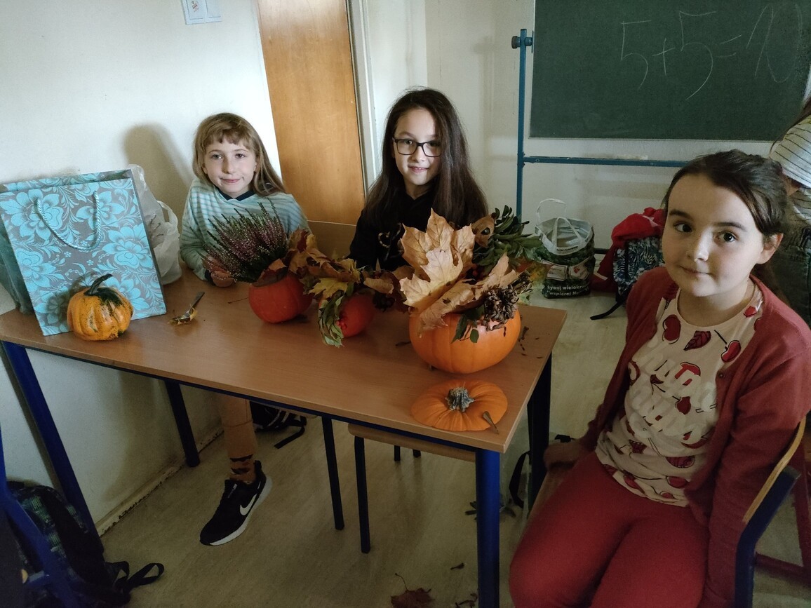 Dnia 4.10.2022 r. odbyły się zajęcia otwarte „Jesienne krajobrazy”, w ramach których uczniowie klasy 3 b i 6 c przygotowali kwiatowe kompozycje w dyniach. Ozdobiły one główne naszą szkołę. Dzieci chętnie ze sobą współpracowały, starsze pomagały młodszym. Podczas zajęć odczytały również wybrane wiersze o jesieni. Wspólne spotkanie przebiegło w miłej atmosferze.