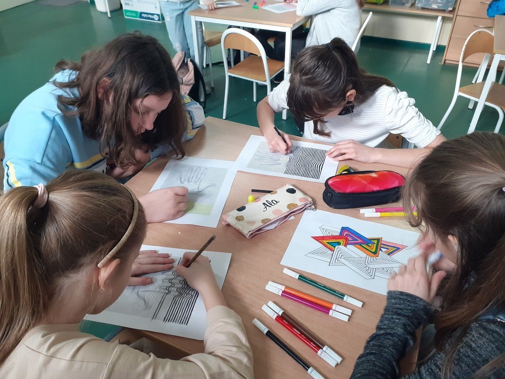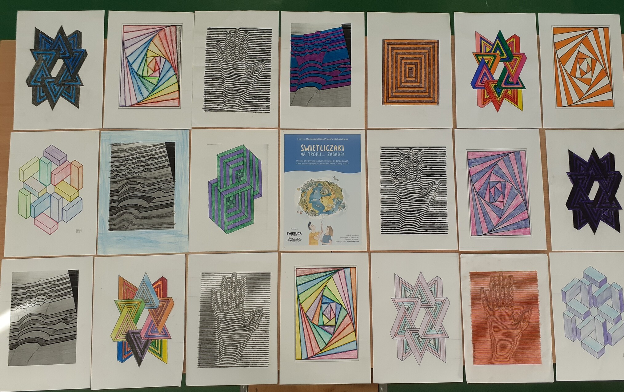Czy ten obraz się rusza? Świetliczaki poznały jeden z najciekawszych kierunków w sztuce współczesnej op-art, który charakteryzuje się kombinacją linii dających geometryczne złudzenie optyczne, zmierzające do wywołania wrażenia głębi. Dzieci obejrzały prezentację na ten temat, a następnie wykonały własne prace plastyczne.