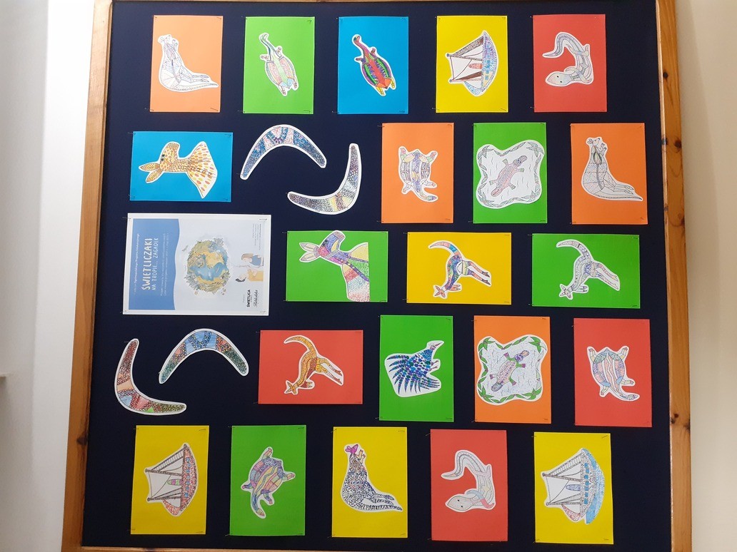 Ile jest kropek? Uczniowie poznali ciekawostki o Australii i jej rdzennych mieszkańcach - Aborygenach. Duże wrażenie wywarła na nich sztuka kropkowania, tą metodą wykonali bumerangi i sylwetki zwierząt.