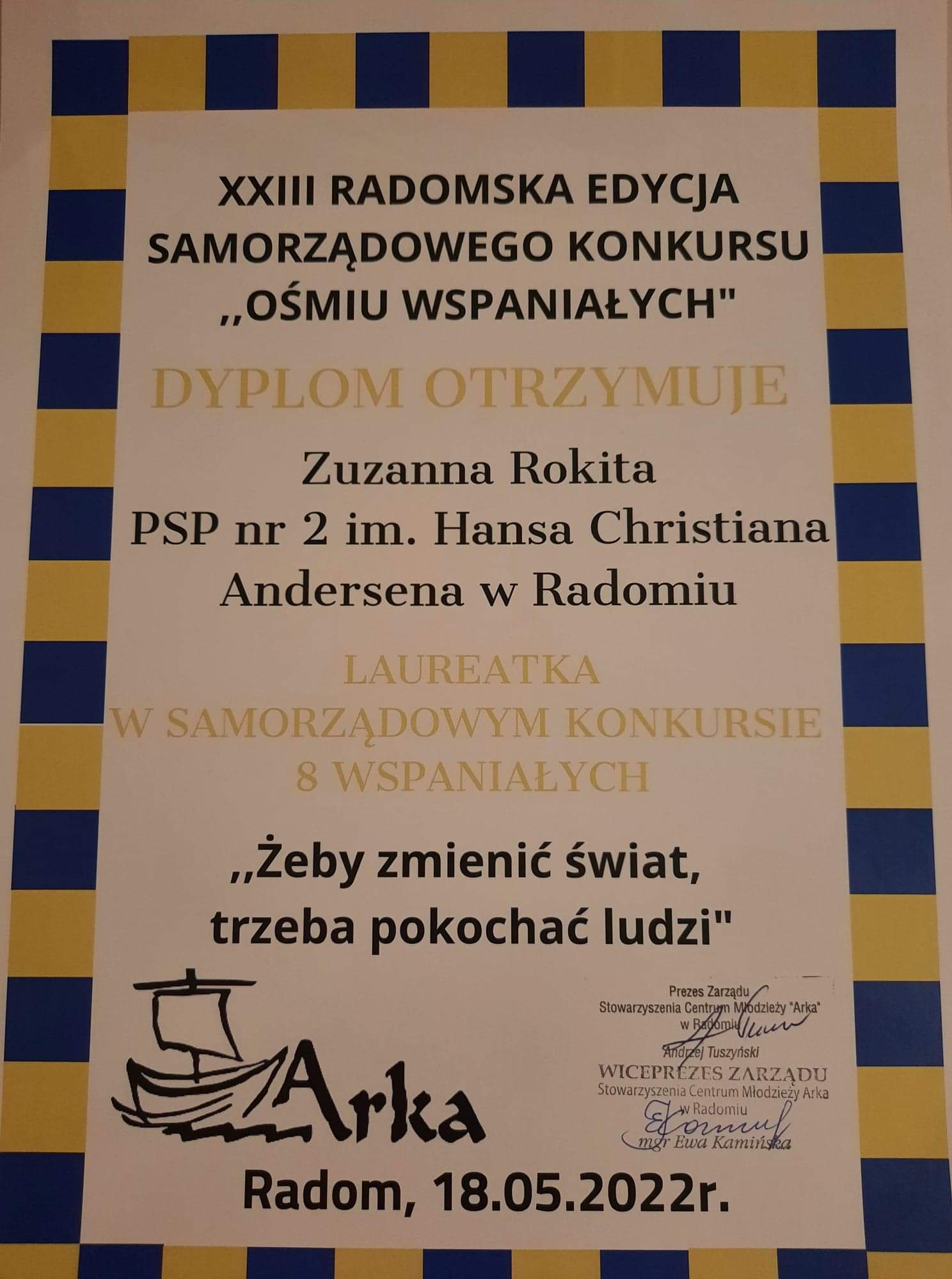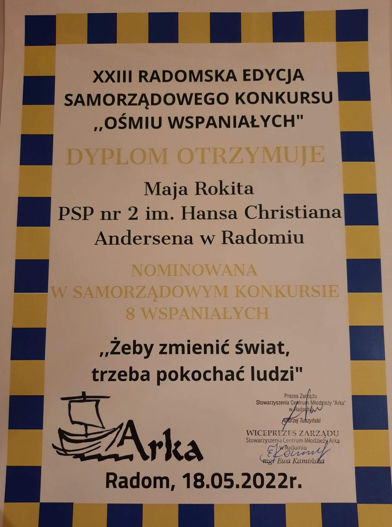 W dniu 18 maja 2022r. w klubokawiarni "Arka" odbyła się XXIII Radomska Gala Samorządowego Konkursu Nastolatków "Ośmiu Wspaniałych". W gali brało udział 17 nominowanych i ich opiekunowie m.in. wolontariuszki z PSP nr 2 Maja Rokita i Zuzanna Rokita z klasy 8a wraz z opiekunami p. E. Jędryszek i p. I. Górniewską.