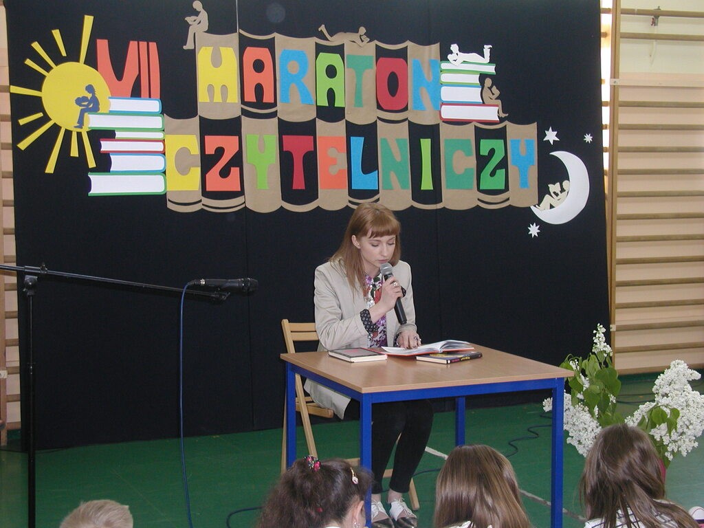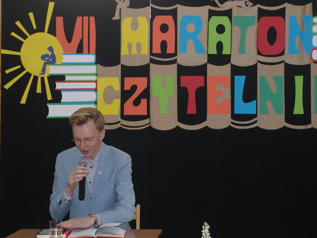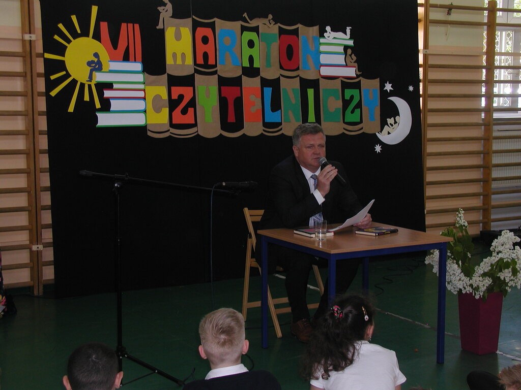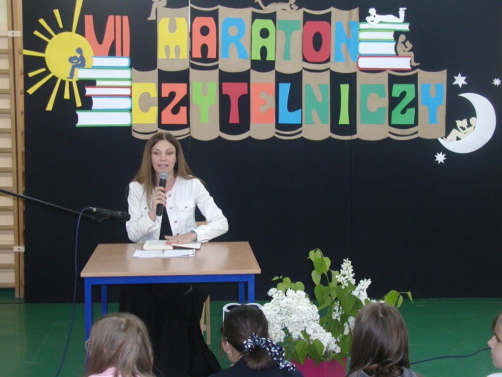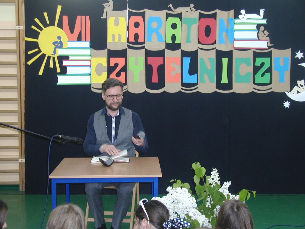 17.05.2022 r. w drugim dniu VII Maratonu Czytelniczego zaproszeni goście reprezentujący instytucje kulturalno-oświatowe: Radio Plus pani Magdalena Gliszczyńska, Kino Helios w Radomiu, pan Andrzej Ciesielski, czytali fragmenty książki „Malutka czarownica” Otfrieda Preusslera. Opowiadania przeczytała również Oliwia Kowalczyk, uczennica klasy 8 a. Na spotkaniu obecni byli uczniowie z klas IV - VI. Zebrani z ciekawością wysłuchali tekstów i wzięli udział w przygotowanych quizach.