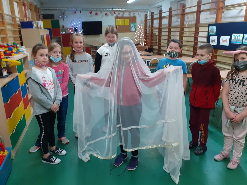 W ramach Ogólnopolskiego Projektu Edukacyjnego „Świetliczaki na tropie … zagadek” dzieci uczęszczające do świetlicy szkolnej zrealizowały zadanie pt. „Kim jest Biała Dama?” Podczas zajęć Nasze Świetliczaki obejrzały prezentację multimedialną dotyczącą najpiękniejszych zamków w Polsce, skąd dowiedziały się wielu ciekawostek na ich temat. Oglądały zdjęcia zamków w albumach i wysłuchały legendy o Białej Damie z zamku w Kórniku. Na koniec dzieci wykonały prace plastyczne. Wykazały się też dużą kreatywnością budując zamki z klocków.