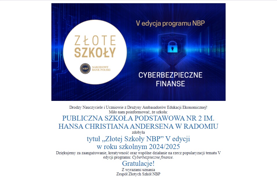 Z dumą ogłaszamy, że nasza szkoła ponownie zdobyła tytuł Złotej Szkoły NBP w V edycji programu Cyberbezpieczne finanse! To wielki powód do dumy i inspiracja do dalszej pracy!