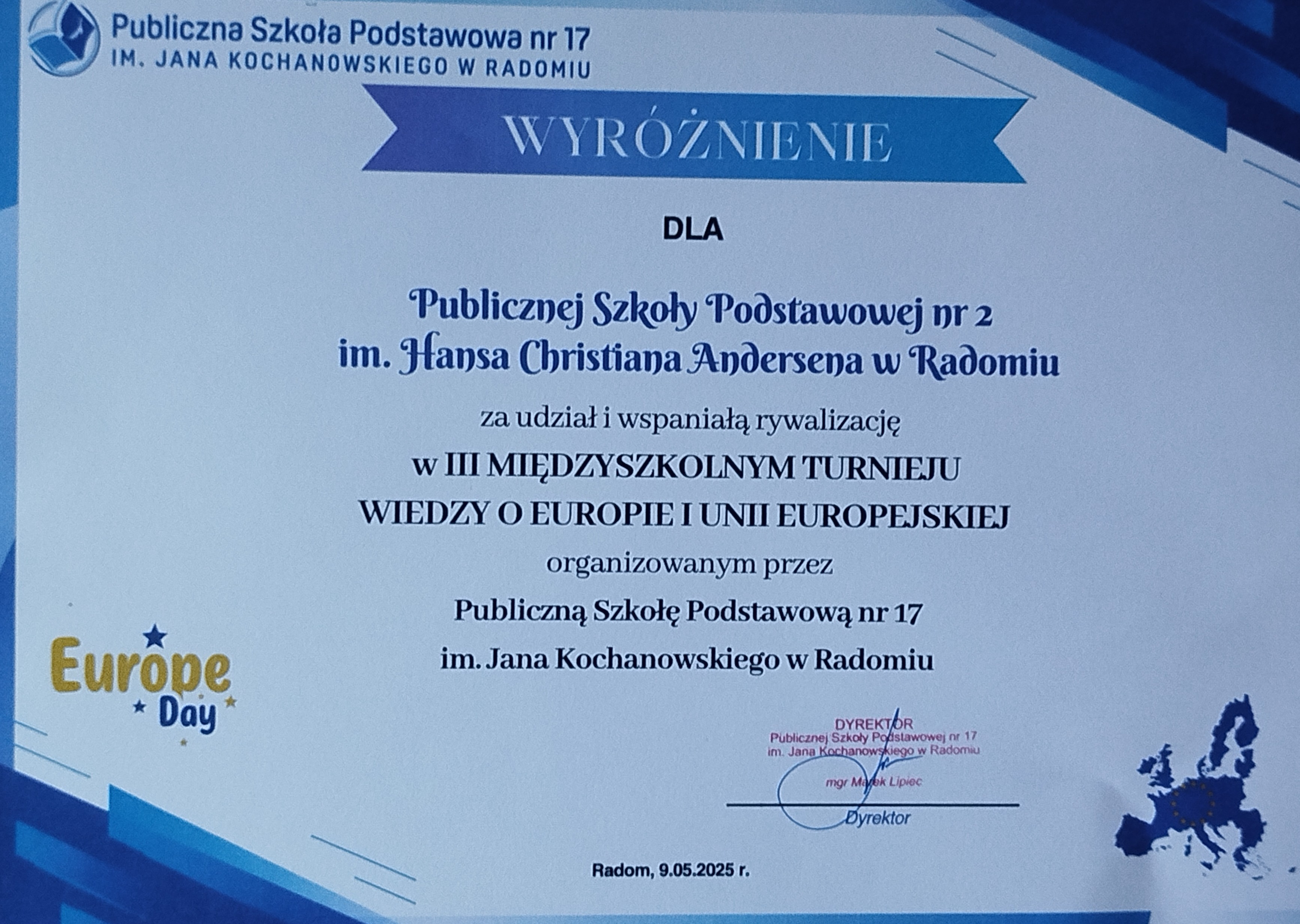 W ramach obchodów Dnia Europy uczniowie klasy 6a – Lena Ambroży, Blanka Wujcik i Piotr Szczepanek wzięli udział w III Międzyszkolnym Turnieju Wiedzy o Europie i Unii Europejskiej w PSP Nr 17 w Radomiu. Głównym celem wydarzenia było inspirowanie młodzieży do zainteresowania tematyką europejską, szerzenie idei integracji oraz rozwijanie poczucia przynależności do lokalnej i europejskiej wspólnoty.