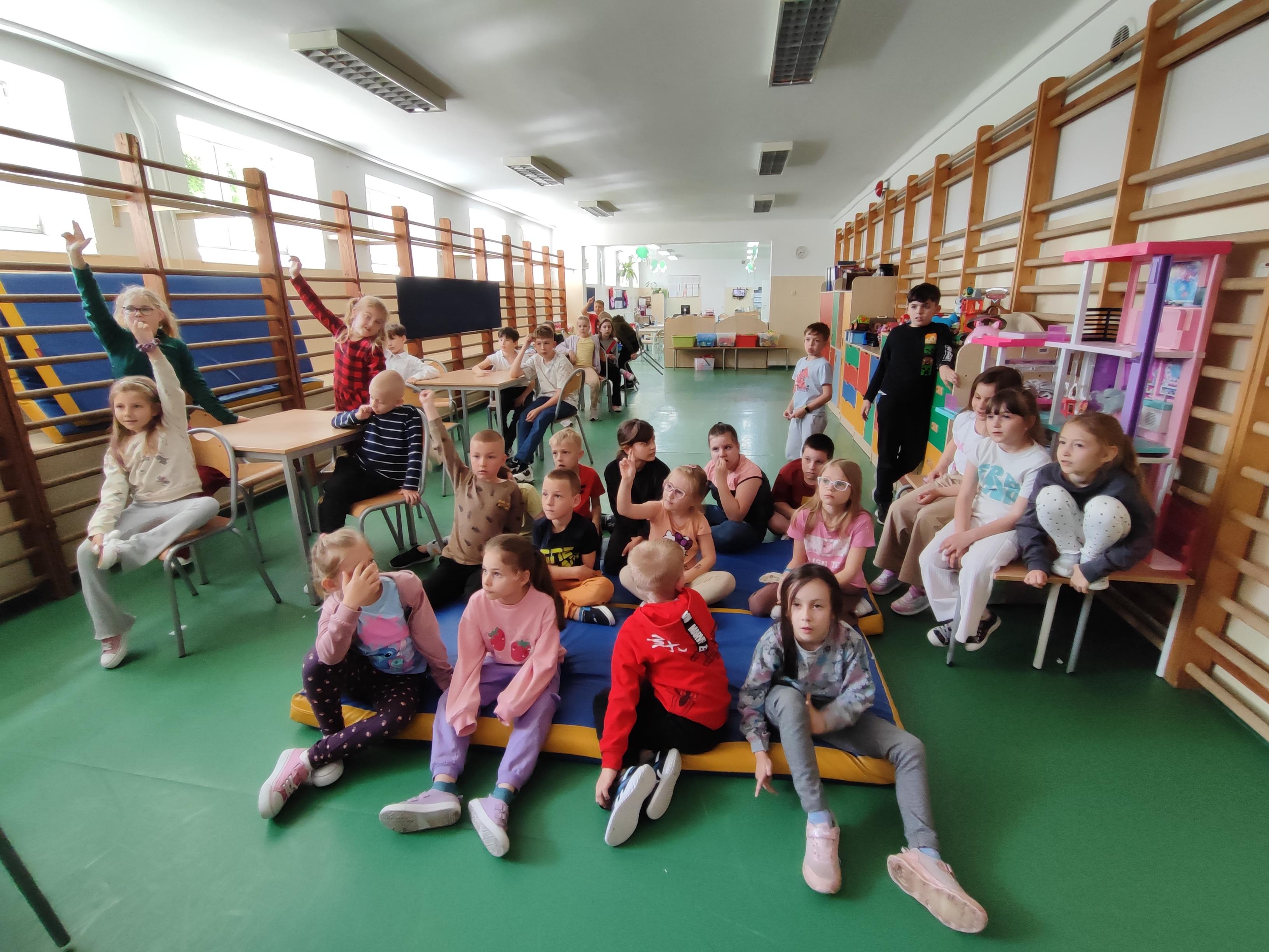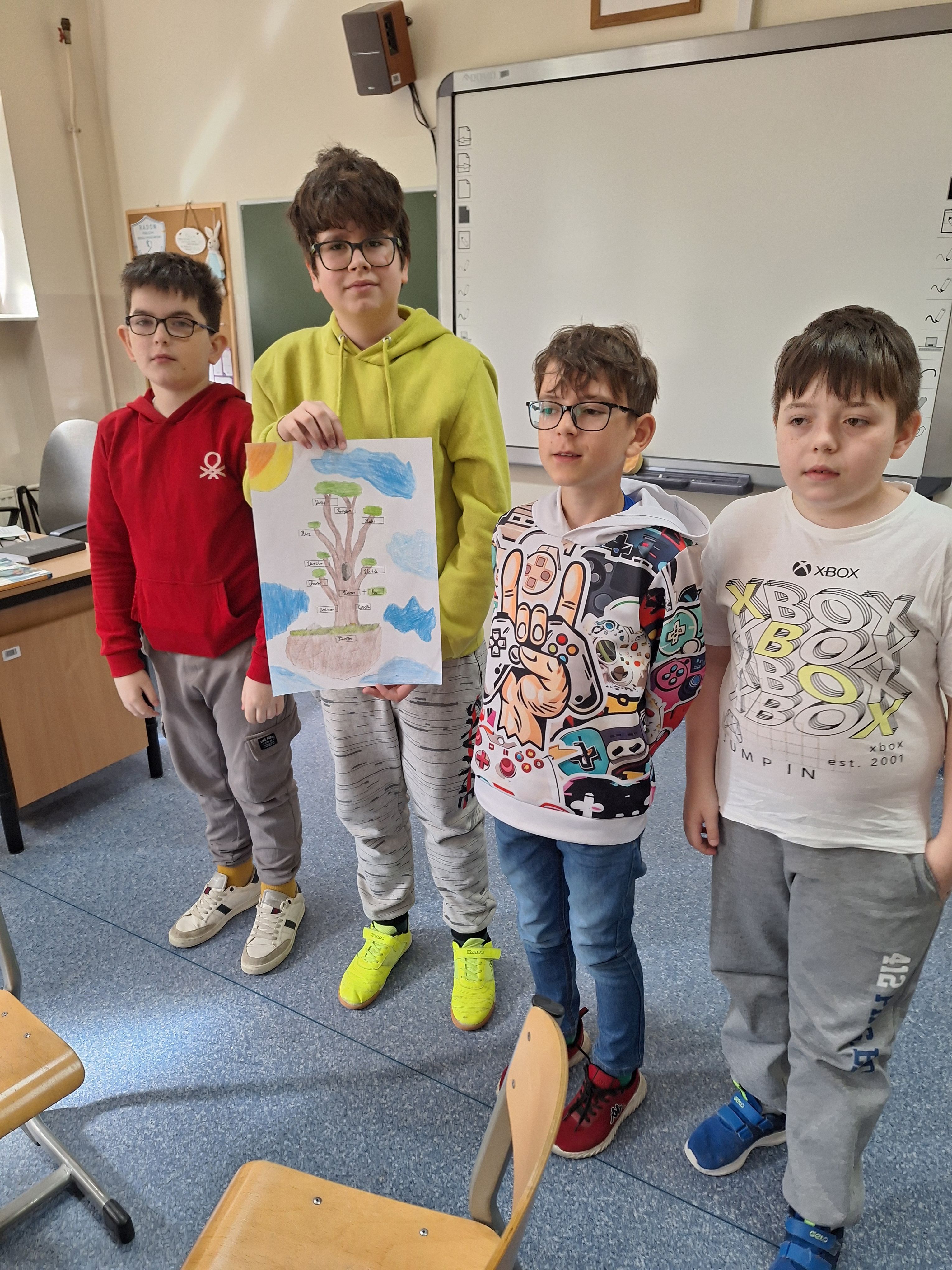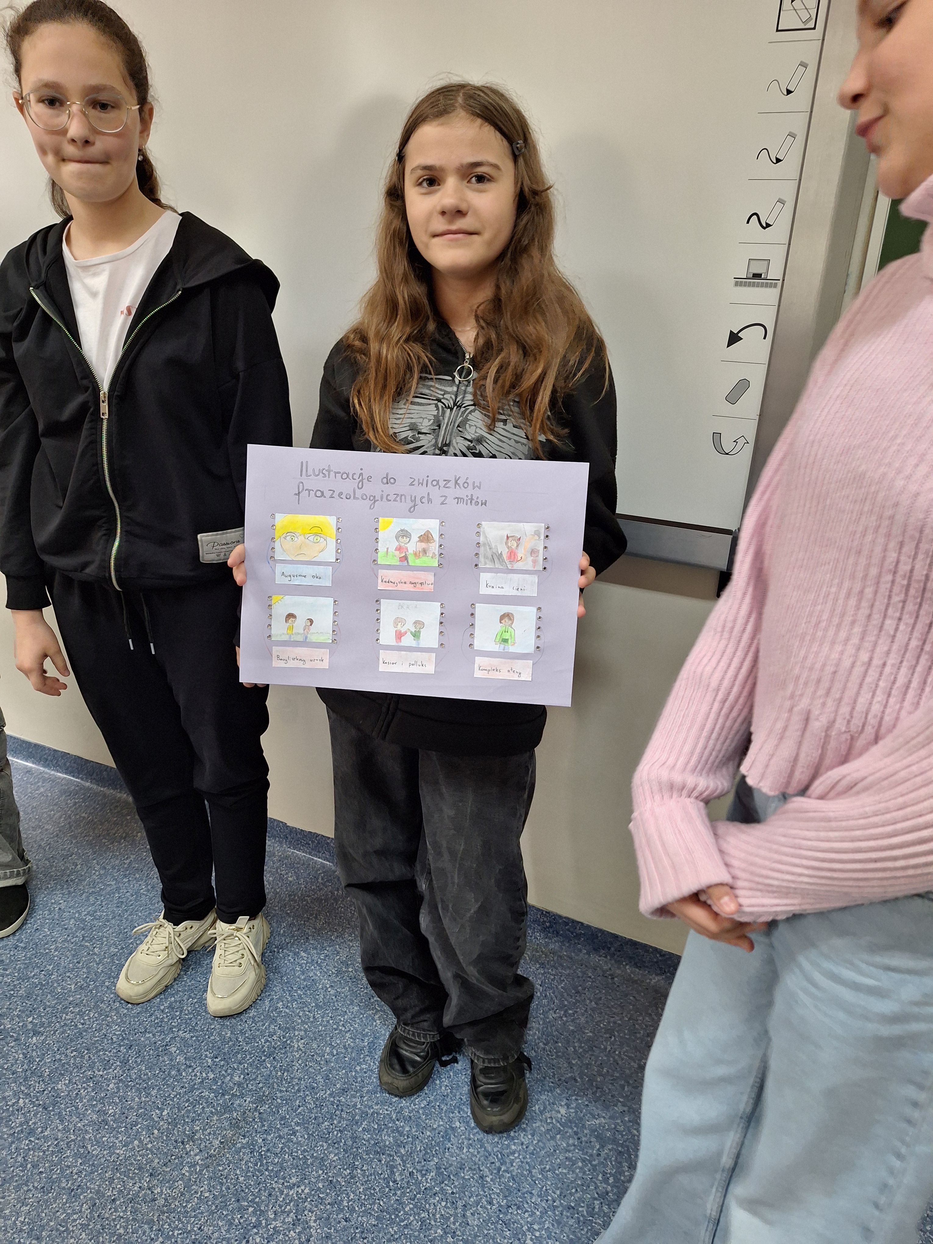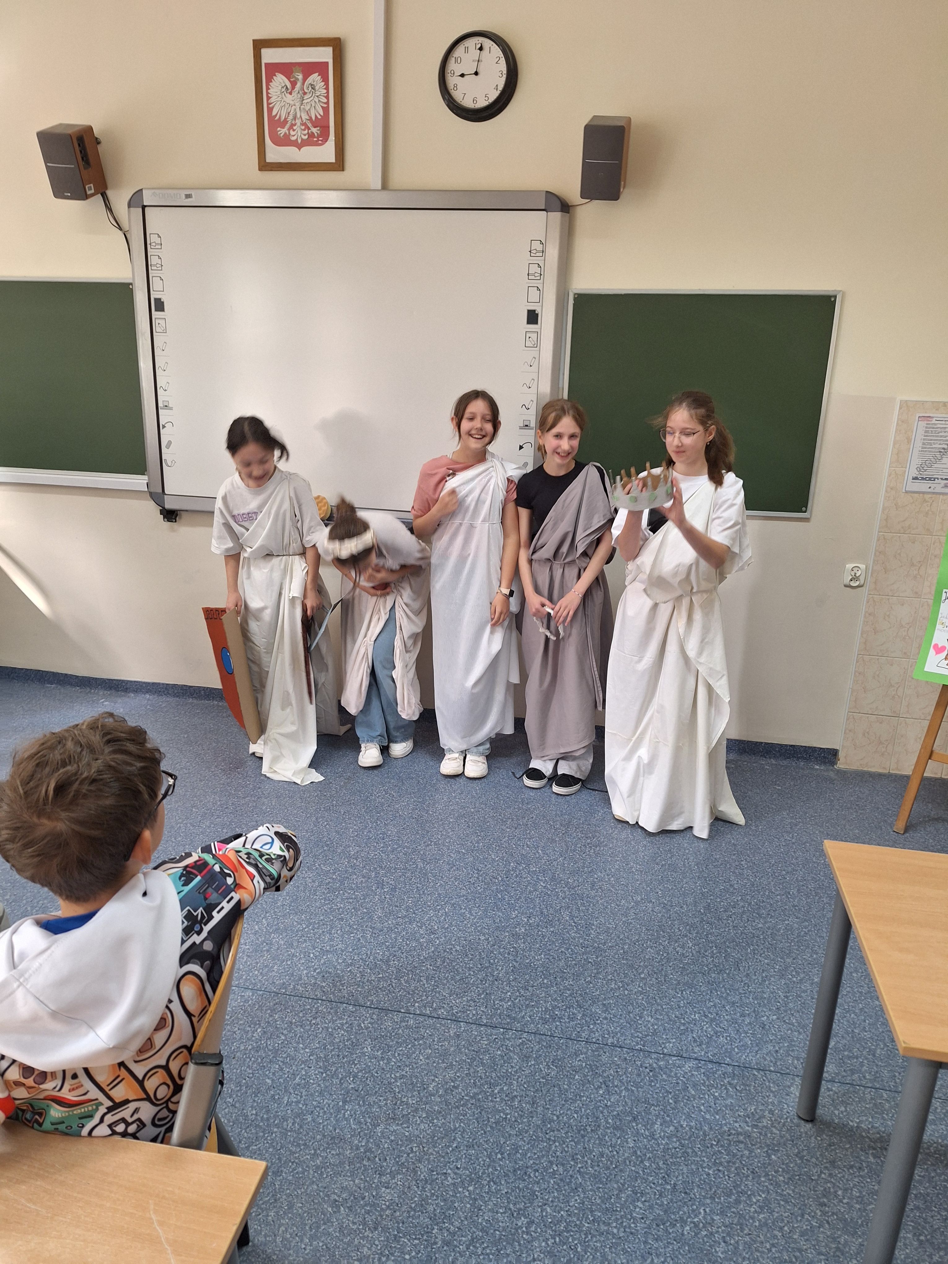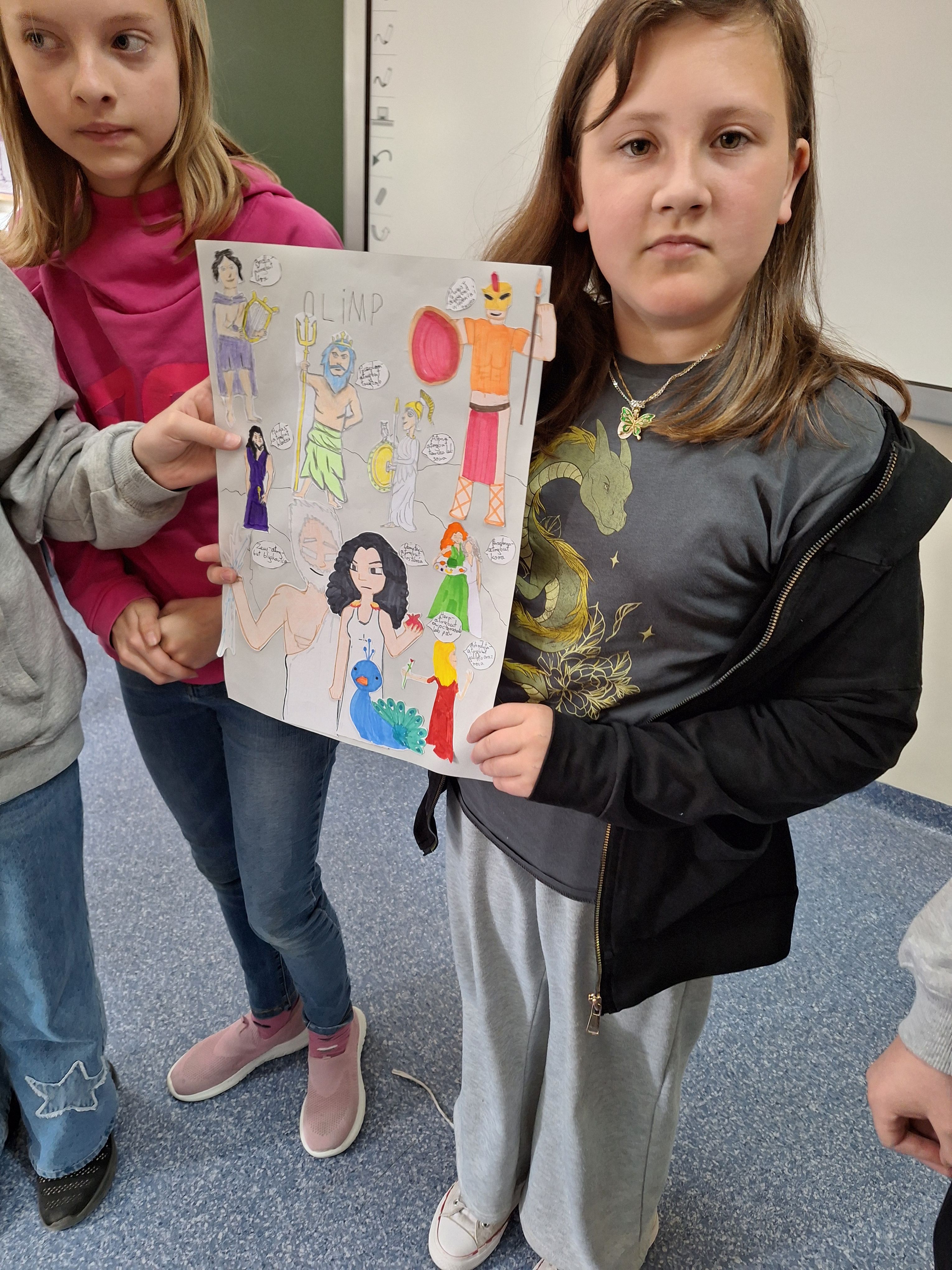Dnia 06.05.2025 r. klasa 5B zrealizowała projekt edukacyjny pod hasłem: Mitologia bez granic. Uczniowie podzieleni na 6 grup, po uprzednich konsultacjach z nauczycielem i samodzielnych przygotowaniach, przedstawili swoje projekty. Każdy z nich dotyczył mitologii, ale każdy w innej formie. Były to: