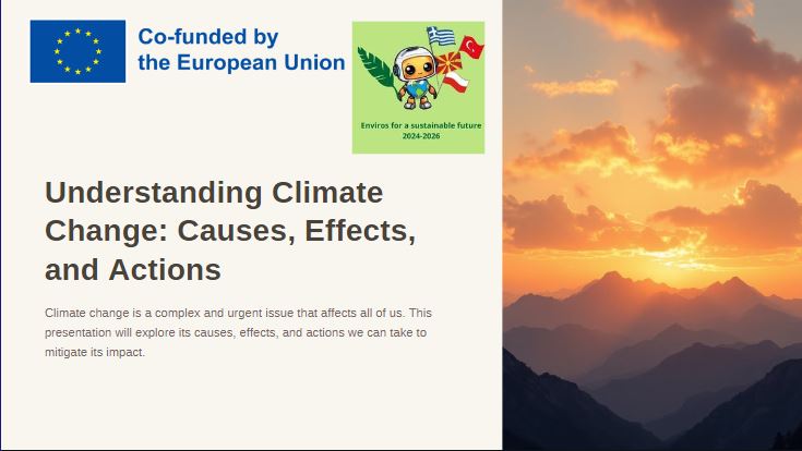 Prezentacja w przystępny sposób wyjaśnia, czym jest zmiana klimatu, jakie są jej główne przyczyny (m.in. emisje gazów cieplarnianych i wylesianie), negatywne skutki (takie jak ekstremalne zjawiska pogodowe, topnienie lodowców, zagrożenia dla zdrowia i bioróżnorodności) oraz działania, które każdy z nas może podjąć, aby ograniczyć jej wpływ – od oszczędzania energii po wspieranie zrównoważonego rozwoju. Celem prezentacji jest zwiększenie świadomości i zachęcenie do proekologicznej postawy.