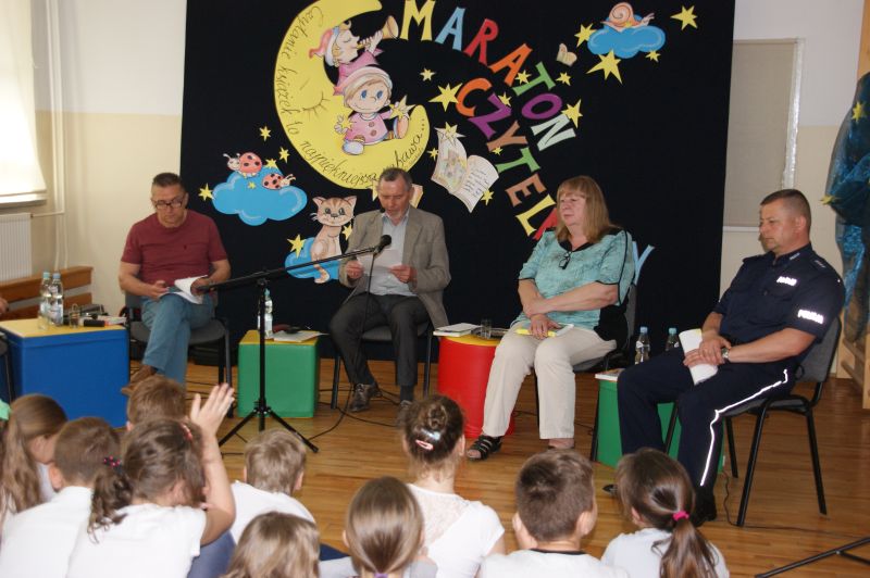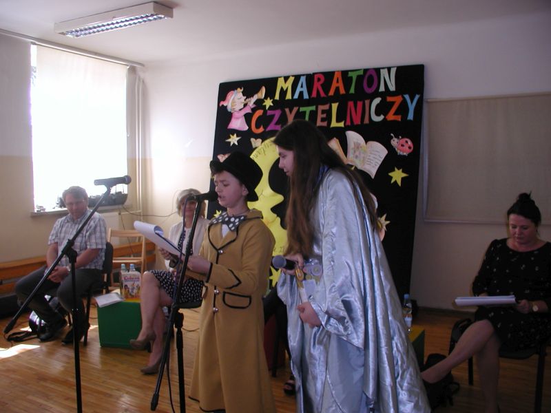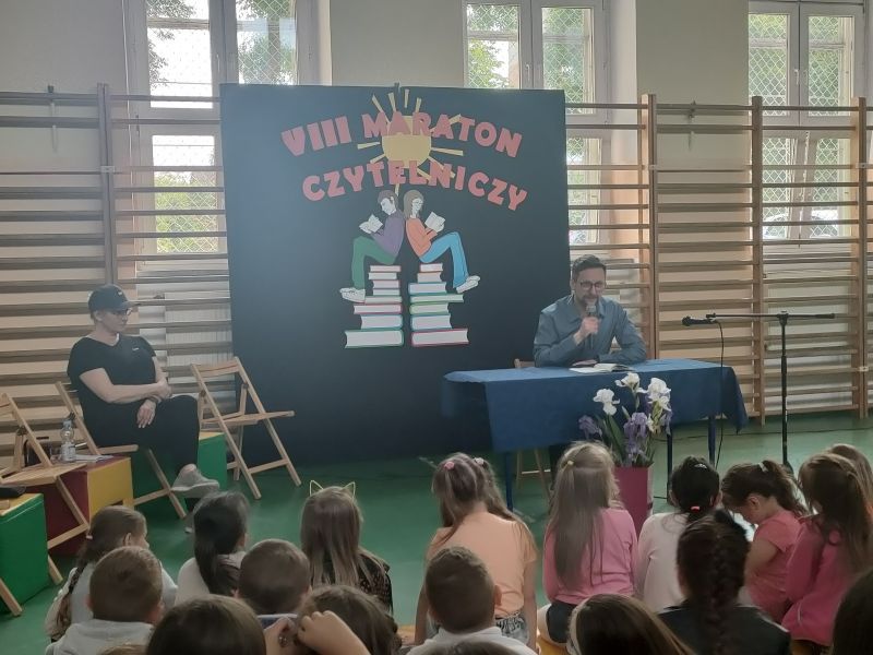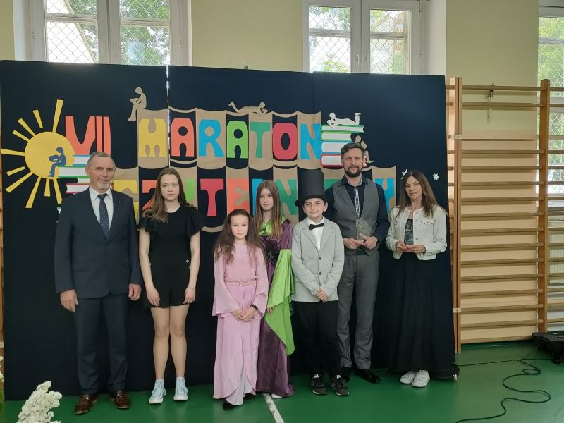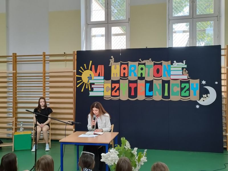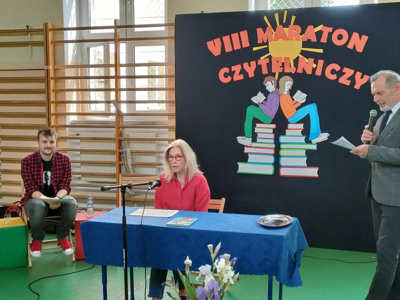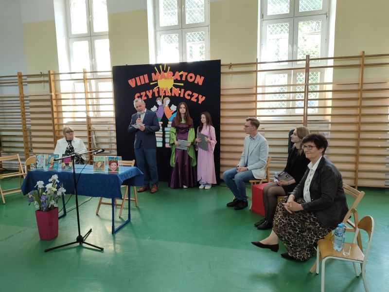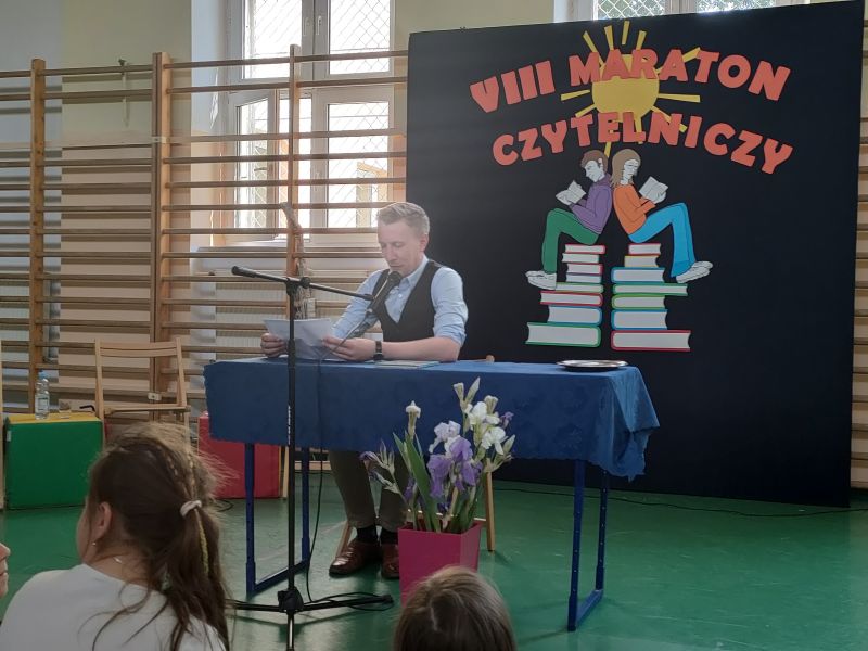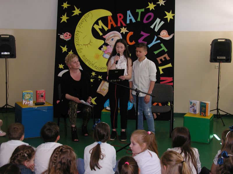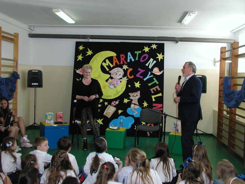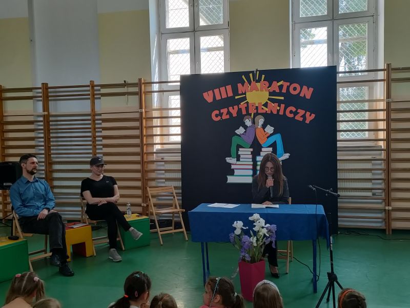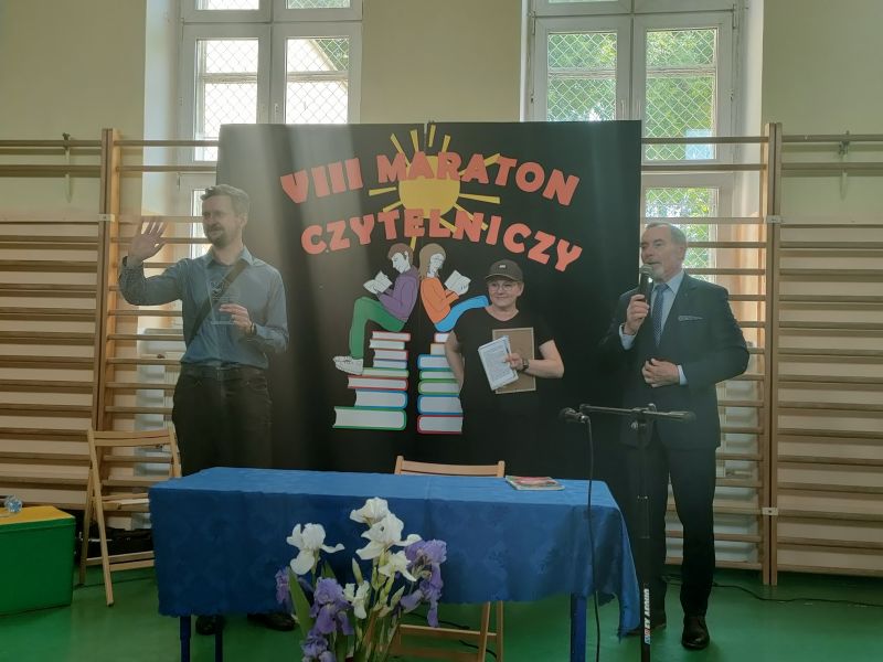 · Po odczytaniu przez gości przygotowanych fragmentów wybrani uczniowie zadają pytania i zagadki obecnym na Maratonie uczniom. Za poprawną odpowiedź wręczane są drobne upominki.