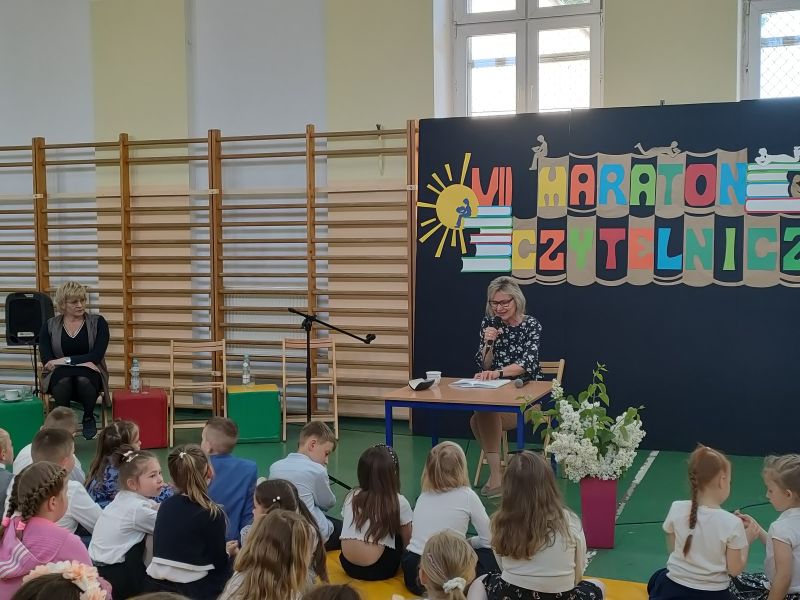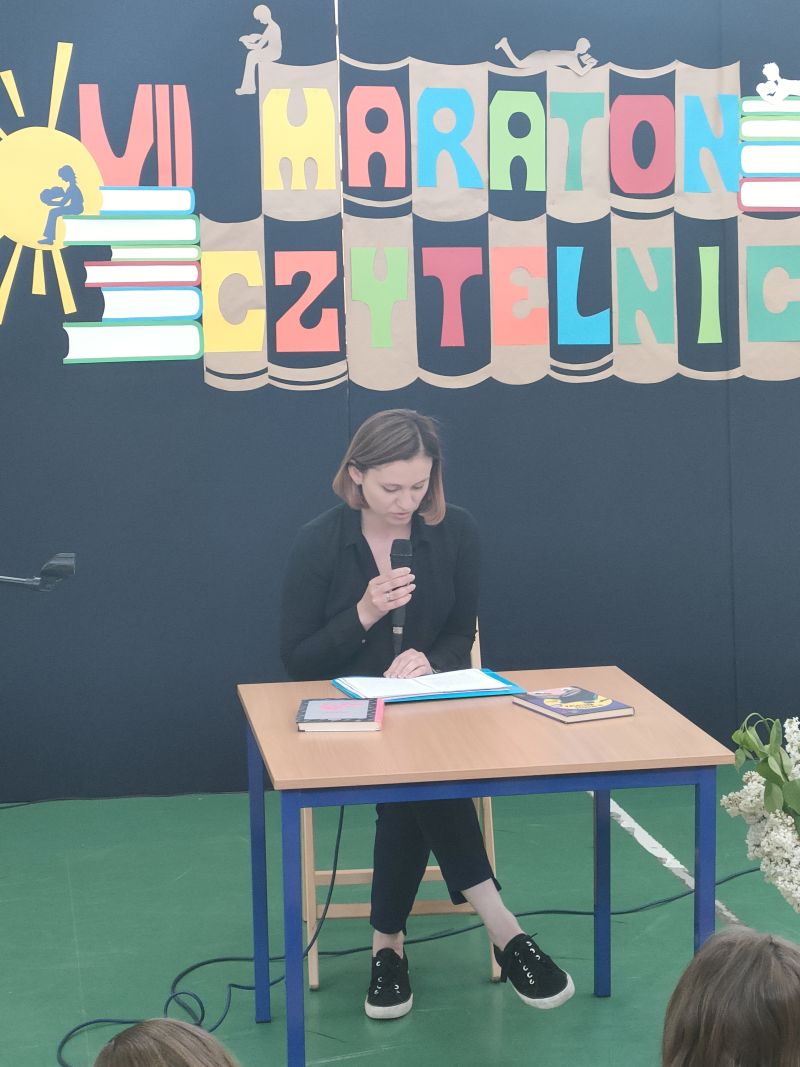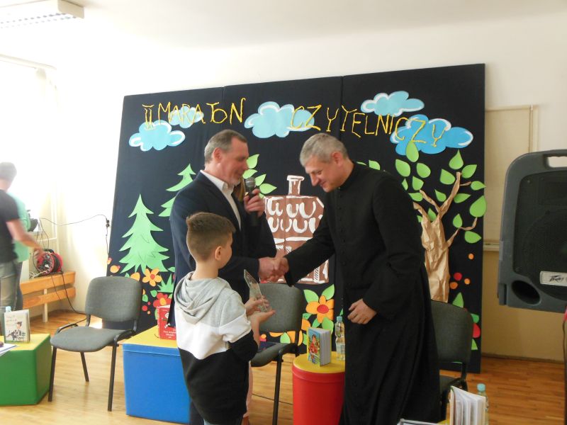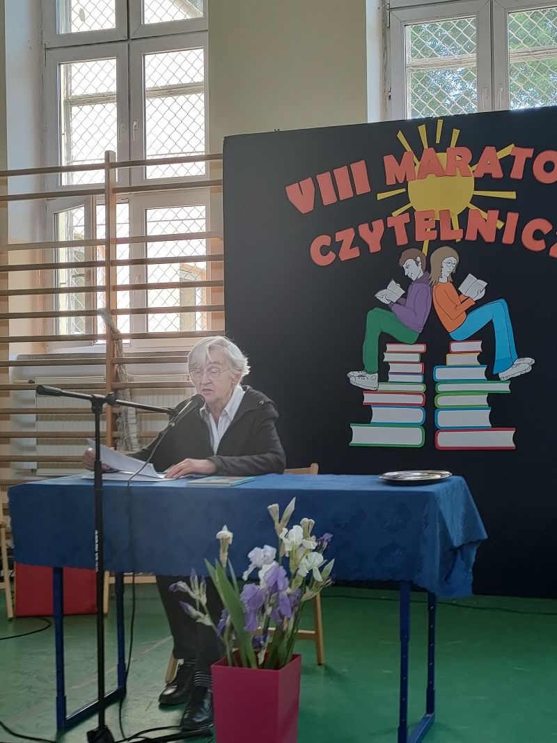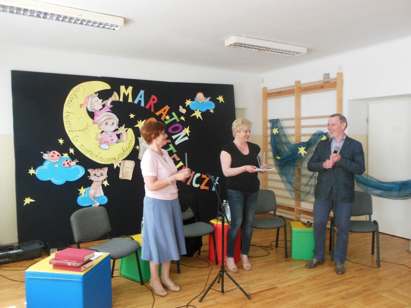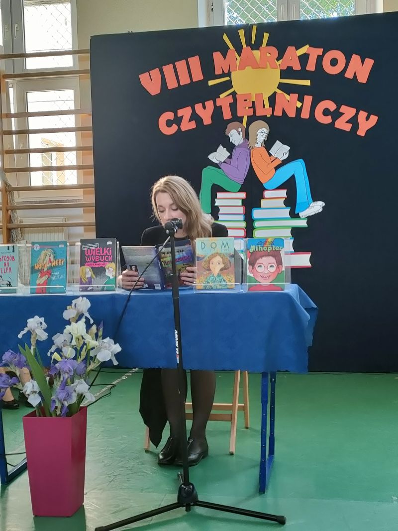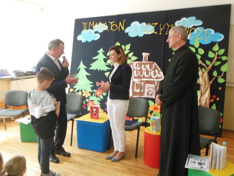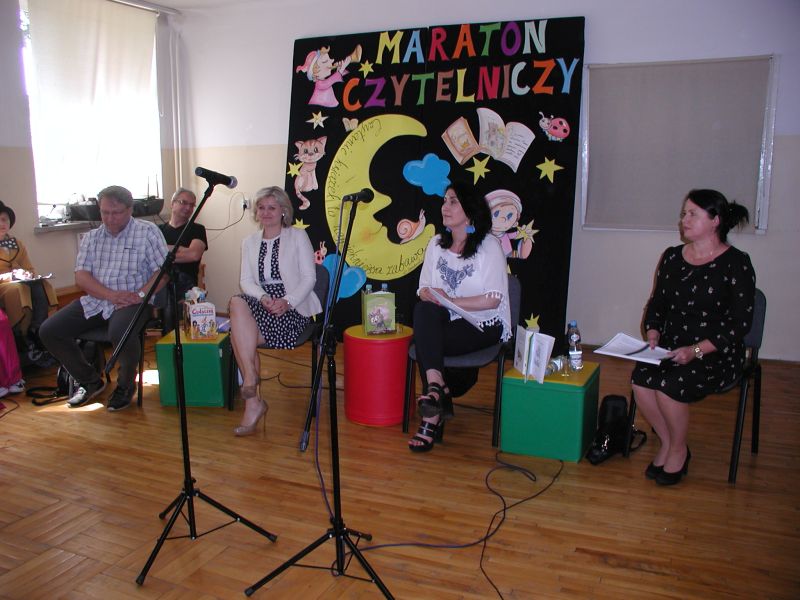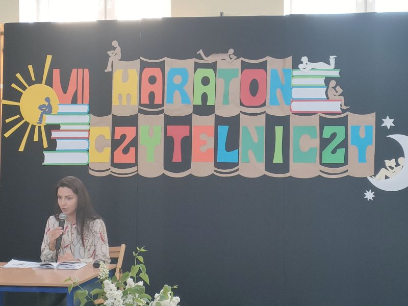 · Po odczytaniu przez gości przygotowanych fragmentów wybrani uczniowie zadają pytania i zagadki obecnym na Maratonie uczniom. Za poprawną odpowiedź wręczane są drobne upominki.
