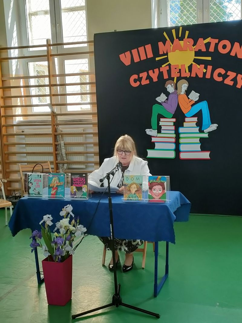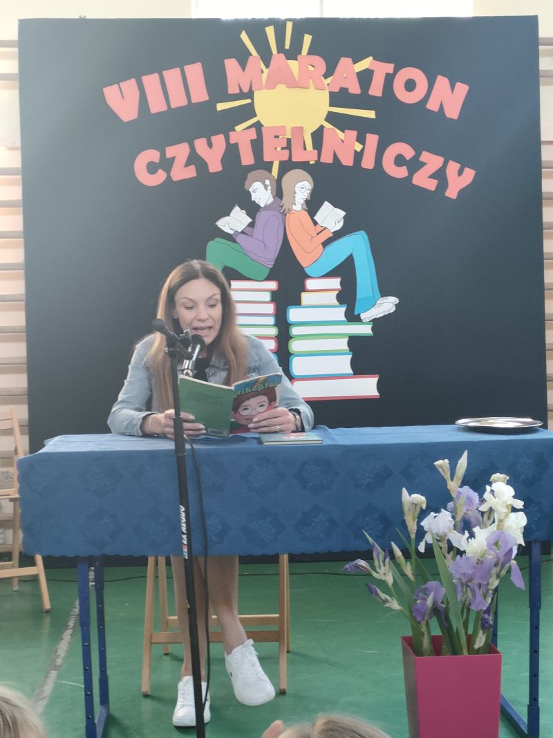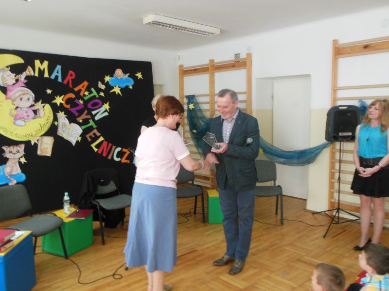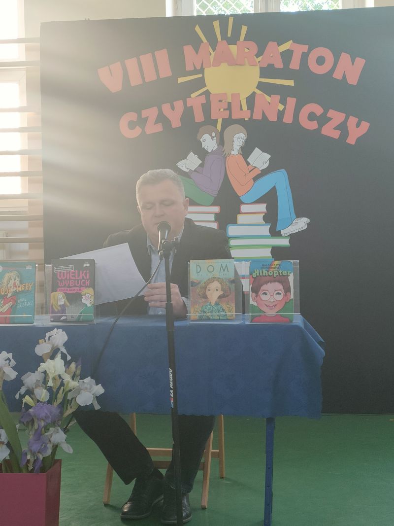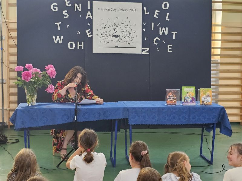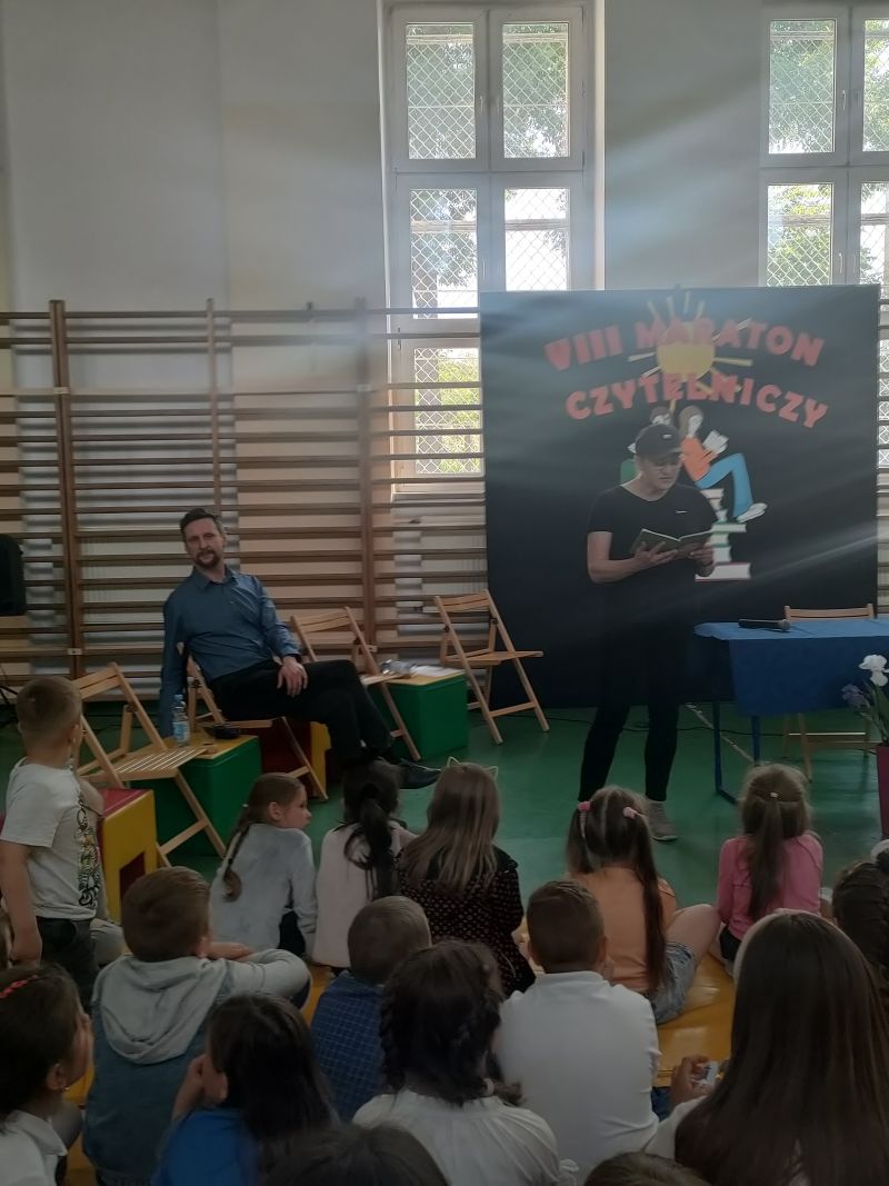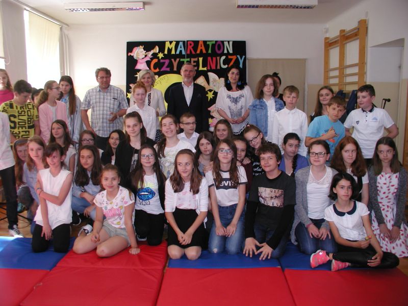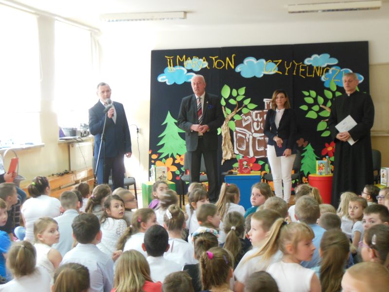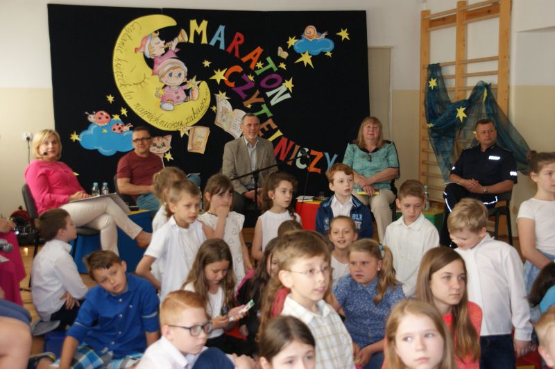 · Po odczytaniu przez gości przygotowanych fragmentów wybrani uczniowie zadają pytania i zagadki obecnym na Maratonie uczniom. Za poprawną odpowiedź wręczane są drobne upominki.