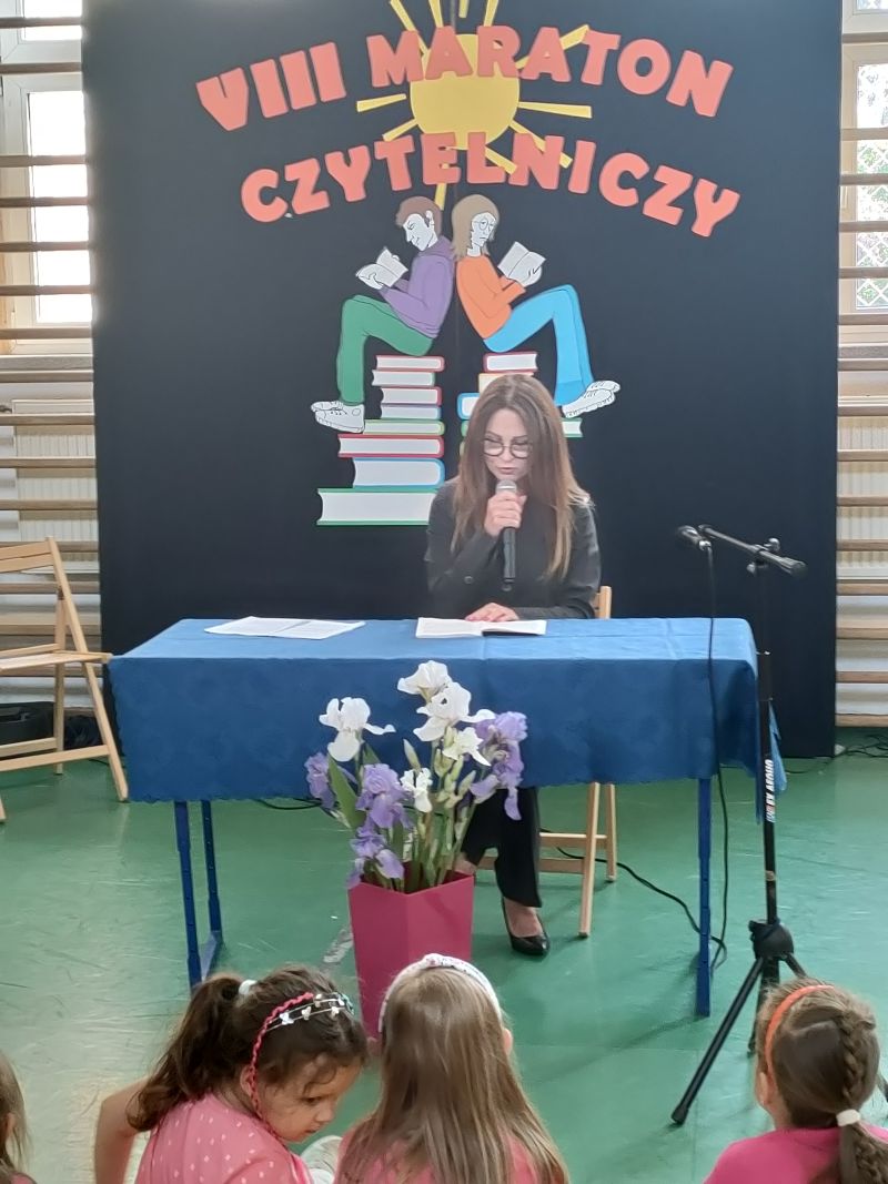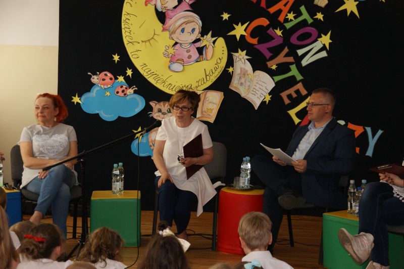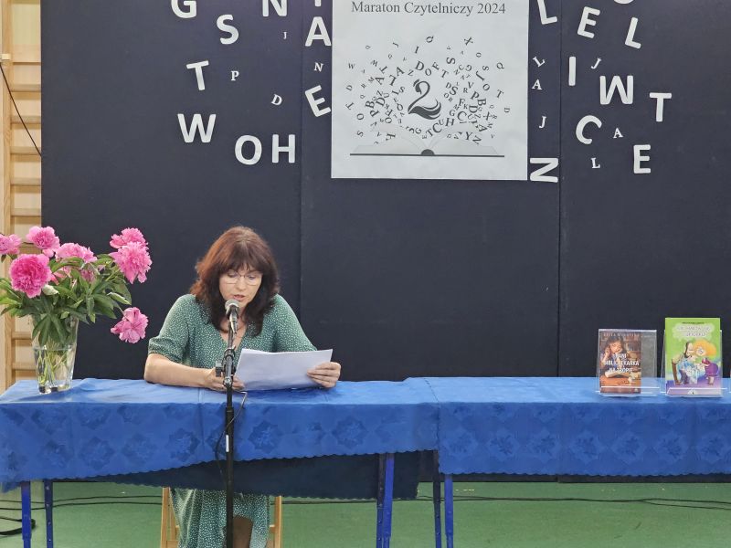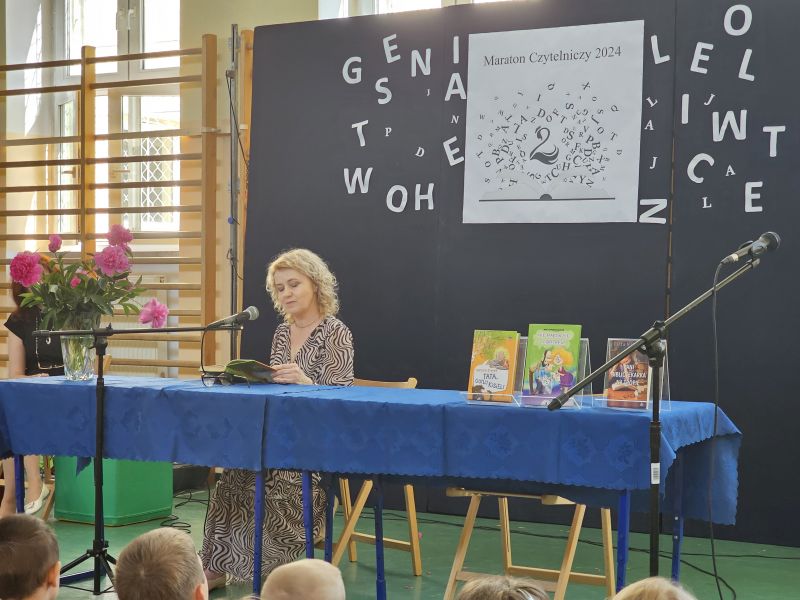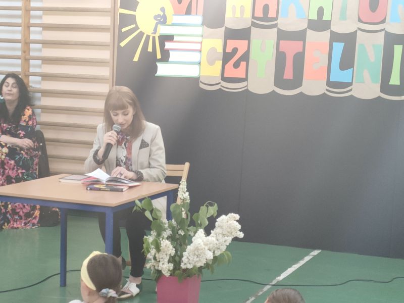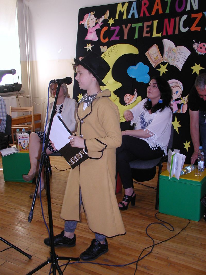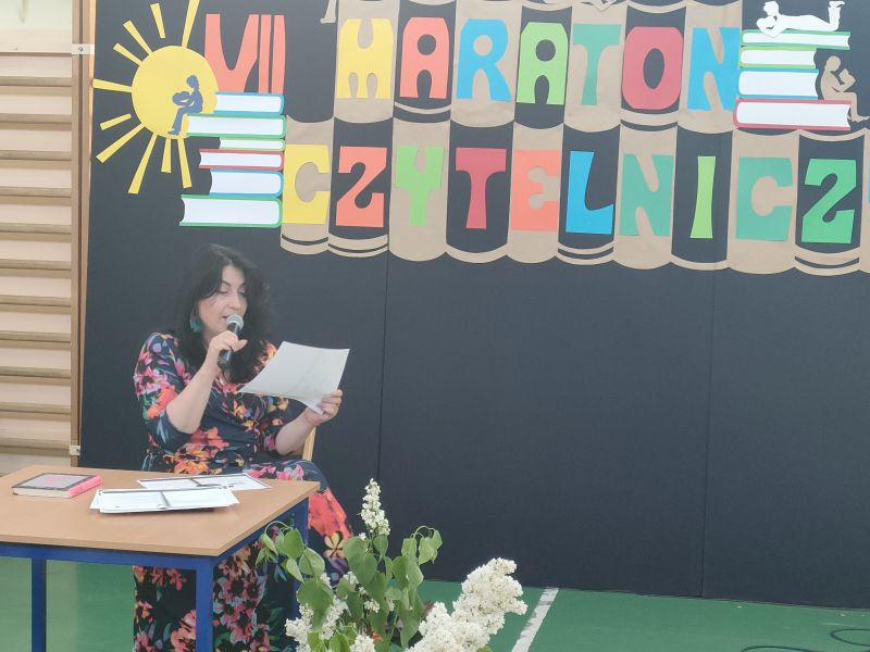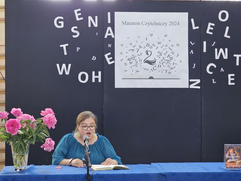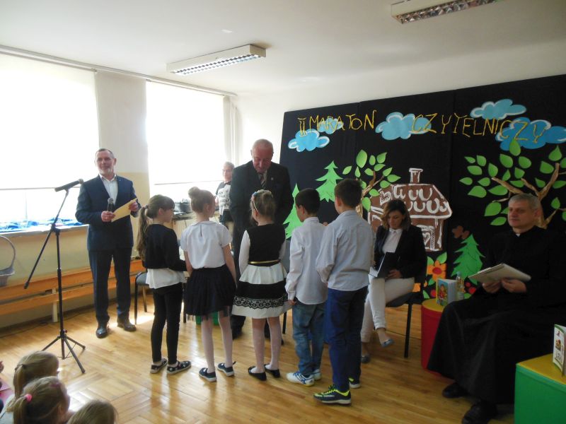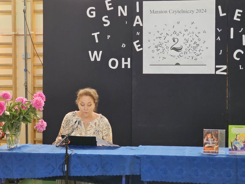 · Po odczytaniu przez gości przygotowanych fragmentów wybrani uczniowie zadają pytania i zagadki obecnym na Maratonie uczniom. Za poprawną odpowiedź wręczane są drobne upominki.